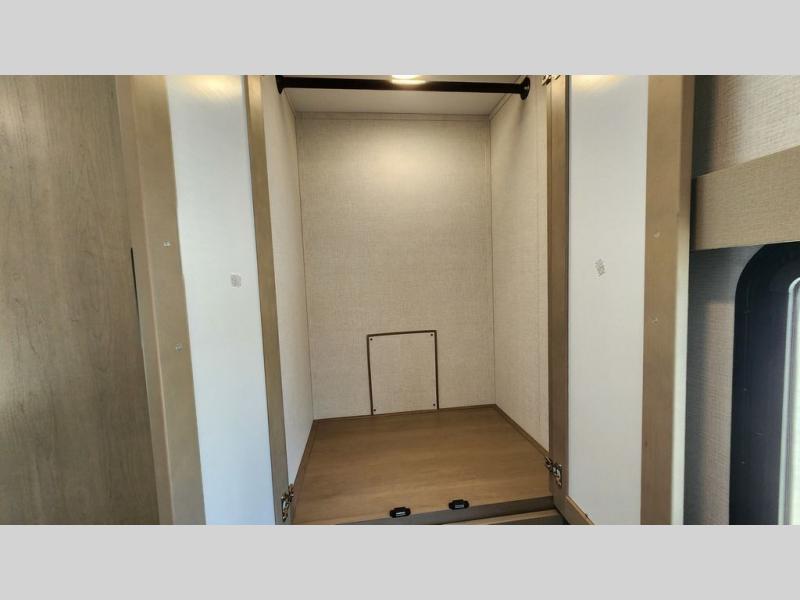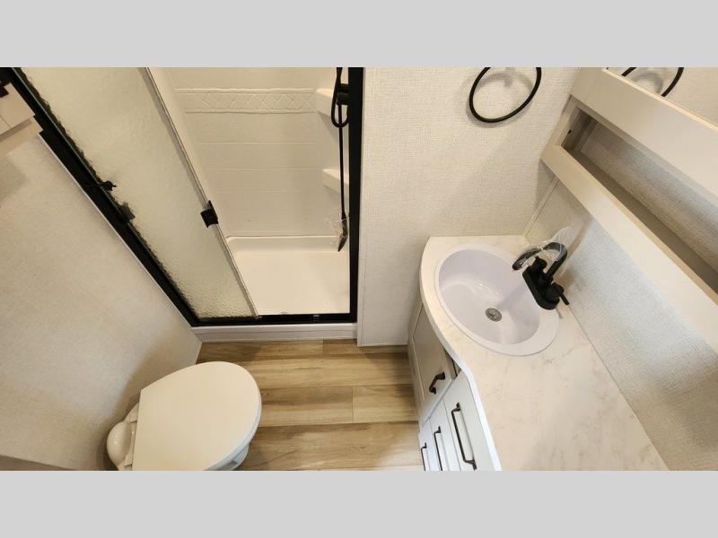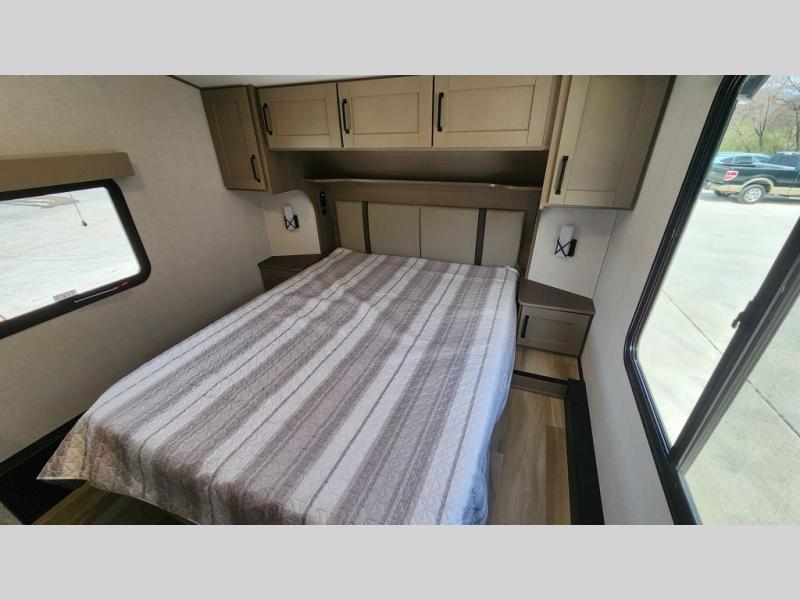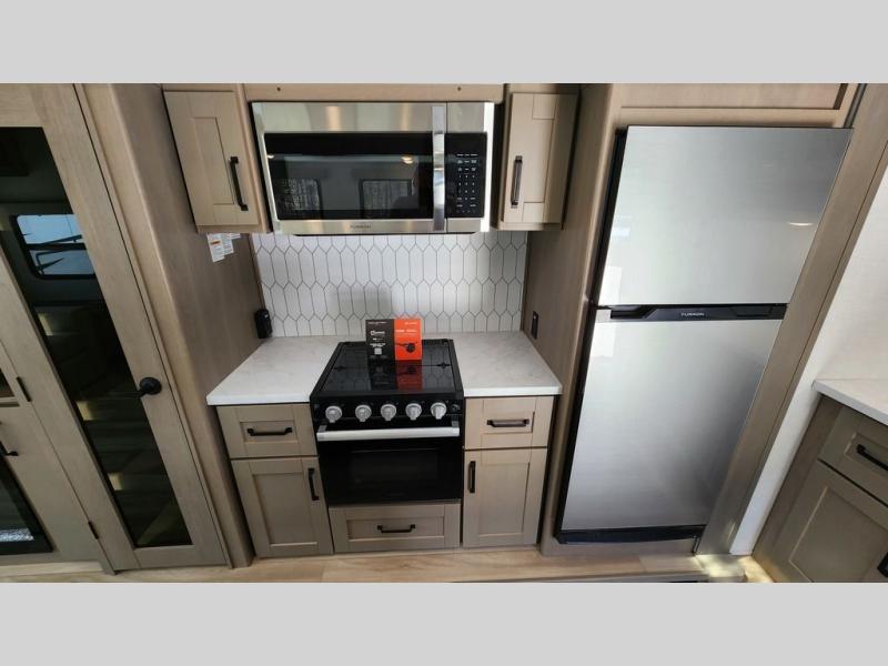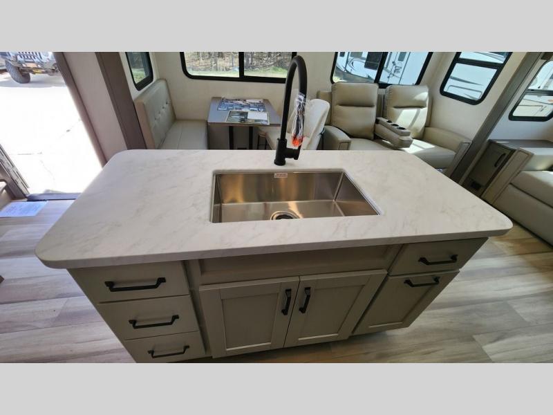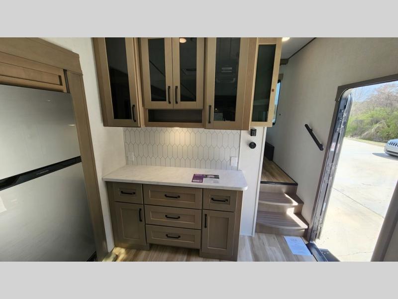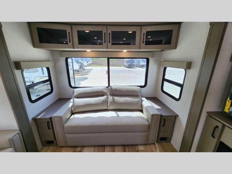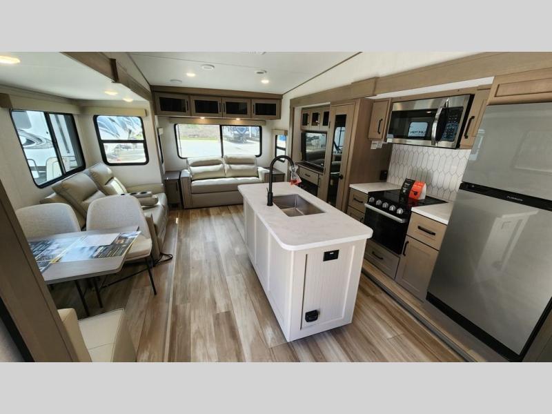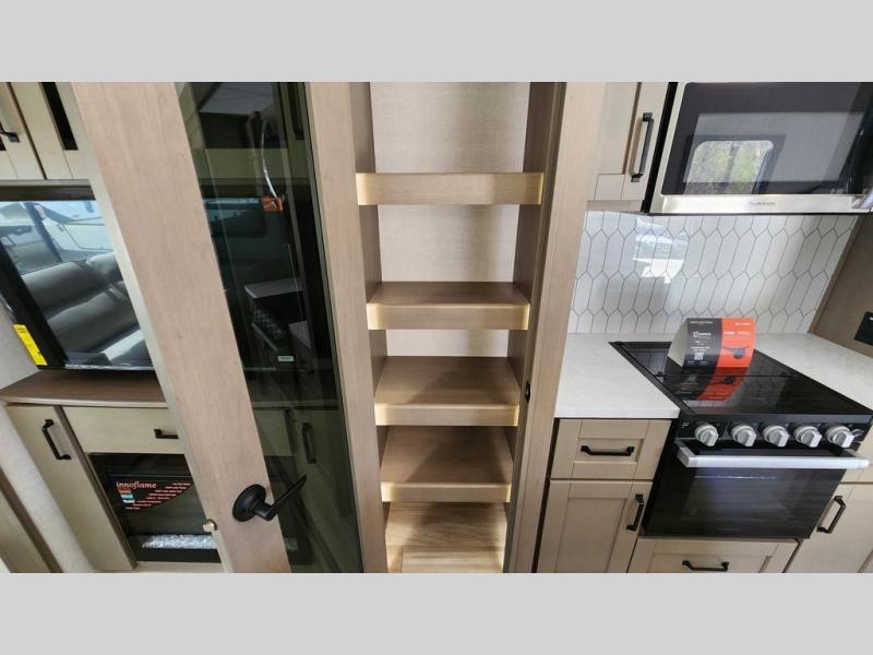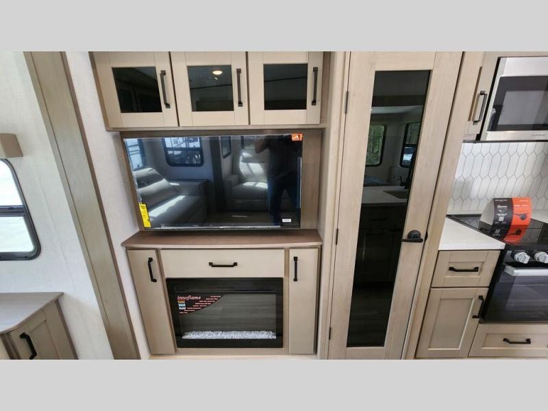Get ready to enjoy everything the campgrounds and surrounding area has to offer when you are setup to camp in this fifth wheel! The two electric awnings offer protected areas creating outdoor living spaces; just grab your camping chairs from the unobstructed pass-through storage. And the interior offers a spacious living area and kitchen combination with dual opposing slides for maximum space. You can sit on the tri-fold sofa or the booth dinette with an option for a swivel dinette. The hutch and kitchen island offer counter space to prepare and serve meals, and there is a large pantry for goodies. The 40" LED HDTV with a fireplace below provides entertainment before bedtime or on a rainy day. And the front bedroom offers privacy, a walk-around queen bed, and plenty of storage!
