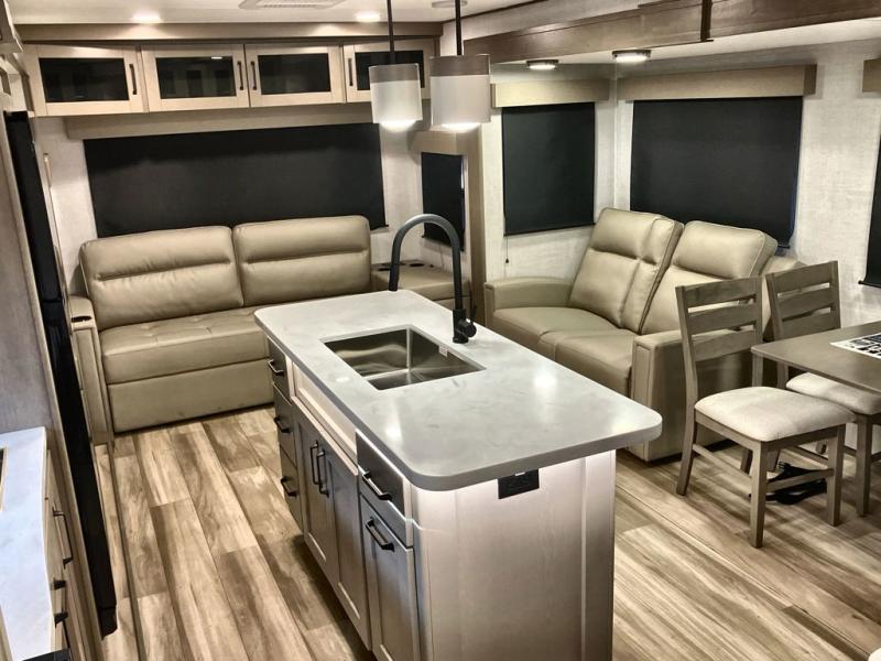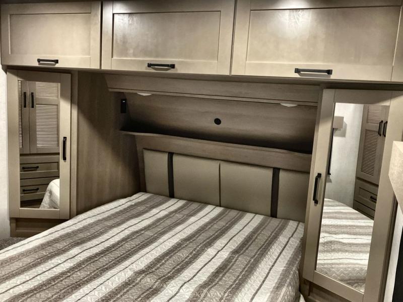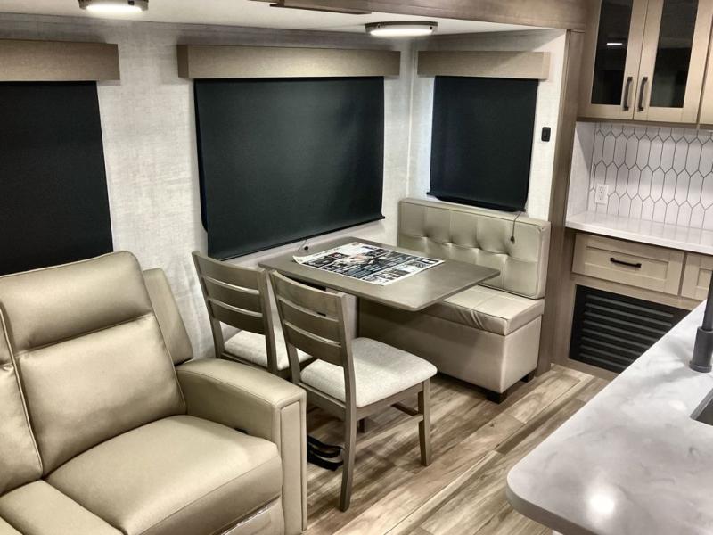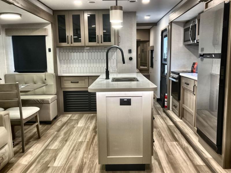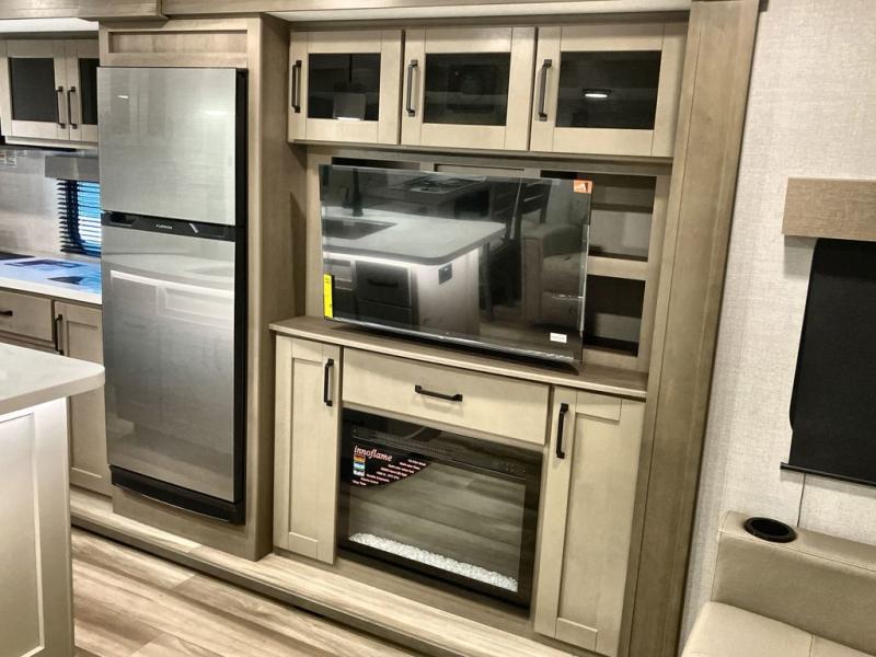 Whether you travel to explore or relax, this trailer will give you the choice depending where you park it! The kitchen amenities offer a gourmet kitchen including a 10 cu. ft. refrigerator, an island, and a hutch. You and your guests will find theater seating with cupholders, a booth dinette or optional swivel dinette, and a tri-fold sofa to sit on and visit while you watch the 40" LED HDTV with a fireplace below. The full bathroom includes a space saving sliding door and linen storage, and the bedroom gives you a front walk-around queen bed with storage for your clothes on each side, plus there is an additional wardrobe with drawers for even more storage!