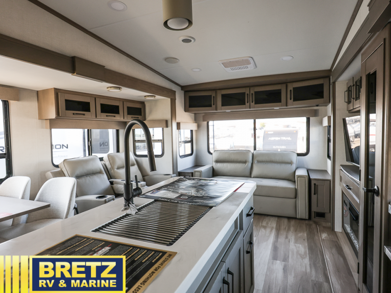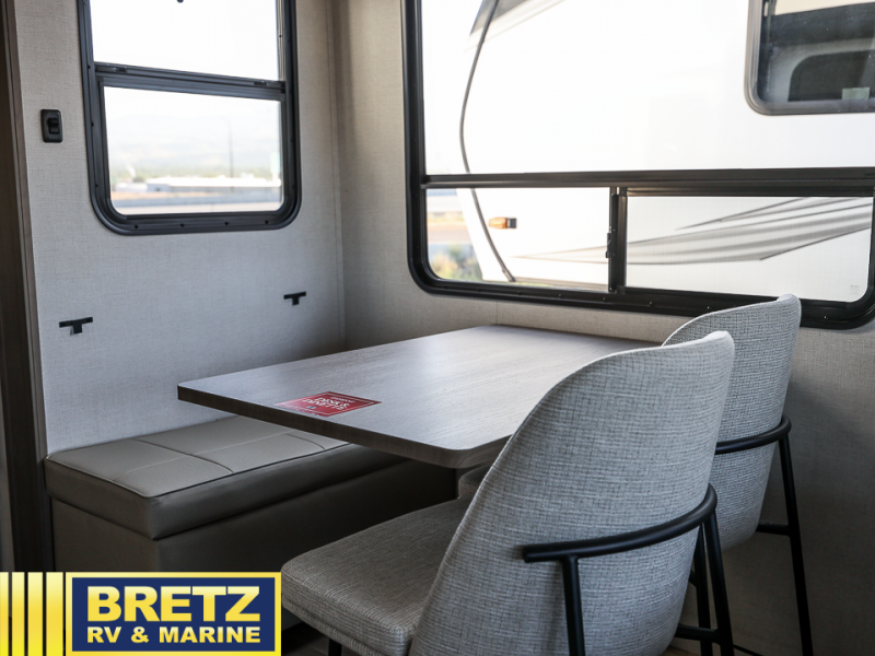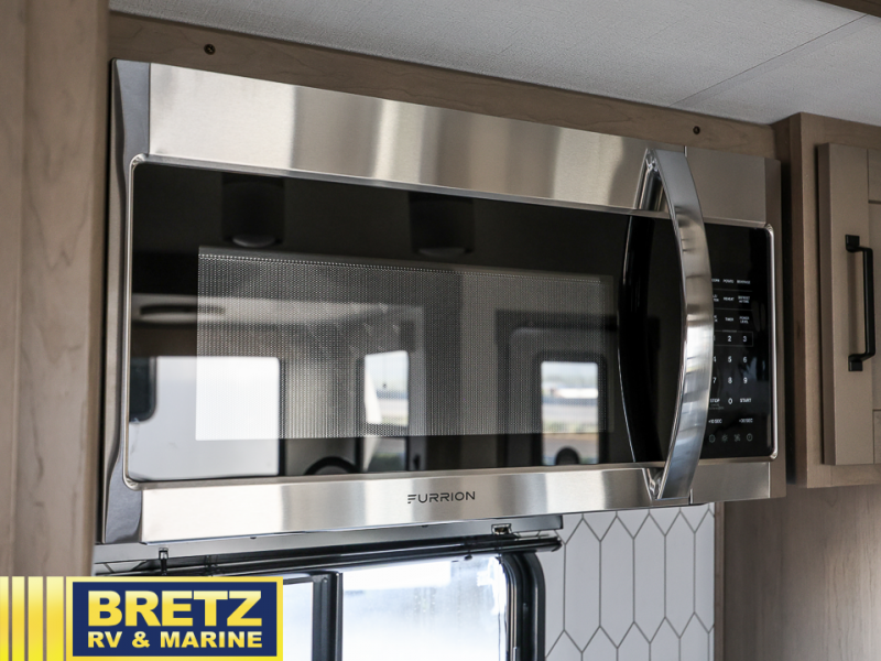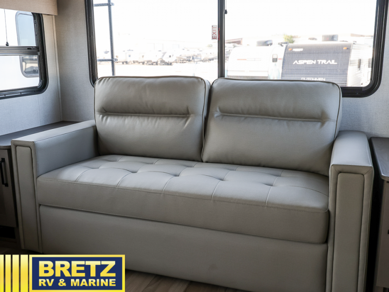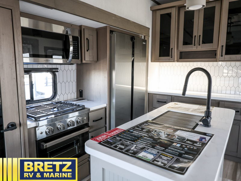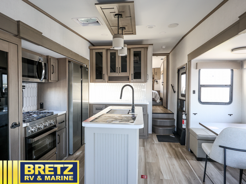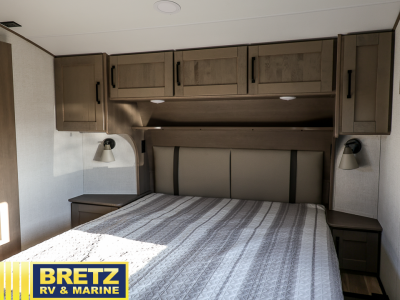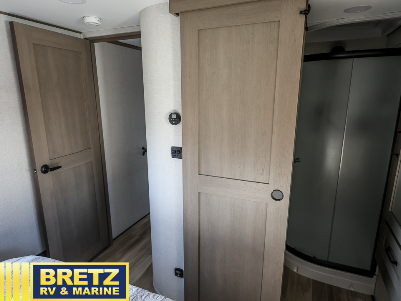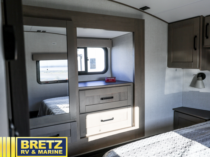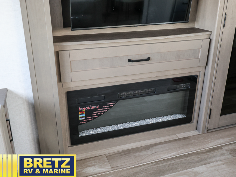 Whether you travel for pleasure or work, you will love the spacious main living and kitchen area with a rear tri-fold sofa that doubles as extra sleeping space, and the theater seating directly across from the entertainment center with a 40" LED HDTV and a fireplace below. The kitchen island will make meal prepping and drying the dishes easier and the hutch is the perfect place to place your picture frames, nice dishes, and extra cooking items. There is even a pantry that is big enough to store all of your favorite snacks, dry ingredients and such. Outside you can enjoy two electric awnings that provide protection from the elements as you relax and visit with other RVers, and your camping chairs can easily be stored in the pass-through compartment. The double entry bathroom is convenient especially at night when you can slide the door to enter from the front master bedroom. You will find plenty of storage for your clothing and gear, plus the bedroom slide out gives you drawers and linen storage that stretches into the full bathroom.