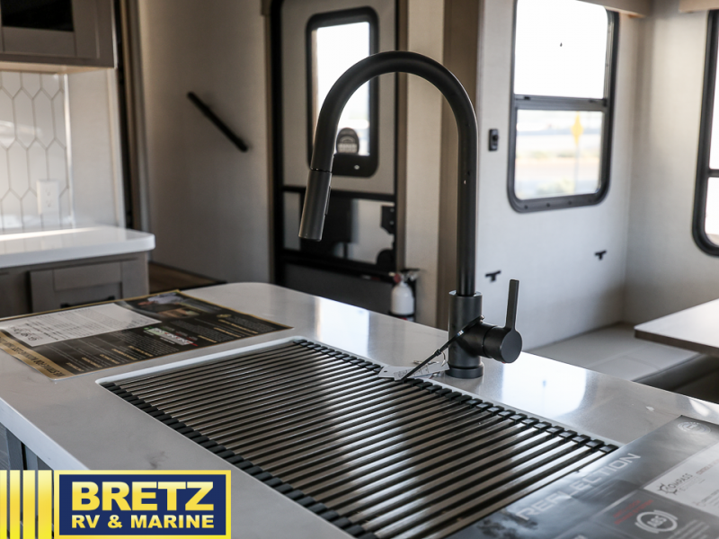 With any Reflection fifth wheel by Grand Design, you will have a solar panel for off-grid camping and a 60 amp charge controller and inverter prep, a Universal All-In-One docking station, unobstructed pass-through storage, and Goodyear Endurance tires. Each is constructed of gel coat exterior sidewalls, residential 5" truss rafters, walk-on roof decking, a fiberglass and radiant foil roof and front cap insulation plus laminated aluminum framed side walls, roof and end walls in slide rooms. Head inside to enjoy residential hardwood cabinet doors, premium Congoleum flooring, a spacious shower with a glass door, and many more comforts!