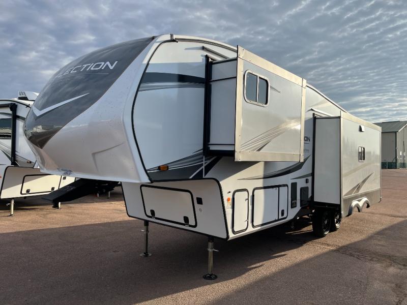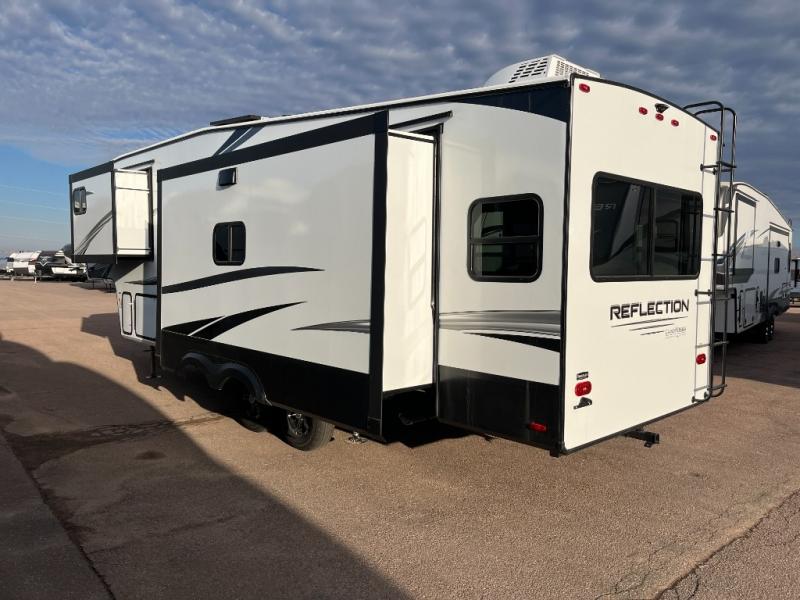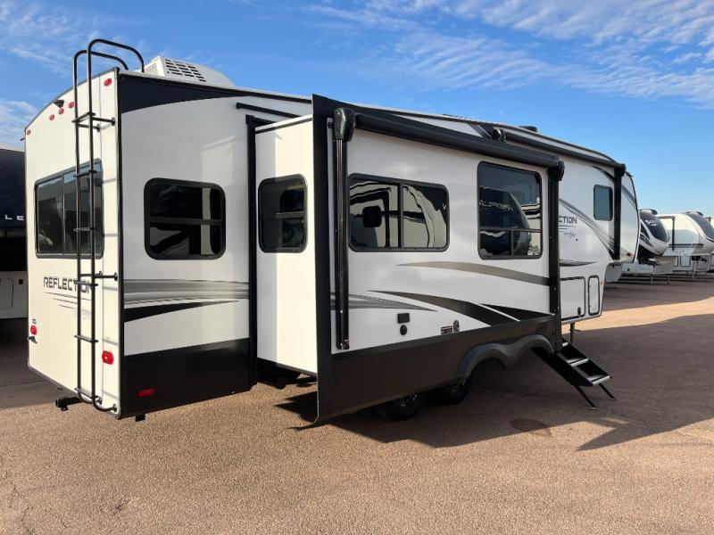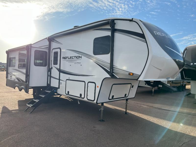 With any Reflection fifth wheel by Grand Design, you will have a solar panel for off-grid camping and a 60 amp charge controller and inverter prep, a Universal All-In-One docking station, unobstructed pass-through storage, and Goodyear Endurance tires. Each is constructed of gel coat exterior sidewalls, residential 5" truss rafters, walk-on roof decking, a fiberglass and radiant foil roof and front cap insulation plus laminated aluminum framed side walls, roof and end walls in slide rooms. Head inside to enjoy residential hardwood cabinet doors, premium Congoleum flooring, a spacious shower with a glass door, and many more comforts!