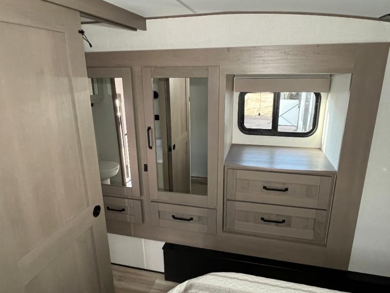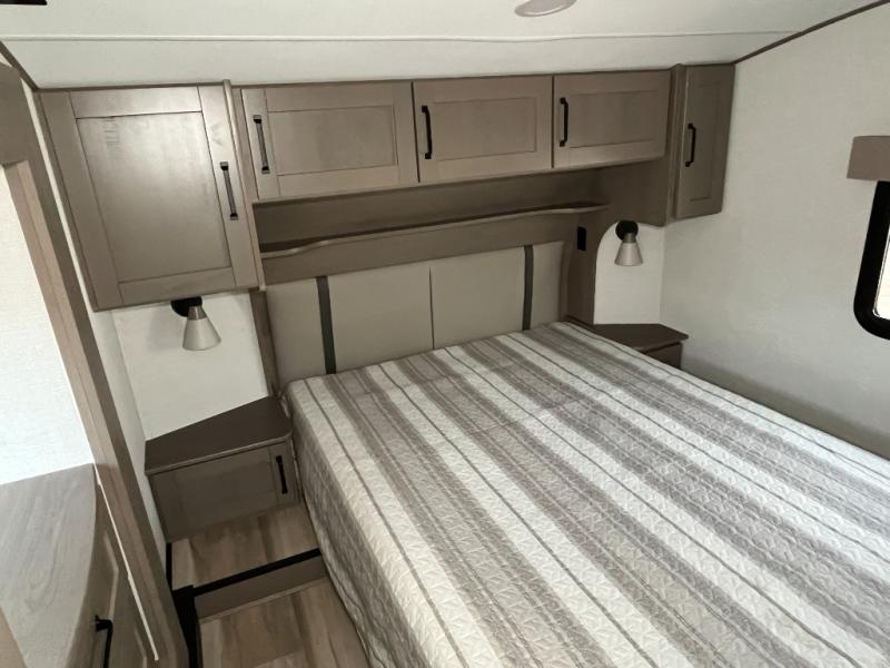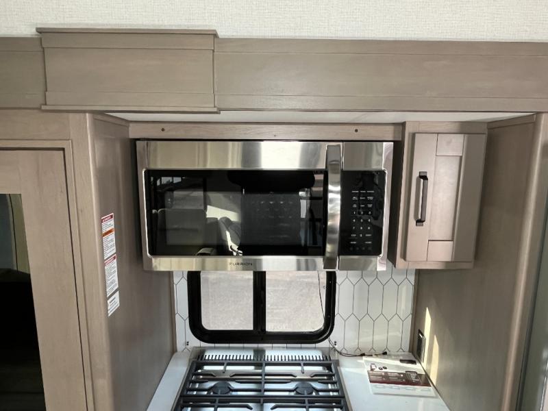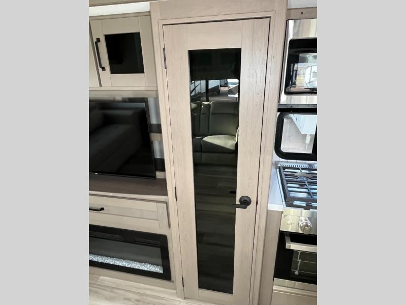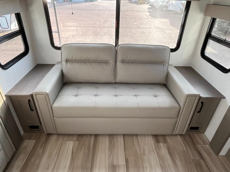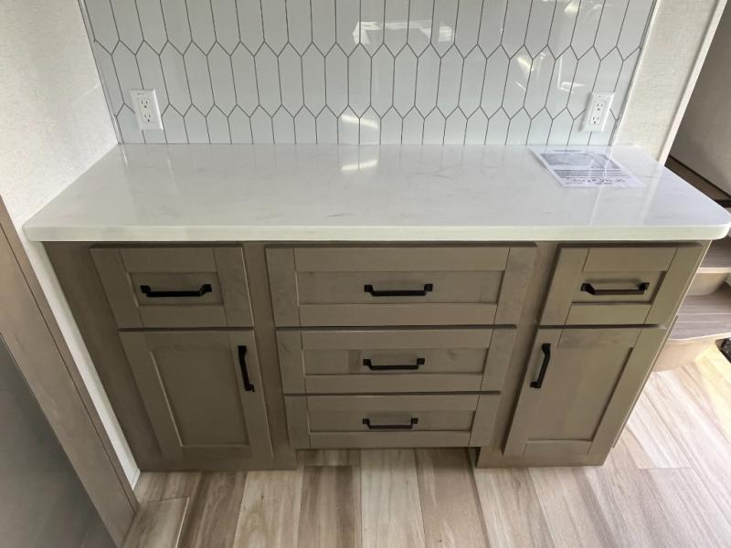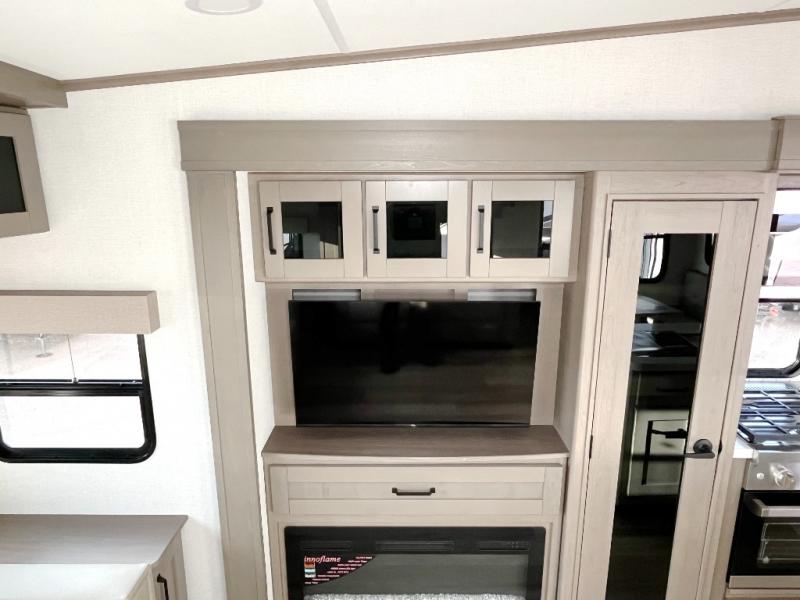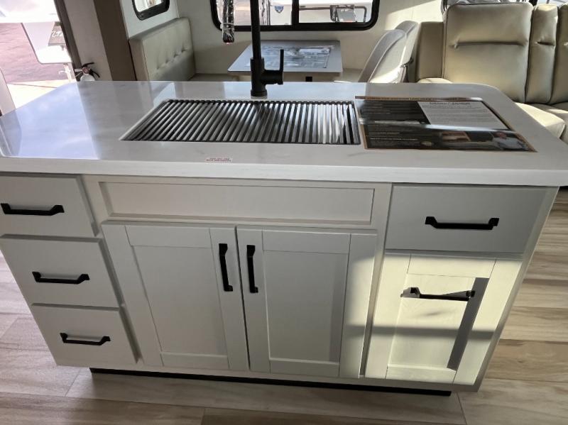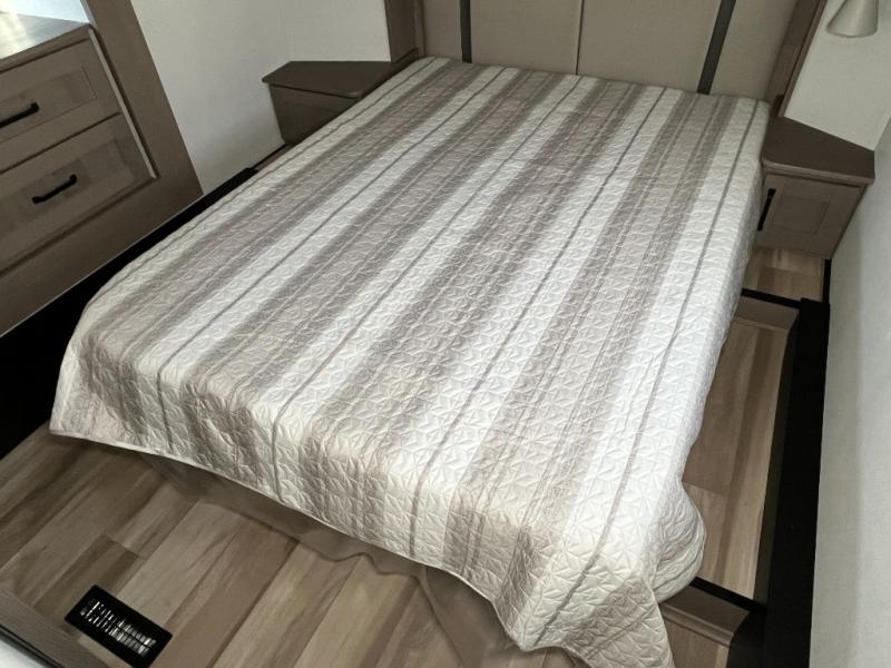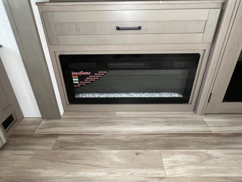 Whether you travel for pleasure or work, you will love the spacious main living and kitchen area with a rear tri-fold sofa that doubles as extra sleeping space, and the theater seating directly across from the entertainment center with a 40" LED HDTV and a fireplace below. The kitchen island will make meal prepping and drying the dishes easier and the hutch is the perfect place to place your picture frames, nice dishes, and extra cooking items. There is even a pantry that is big enough to store all of your favorite snacks, dry ingredients and such. Outside you can enjoy two electric awnings that provide protection from the elements as you relax and visit with other RVers, and your camping chairs can easily be stored in the pass-through compartment. The double entry bathroom is convenient especially at night when you can slide the door to enter from the front master bedroom. You will find plenty of storage for your clothing and gear, plus the bedroom slide out gives you drawers and linen storage that stretches into the full bathroom.