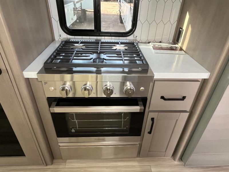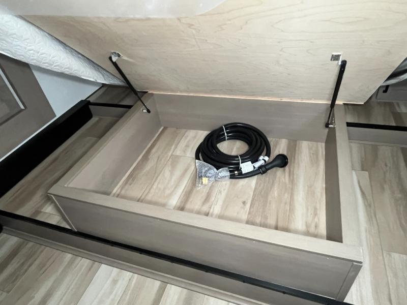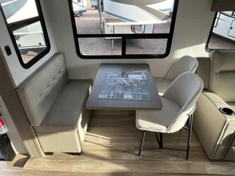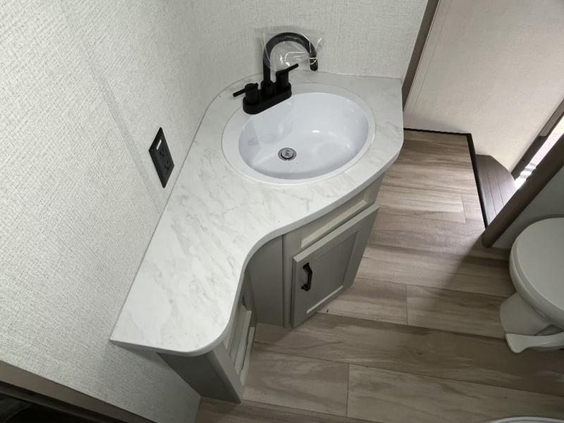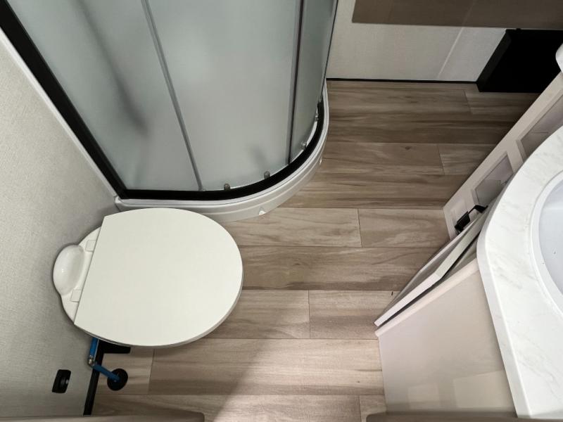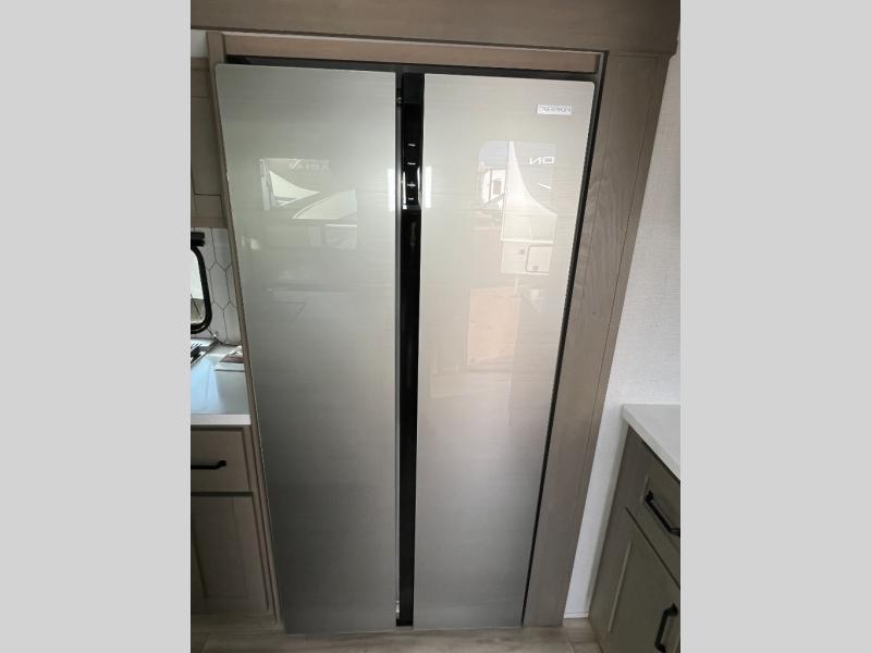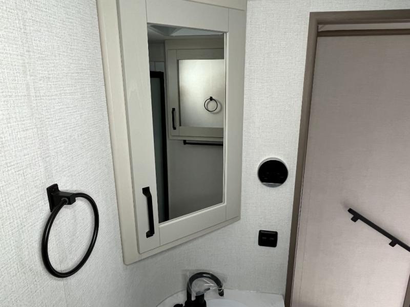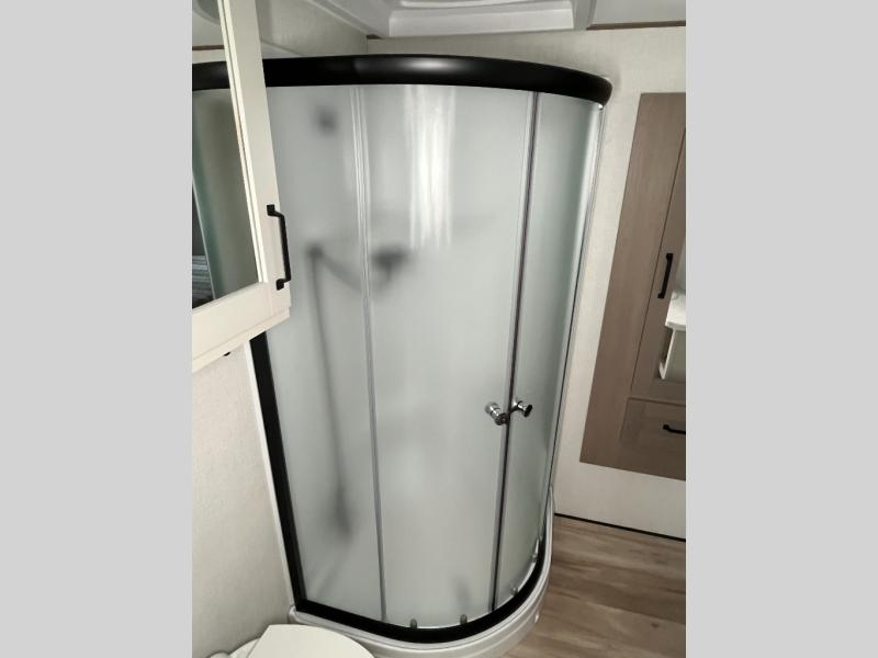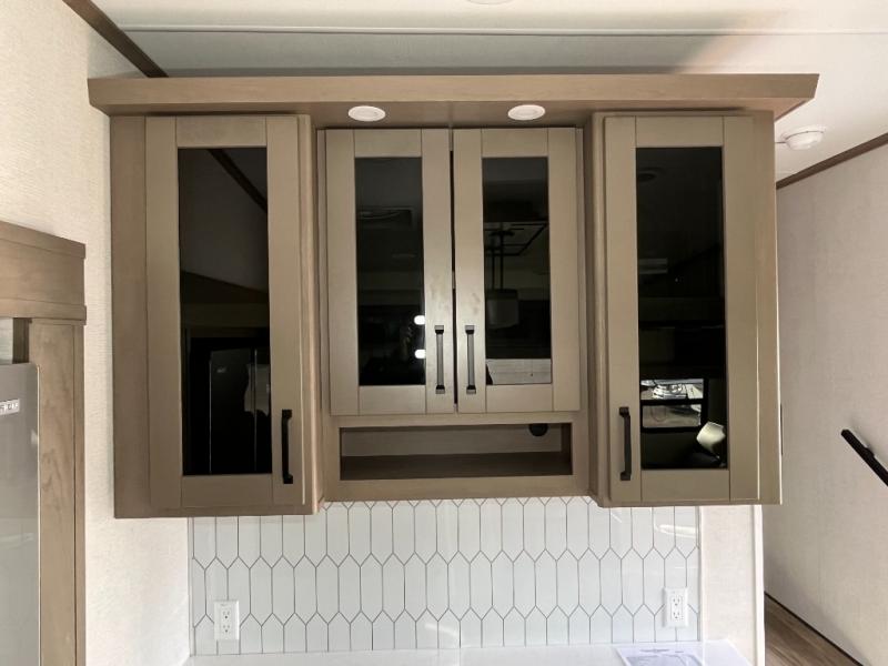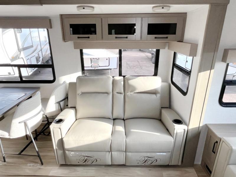 Whether you travel for pleasure or work, you will love the spacious main living and kitchen area with a rear tri-fold sofa that doubles as extra sleeping space, and the theater seating directly across from the entertainment center with a 40" LED HDTV and a fireplace below. The kitchen island will make meal prepping and drying the dishes easier and the hutch is the perfect place to place your picture frames, nice dishes, and extra cooking items. There is even a pantry that is big enough to store all of your favorite snacks, dry ingredients and such. Outside you can enjoy two electric awnings that provide protection from the elements as you relax and visit with other RVers, and your camping chairs can easily be stored in the pass-through compartment. The double entry bathroom is convenient especially at night when you can slide the door to enter from the front master bedroom. You will find plenty of storage for your clothing and gear, plus the bedroom slide out gives you drawers and linen storage that stretches into the full bathroom.
