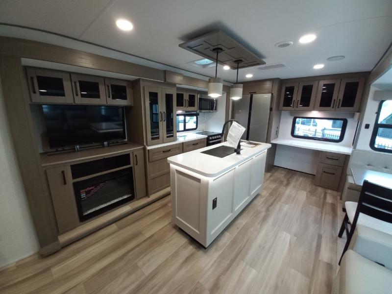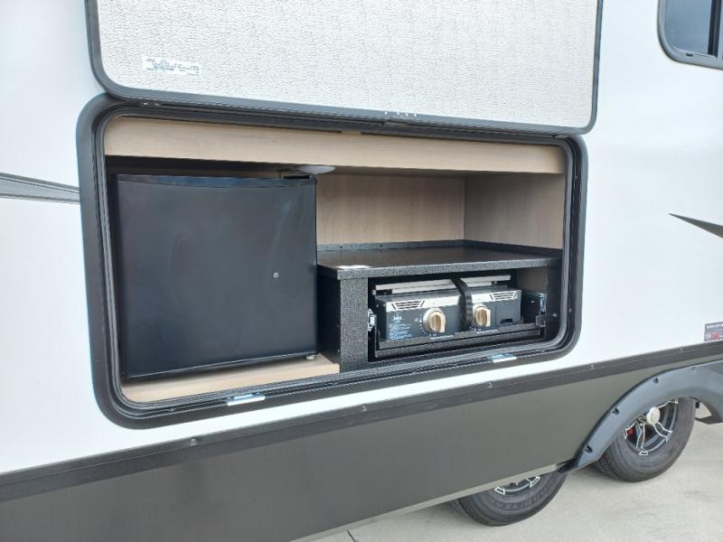 Enjoy a home away from home with this travel trailer! The chef will enjoy cooking either indoors in the rear kitchen with the kitchen island, hutch, and three burner cooktop, or outdoors with the outside griddle and outside 1.6 cu. ft. refrigerator to drink a cold beverage while grilling burgers. If mother nature rains on your parade then you can head indoors and either play games at the booth dinette or relax on the theater seating across from the entertainment center with a 40" TV and fireplace. Rinse the sand out of your hair in the full bathroom with the 30" x 36" shower then head to the front private bedroom and lay down on the queen bed slide which can be replace for an optional king bed. Keep your clothes clean with the prepped washer and dryer area and watch the big game outdoors with the coax TV hookup!