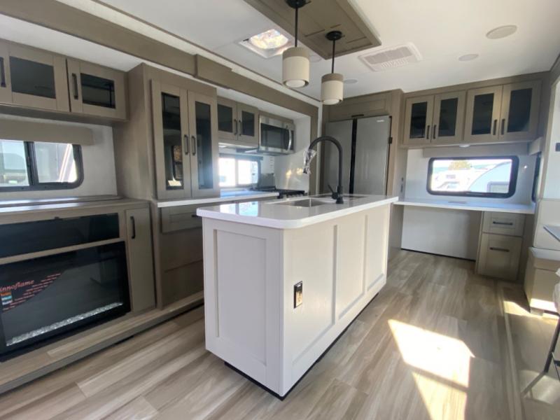 Enjoy a home away from home with this travel trailer! The chef will enjoy cooking either indoors in the rear kitchen with the kitchen island, hutch, and three burner cooktop, or outdoors with the outside griddle and outside 1.6 cu. ft. refrigerator to drink a cold beverage while grilling burgers. If mother nature rains on your parade then you can head indoors and either play games at the booth dinette or relax on the theater seating across from the entertainment center with a 40" TV and fireplace. Rinse the sand out of your hair in the full bathroom with the 30" x 36" shower then head to the front private bedroom and lay down on the queen bed slide which can be replace for an optional king bed. Keep your clothes clean with the prepped washer and dryer area and watch the big game outdoors with the coax TV hookup!