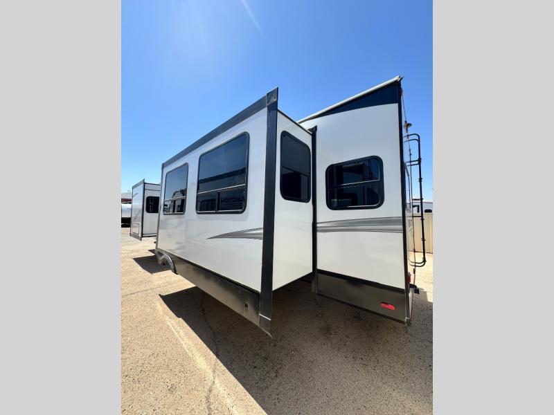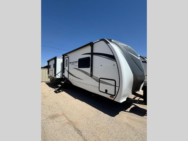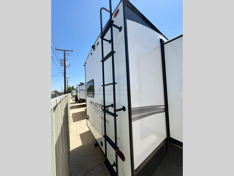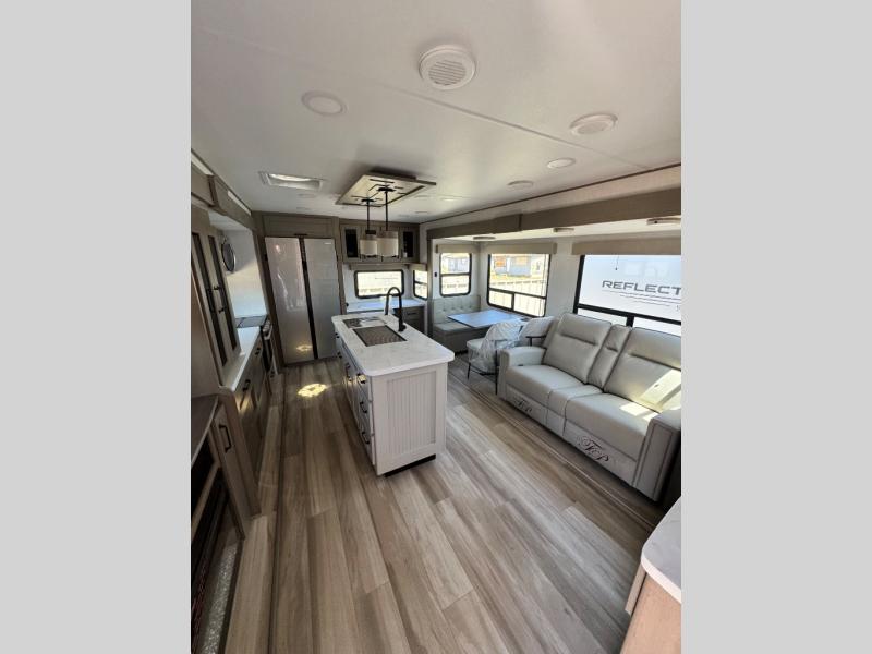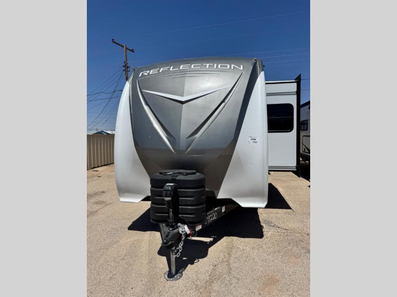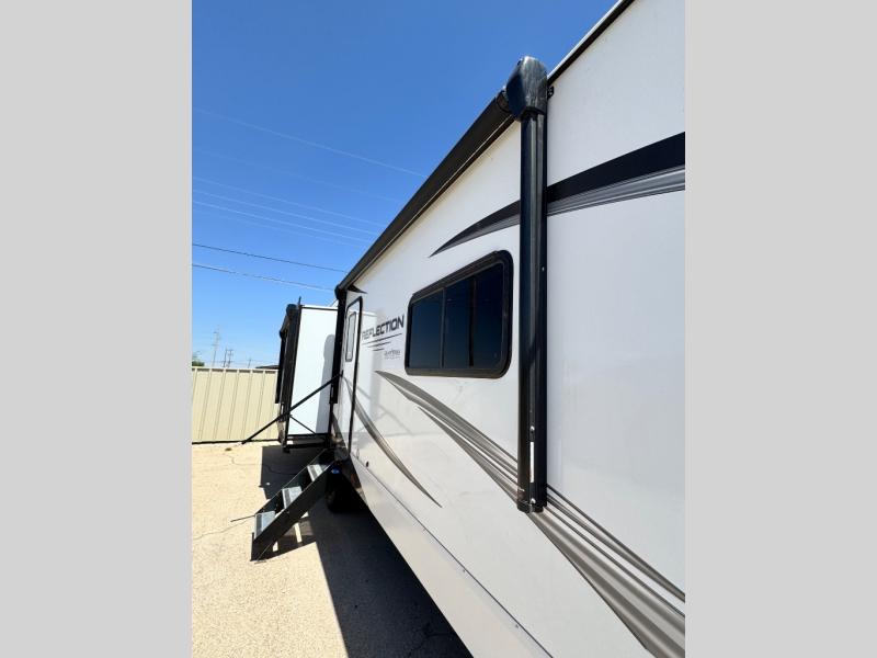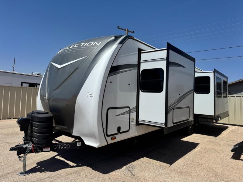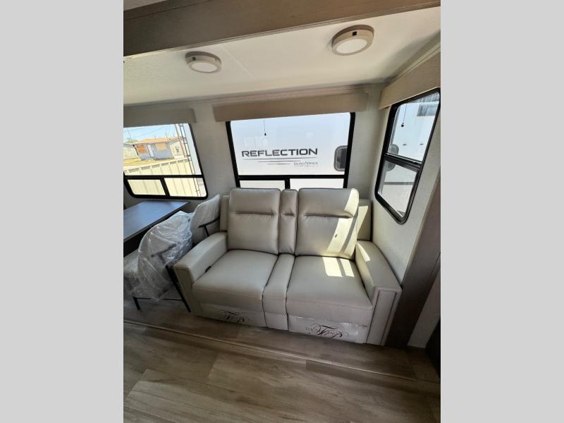 With any Reflection travel trailer by Grand Design, you will have a solar panel for off-grid camping and a 60 amp charge controller and inverter prep, a Universal All-In-One docking station, unobstructed pass-through storage, and Goodyear Endurance tires. Each is constructed of gel coat exterior sidewalls, residential 5" truss rafters, walk-on roof decking, a fiberglass and radiant foil roof and front cap insulation plus laminated aluminum framed side walls, roof and end walls in slide rooms. Head inside to enjoy residential hardwood cabinet doors, premium Congoleum flooring, a spacious shower with a glass door, and many more comforts!