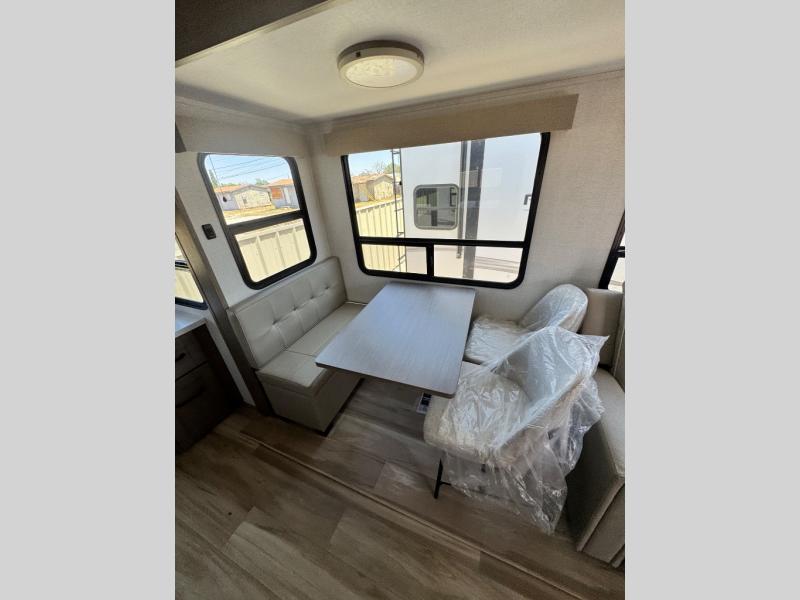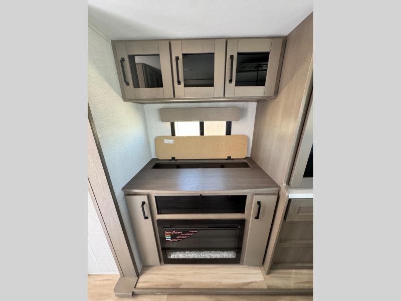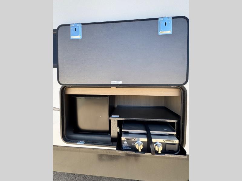 Enjoy a home away from home with this travel trailer! The chef will enjoy cooking either indoors in the rear kitchen with the kitchen island, hutch, and three burner cooktop, or outdoors with the outside griddle and outside 1.6 cu. ft. refrigerator to drink a cold beverage while grilling burgers. If mother nature rains on your parade then you can head indoors and either play games at the booth dinette or relax on the theater seating across from the entertainment center with a 40" TV and fireplace. Rinse the sand out of your hair in the full bathroom with the 30" x 36" shower then head to the front private bedroom and lay down on the queen bed slide which can be replace for an optional king bed.