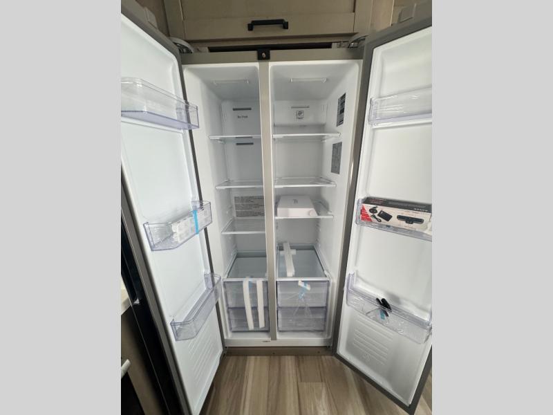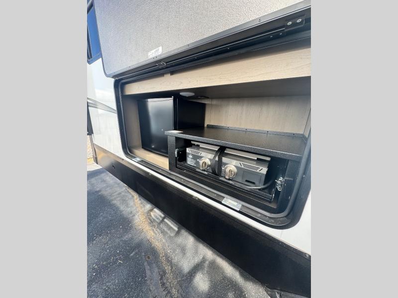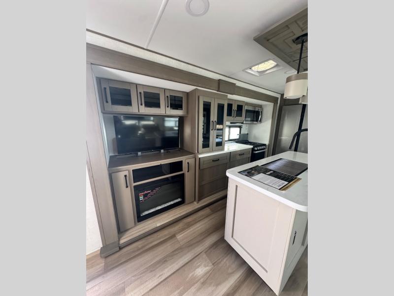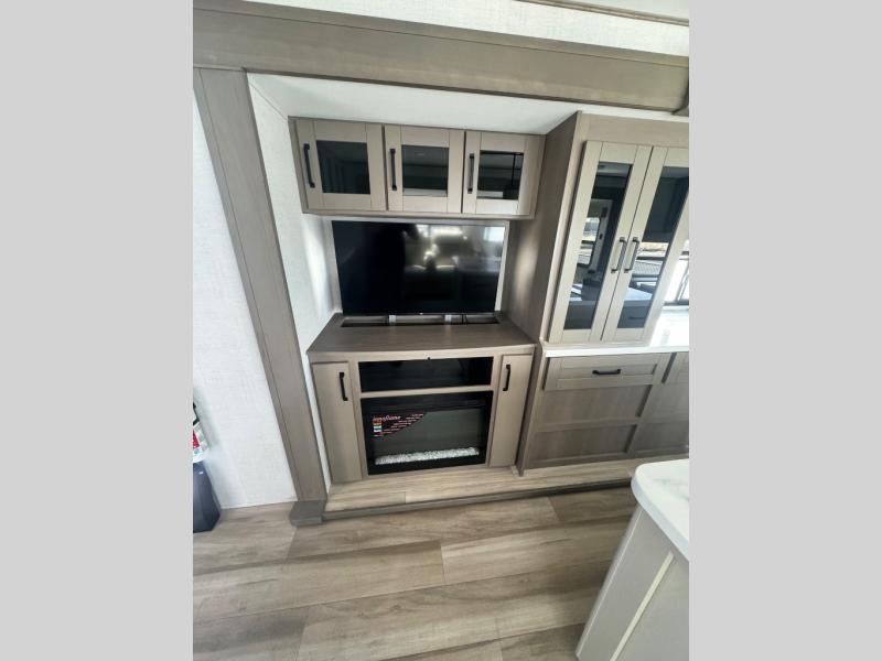 Enjoy a home away from home with this travel trailer! The chef will enjoy cooking either indoors in the rear kitchen with the kitchen island, hutch, and three burner cooktop, or outdoors with the outside griddle and outside 1.6 cu. ft. refrigerator to drink a cold beverage while grilling burgers. If mother nature rains on your parade then you can head indoors and either play games at the booth dinette or relax on the theater seating across from the entertainment center with a 40" TV and fireplace. Rinse the sand out of your hair in the full bathroom with the 30" x 36" shower then head to the front private bedroom and lay down on the queen bed slide which can be replace for an optional king bed.