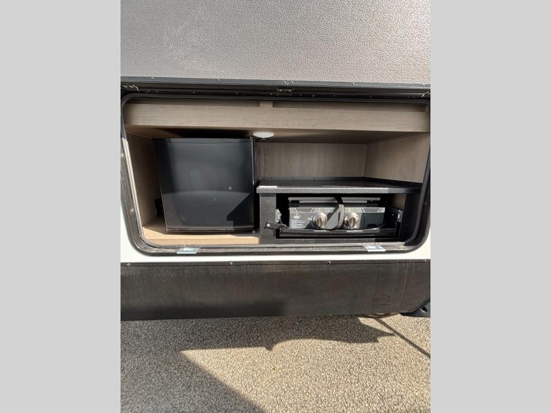Enjoy a home away from home with this travel trailer! The chef will enjoy cooking either indoors in the rear kitchen with the kitchen island, hutch, and three burner cooktop, or outdoors with the outside griddle and outside 1.6 cu. ft. refrigerator to drink a cold beverage while grilling burgers. If mother nature rains on your parade then you can head indoors and either play games at the booth dinette or relax on the theater seating across from the entertainment center with a 40" TV and fireplace. Rinse the sand out of your hair in the full bathroom with the 30" x 36" shower then head to the front private bedroom and lay down on the queen bed slide which can be replace for an optional king bed.