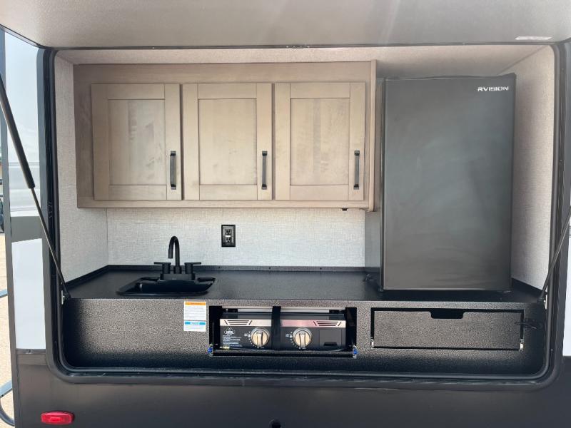 Are you looking to travel with your family and friends and want enough space for everyone to be comfortable? Step inside using the Step Above wit lift assist entry steps, to find a private bunkhouse in the rear of this fifth wheel which offers a slide out flip bunk above a tri-fold sofa, a 44" bunk bed with window and storage below, plus its very own private half bathroom. The theater seating or tri-fold sofa option is a great place to unwind at night in front of the entertainment center with a 40" LED HDTV and fireplace below it. There is a booth dinette or you can choose a free standing dinette option to dine at, and the kitchen island will provide more counter space to prep meals. You will find full amenities including a 16 cu. ft. 12V refrigerator and a hutch. This fifth wheel also includes a double entry bathroom with a radius shower, and you can wake up refreshed each morning after sleeping on your own queen bed.
