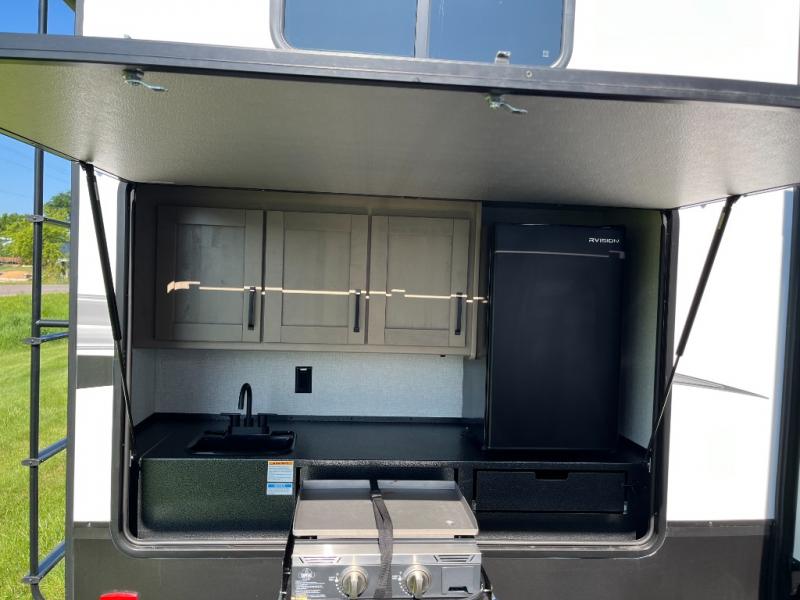 Are you looking to travel with your family and friends and want enough space for everyone to be comfortable? Step inside using the Step Above wit lift assist entry steps, to find a private bunkhouse in the rear of this fifth wheel which offers a slide out flip bunk above a tri-fold sofa, a 44" bunk bed with window and storage below, plus its very own private half bathroom. The theater seating or tri-fold sofa option is a great place to unwind at night in front of the entertainment center with a 40" LED HDTV and fireplace below it. There is a booth dinette or you can choose a free standing dinette option to dine at, and the kitchen island will provide more counter space to prep meals. You will find full amenities including a 16 cu. ft. 12V refrigerator and a hutch. This fifth wheel also includes a double entry bathroom with a radius shower, and you can wake up refreshed each morning after sleeping on your own queen bed.