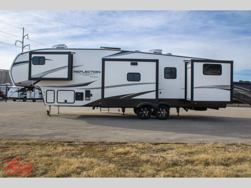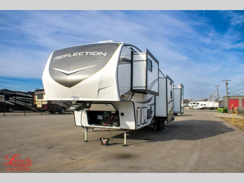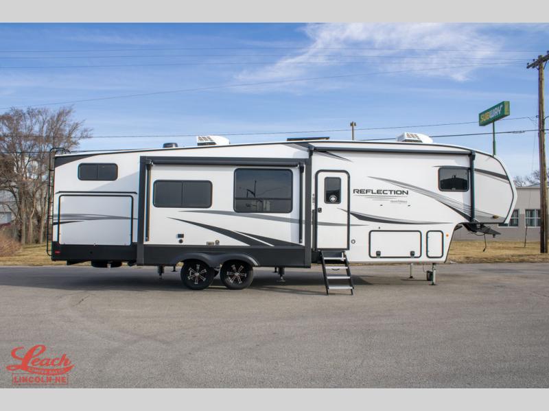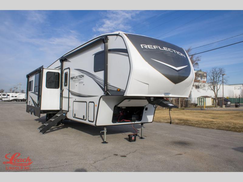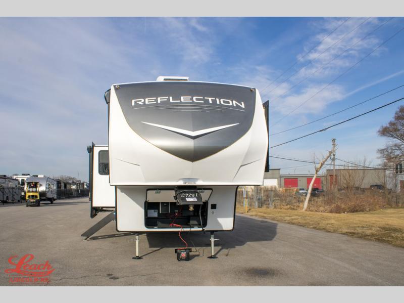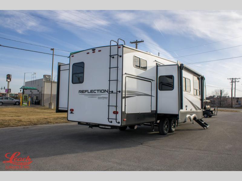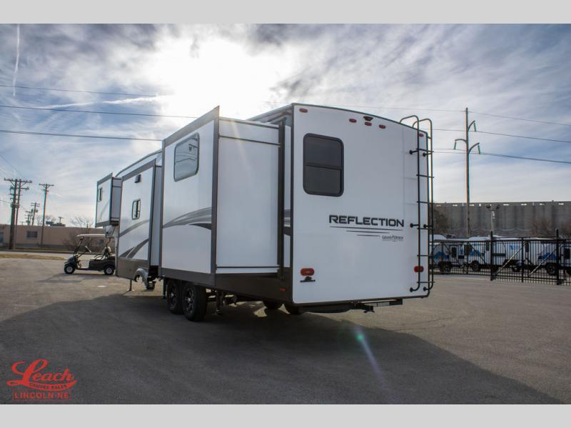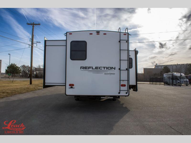 With any Reflection fifth wheel by Grand Design, you will have a solar panel for off-grid camping and a 60 amp charge controller and inverter prep, a Universal All-In-One docking station, unobstructed pass-through storage, and Goodyear Endurance tires. Each is constructed of gel coat exterior sidewalls, residential 5" truss rafters, walk-on roof decking, a fiberglass and radiant foil roof and front cap insulation plus laminated aluminum framed side walls, roof and end walls in slide rooms. Head inside to enjoy residential hardwood cabinet doors, premium Congoleum flooring, a spacious shower with a glass door, and many more comforts!