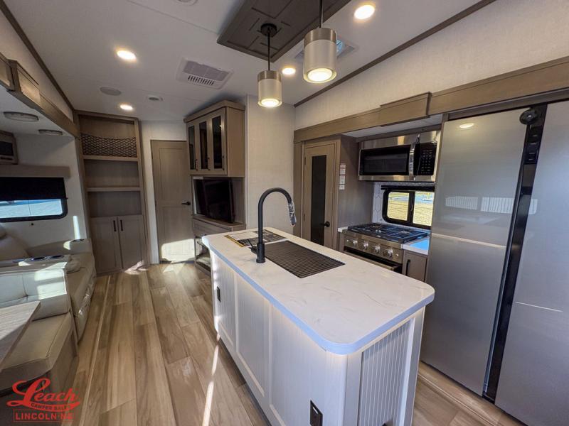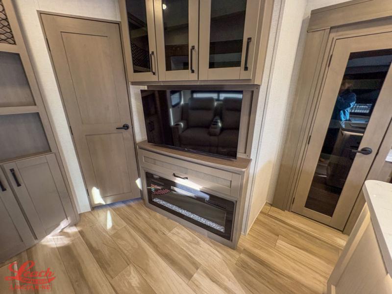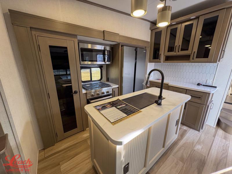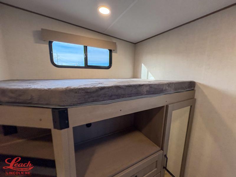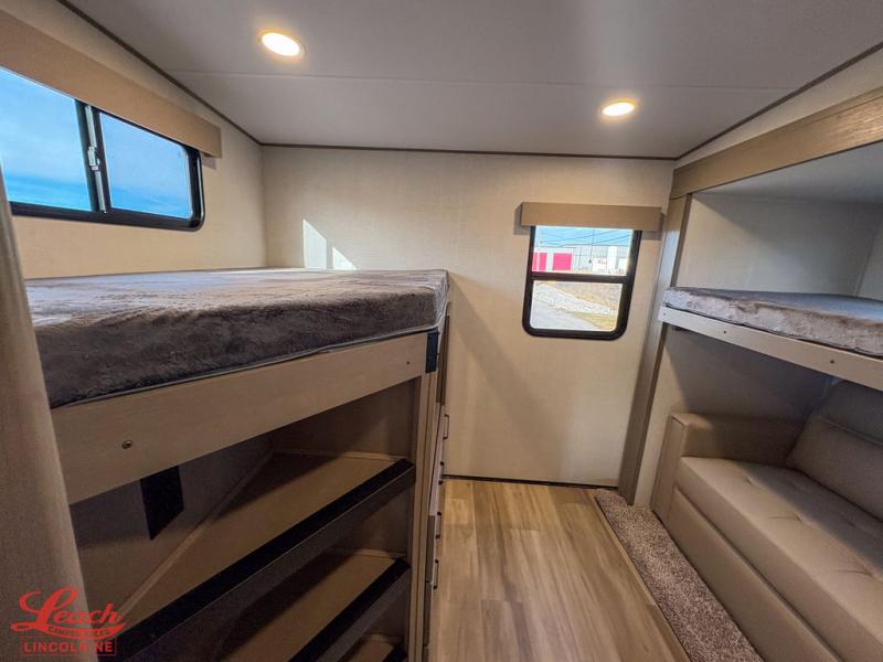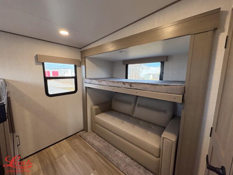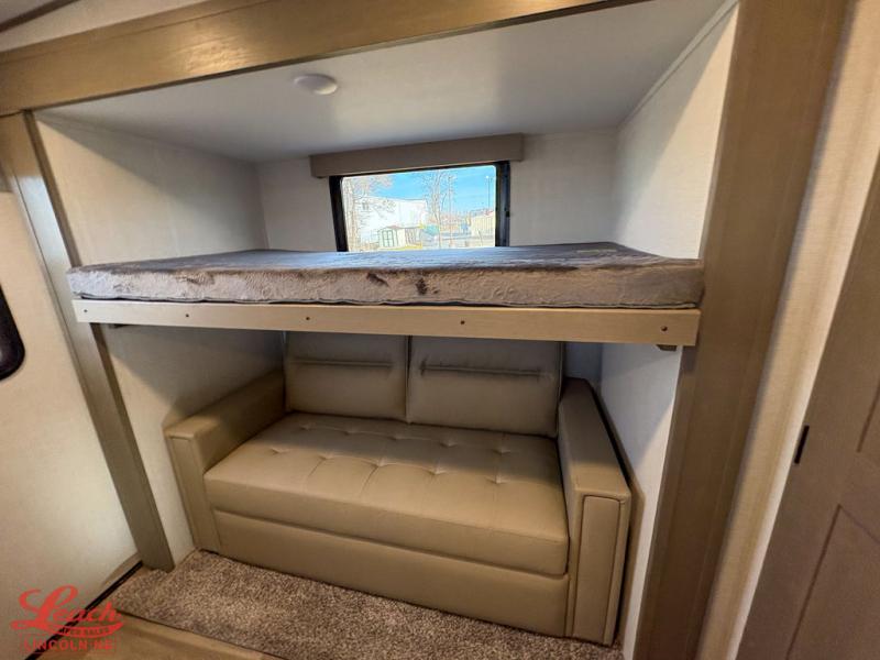 Are you looking to travel with your family and friends and want enough space for everyone to be comfortable? Step inside using the Step Above wit lift assist entry steps, to find a private bunkhouse in the rear of this fifth wheel which offers a slide out flip bunk above a tri-fold sofa, a 44" bunk bed with window and storage below, plus its very own private half bathroom. The theater seating or tri-fold sofa option is a great place to unwind at night in front of the entertainment center with a 40" LED HDTV and fireplace below it. There is a booth dinette or you can a swivel dinette option to dine at, and the kitchen island will provide more counter space to prep meals. You will find full amenities including a 16 cu. ft. 12V refrigerator and a hutch. This fifth wheel also includes a double entry bathroom with a radius shower, and you can wake up refreshed each morning after sleeping on your own queen bed.