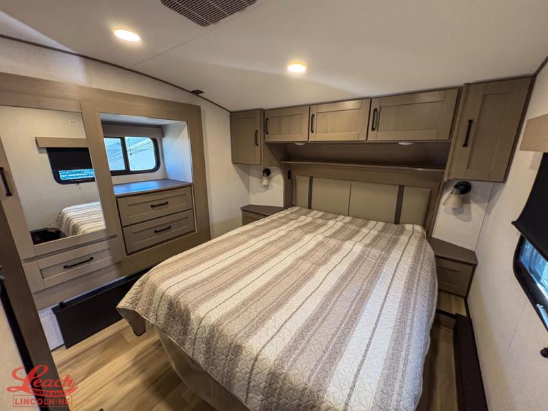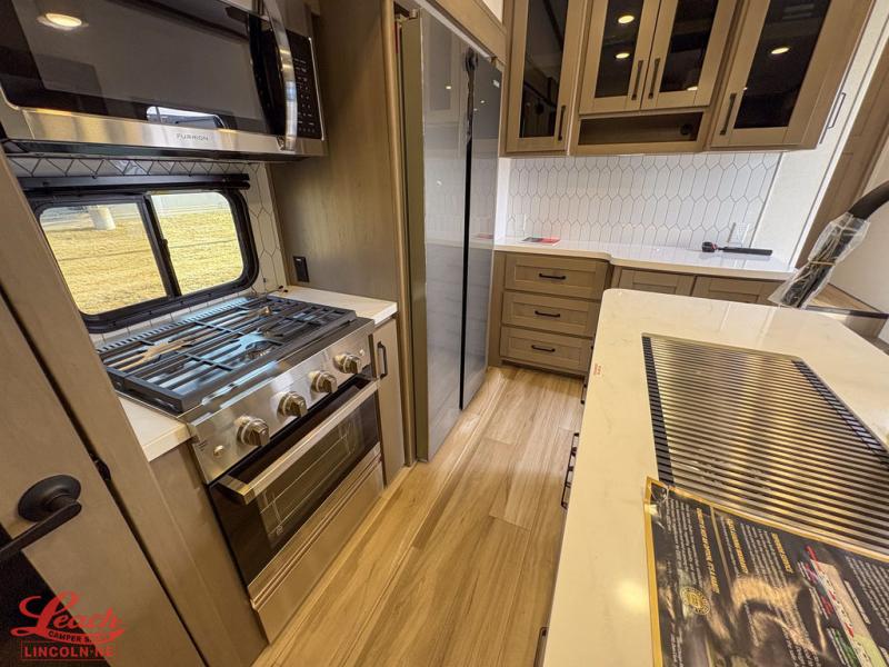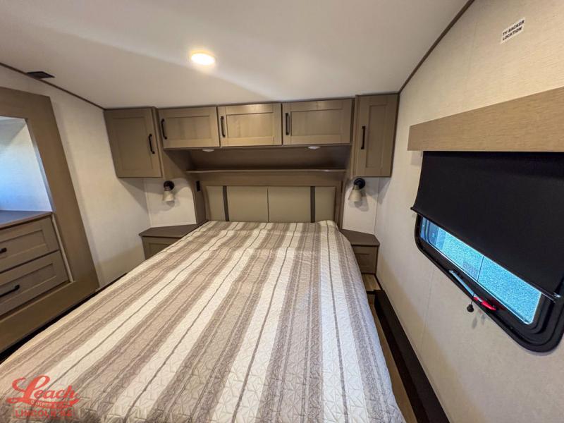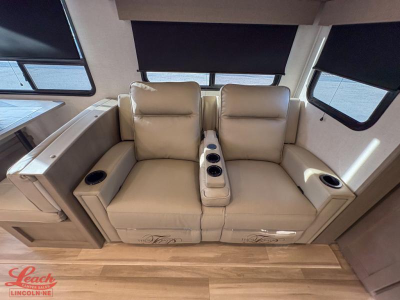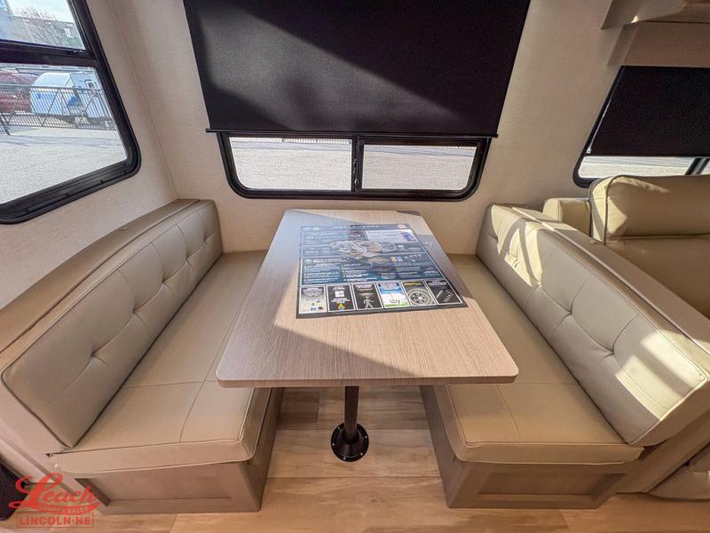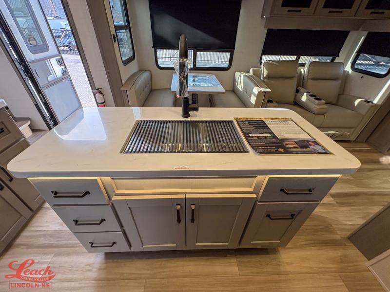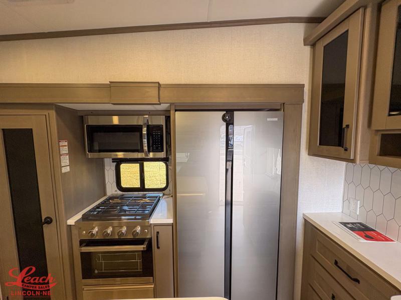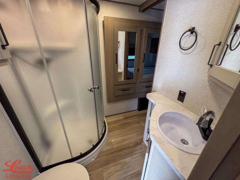Are you looking to travel with your family and friends and want enough space for everyone to be comfortable? Step inside using the Step Above wit lift assist entry steps, to find a private bunkhouse in the rear of this fifth wheel which offers a slide out flip bunk above a tri-fold sofa, a 44" bunk bed with window and storage below, plus its very own private half bathroom. The theater seating or tri-fold sofa option is a great place to unwind at night in front of the entertainment center with a 40" LED HDTV and fireplace below it. There is a booth dinette or you can a swivel dinette option to dine at, and the kitchen island will provide more counter space to prep meals. You will find full amenities including a 16 cu. ft. 12V refrigerator and a hutch. This fifth wheel also includes a double entry bathroom with a radius shower, and you can wake up refreshed each morning after sleeping on your own queen bed.