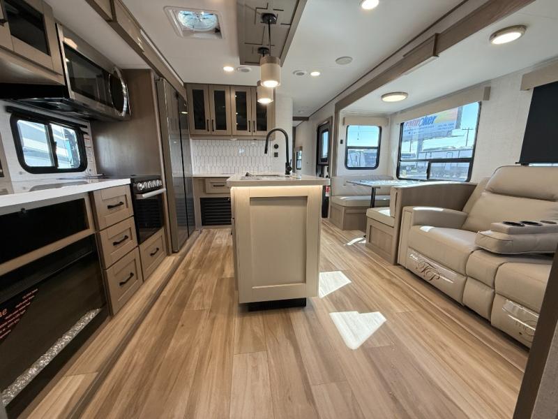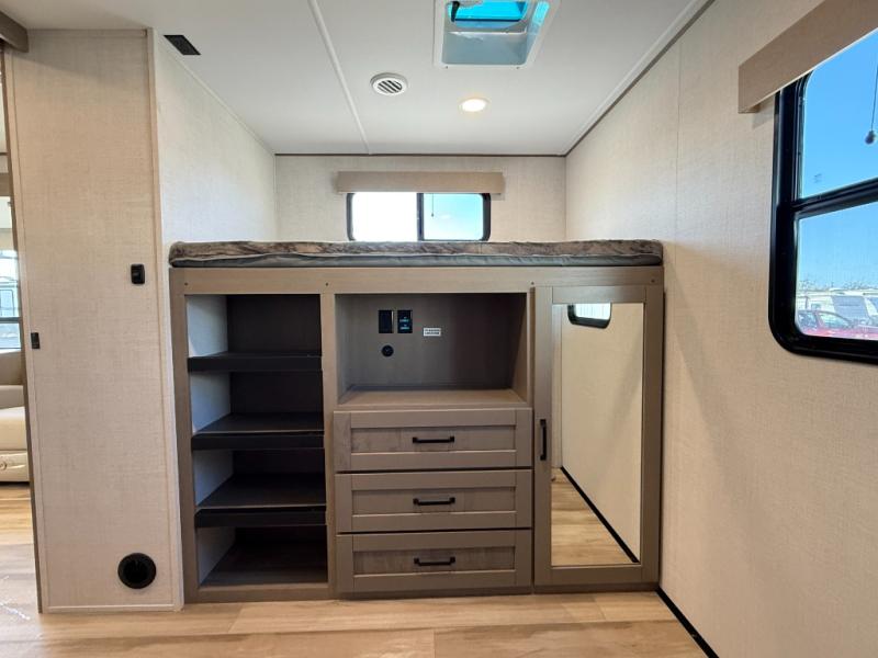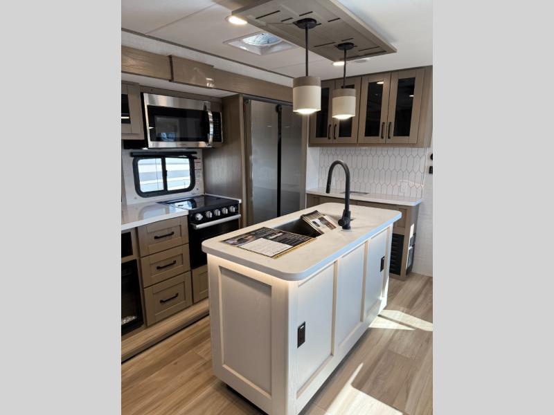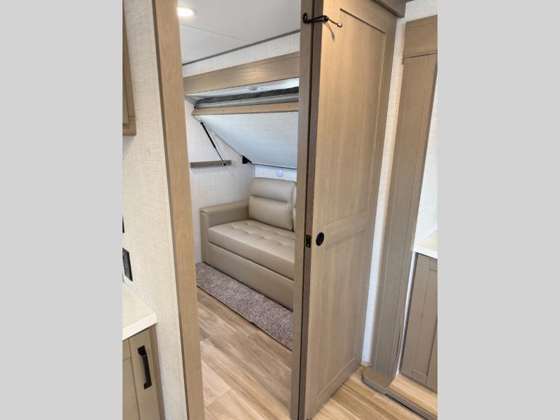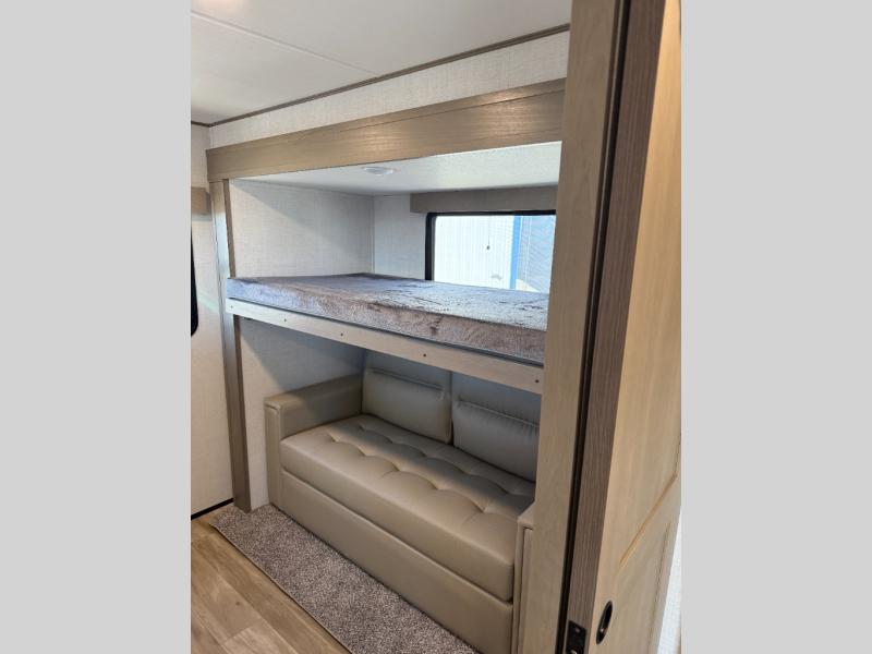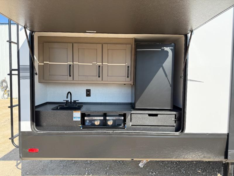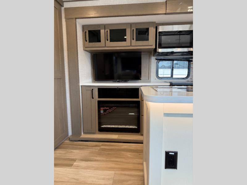 Finding the perfect trailer for a larger group is simple, take a look at this one for your next RV! The rear bunkhouse might be the first reason you fall in love because of the slide out with a flip bunk above a tri-fold sofa, the second bunk bed with a window on the opposite side and storage below, and the large rear window for great views. The outside kitchen might be another reason allowing you to enjoy the outdoors while providing meals for everyone, and/or the inside gourmet kitchen with a 16 cu. ft. refrigerator, an island, and two hutches. Everyone can gather together and relax on the theater seating with cupholders and the booth dinette or optional swivel dinette, or watch the 40" LED HDTV with fireplace below. The full bathroom includes a space savings sliding door and linen storage, and the bedroom gives you a front walk-around queen bed with storage for your clothes on each side, plus there is an additional wardrobe with drawers for your clothes!