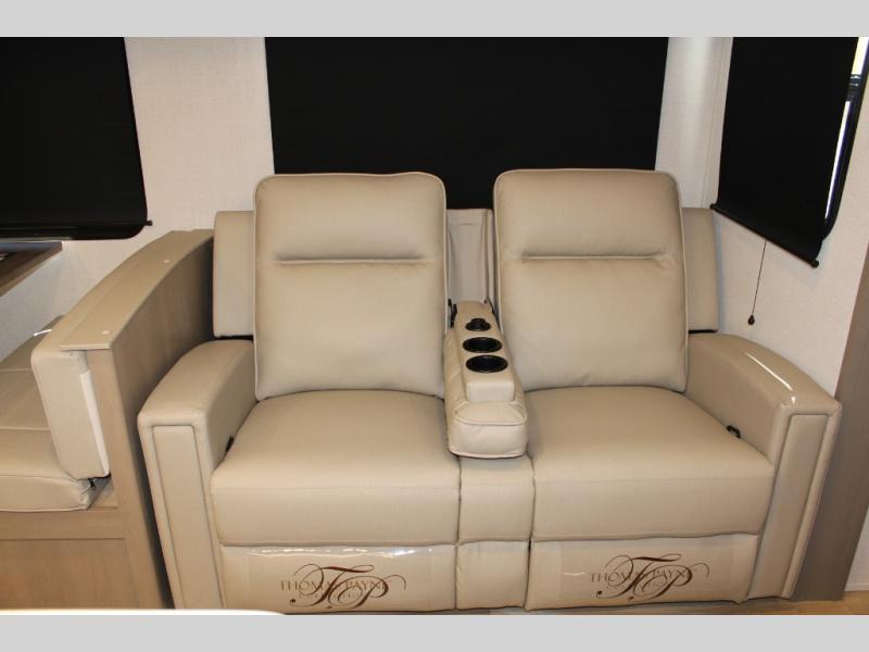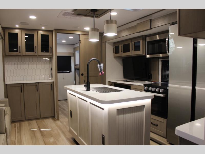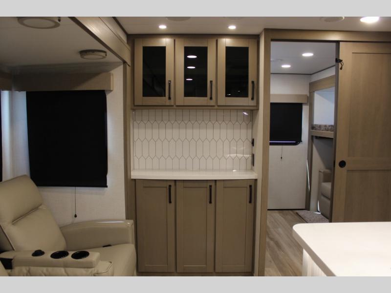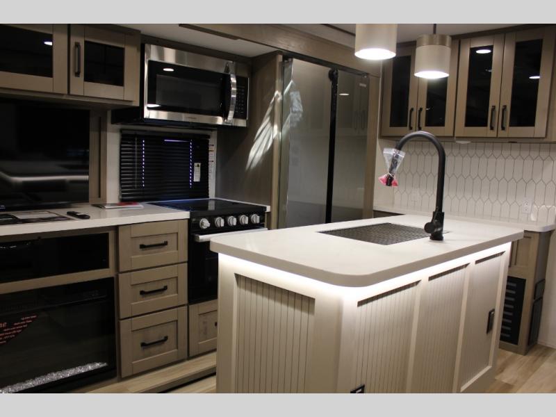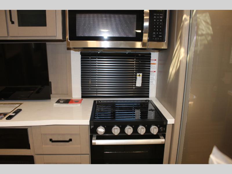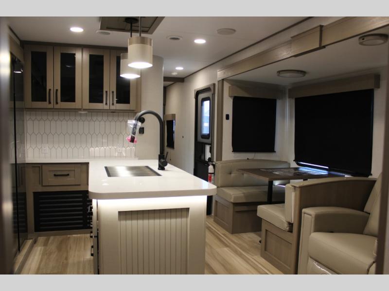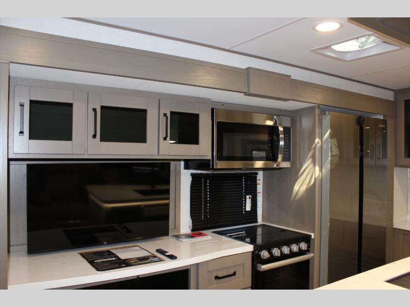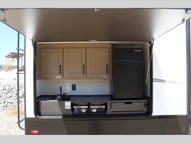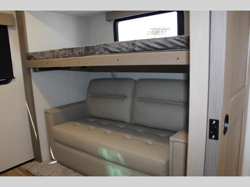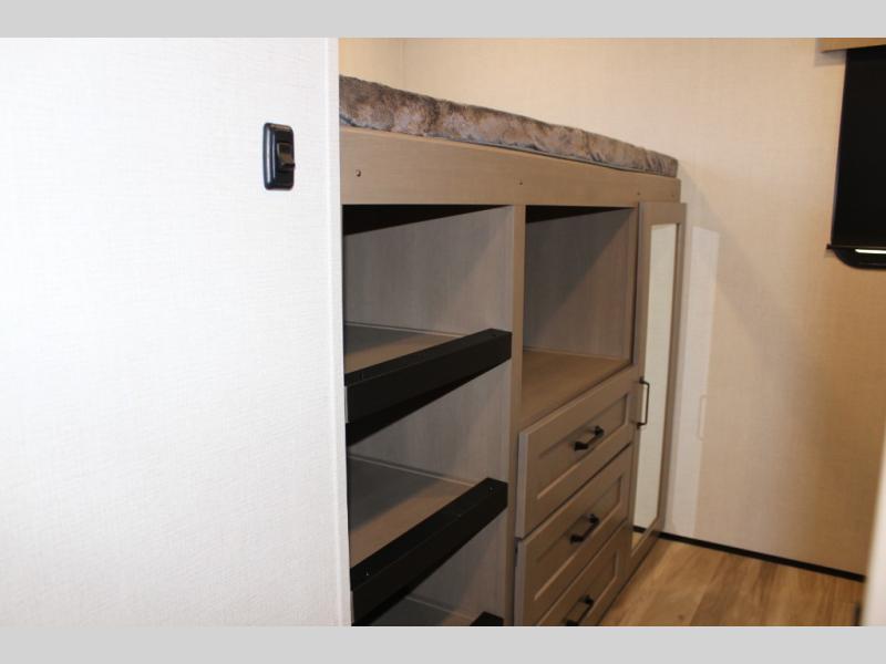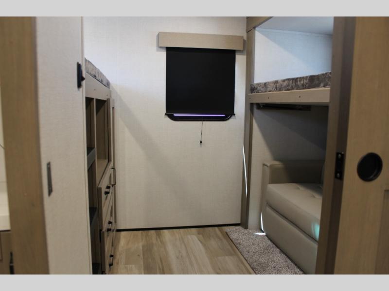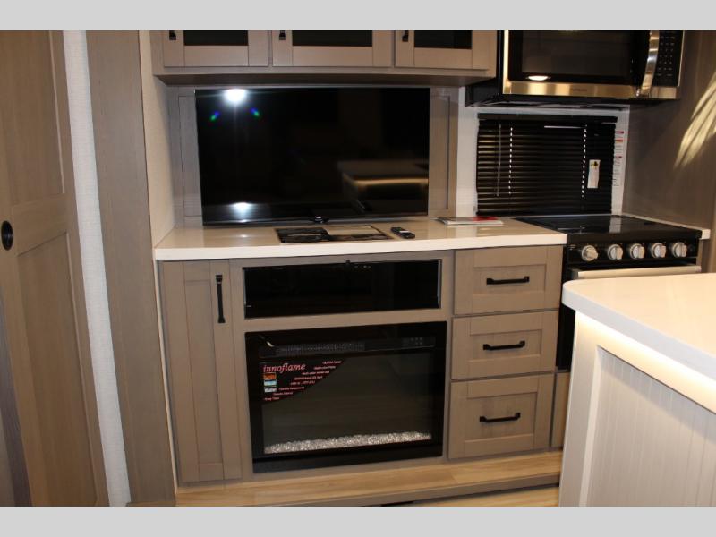 Finding the perfect trailer for a larger group is simple, take a look at this one for your next RV! The rear bunkhouse might be the first reason you fall in love because of the slide out with a flip bunk above a tri-fold sofa, the second bunk bed with a window on the opposite side and storage below, and the large rear window for great views. The outside kitchen might be another reason allowing you to enjoy the outdoors while providing meals for everyone, and/or the inside gourmet kitchen with a 16 cu. ft. refrigerator, an island, and two hutches. Everyone can gather together and relax on the theater seating with cupholders and the booth dinette or optional swivel dinette, or watch the 40" LED HDTV with fireplace below. The full bathroom includes a space savings sliding door and linen storage, and the bedroom gives you a front walk-around queen bed with storage for your clothes on each side, plus there is an additional wardrobe with drawers for your clothes!