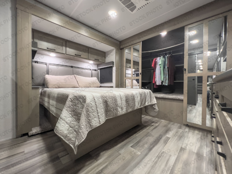 The chef of the group will love the gourmet kitchen including the 16 cu. ft. refrigerator that will hold lots of cold ingredients, beverages and leftovers, the center island when preparing and serving meals, and the hutch with overhead cabinets to display and store dishes and such. This area also includes two slide outs for more floor space and furniture to relax on including theater seating with cupholders for your drinks, a booth dinette to dine at and work from or choose a free standing dinette option, and a rear tri-fold sofa that offers sleeping space for two at night. There is a 40" LED HDTV with fireplace below to enjoy while inside, plus there are two awnings outdoors to relax under. When you are ready to call it a night, get cleaned up in the full bathroom, and retire to your front bedroom with a slide out queen bed or choose a king option, a front full-wall wardrobe with washer/dryer prep, a dresser and an additional wardrobe with drawers.