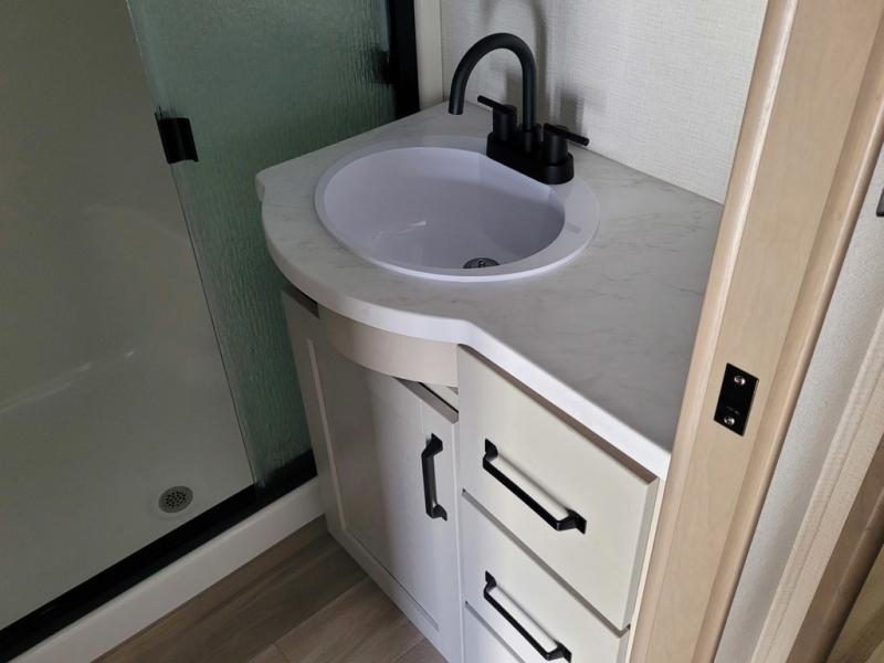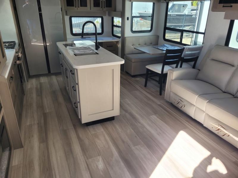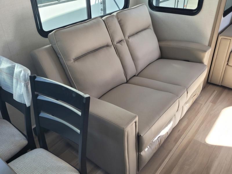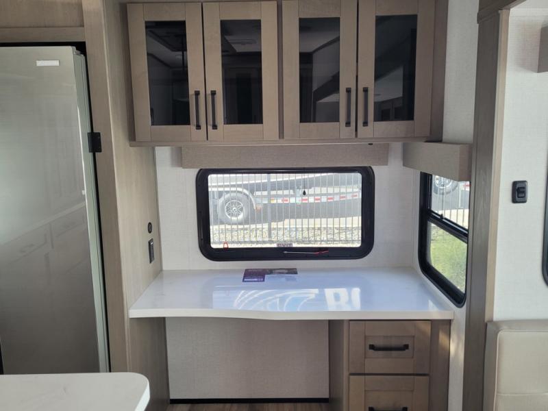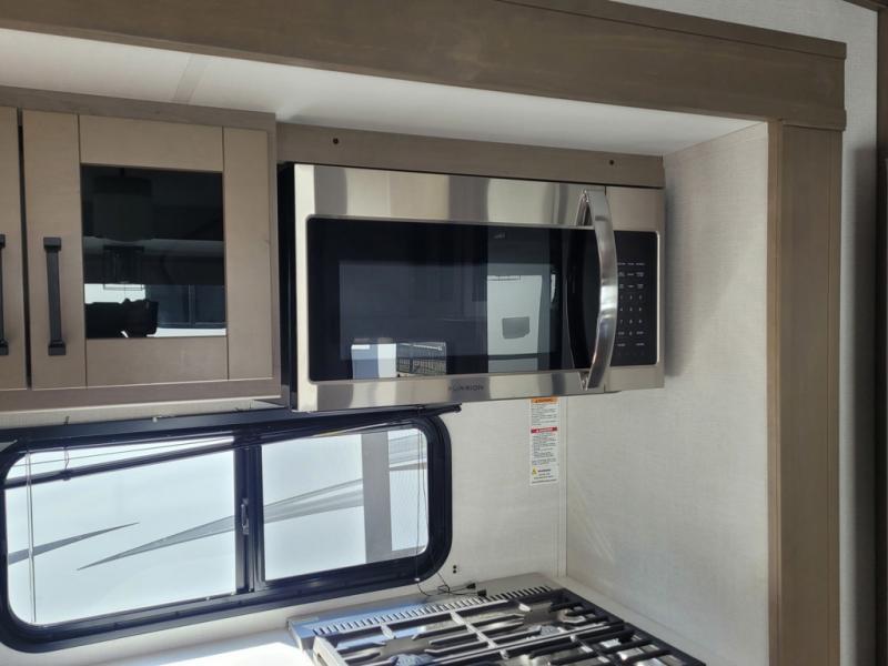 Comfortable accommodations are found throughout this fifth wheel so you can relax, unwind and enjoy your vacation be it for a weekend or a month and even when you have to work! Thanks to the rear desk with a chair and the bedroom with washer and dryer prep, you could stay in this RV as long as you like and keep all your clothes and linens clean. The front bedroom also provides a front wall wardrobe, a slide out queen bed and a dresser. The spacious shower has a glass door and there is linen storage in the full bathroom. The spacious main living and kitchen area has two slide outs with full kitchen amenities and seating with theater seats including cupholders, a booth dinette, and a tri-fold sofa. And the exterior offers an outside kitchen with a griddle, a 1.6 cu ft. refrigerator, and two power awnings!