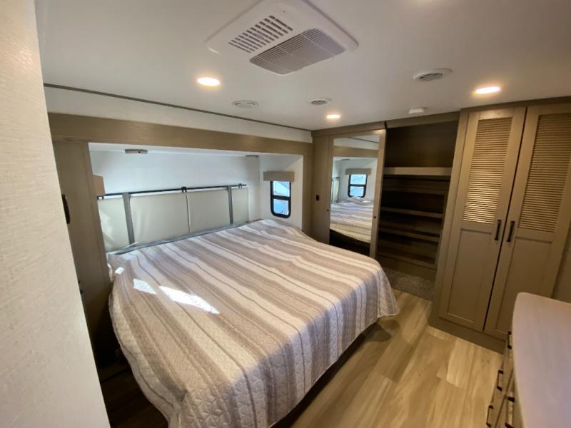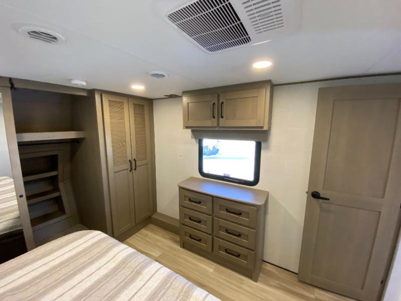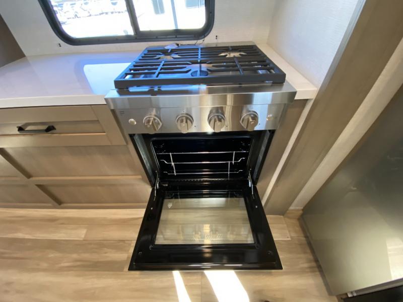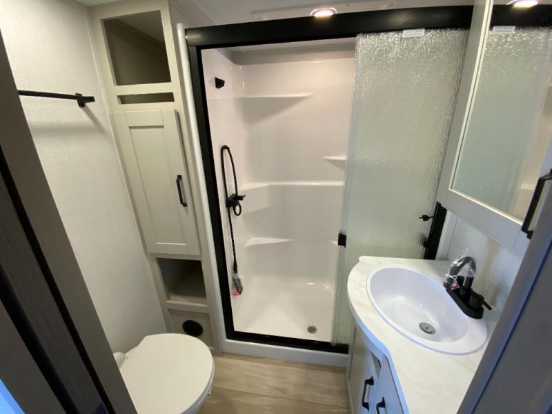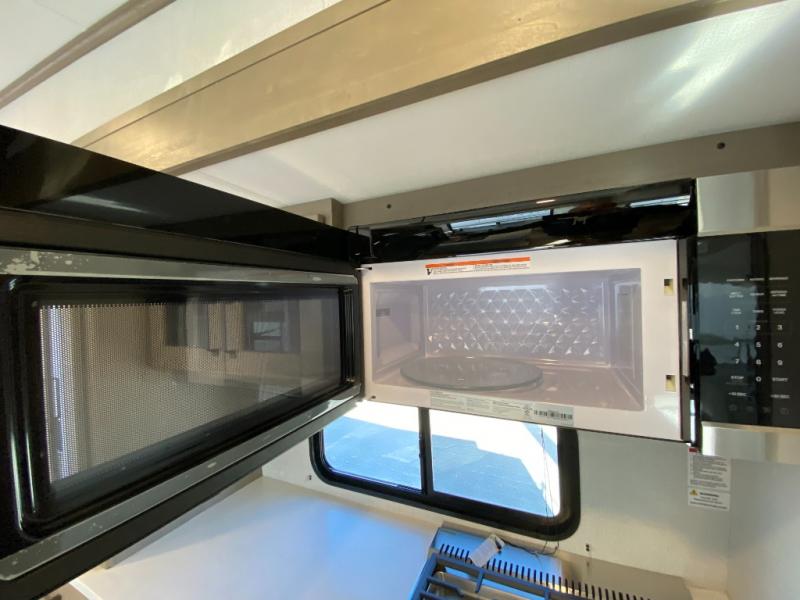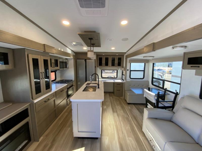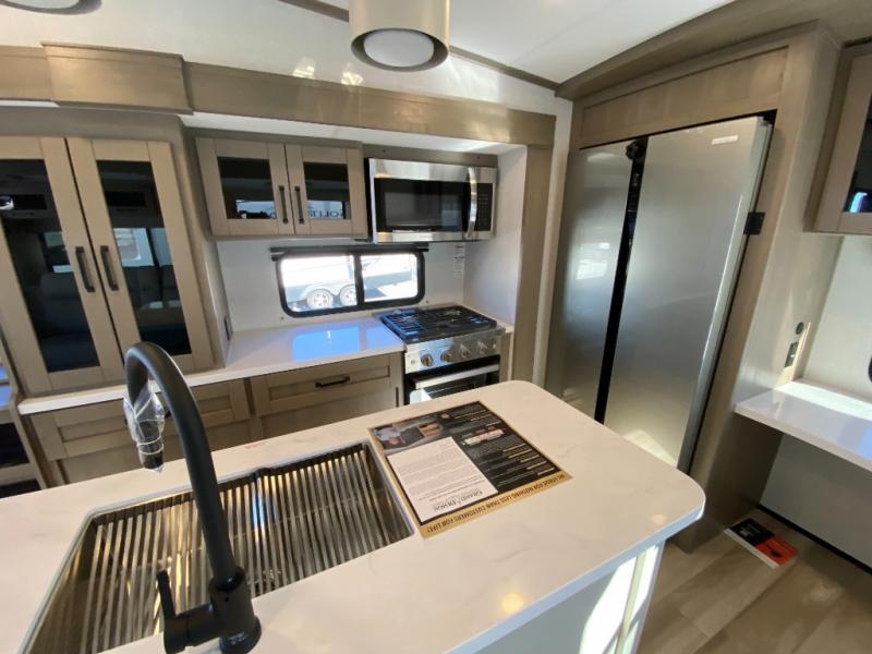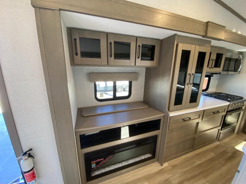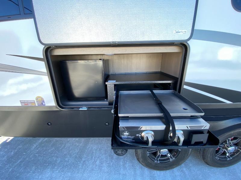 Comfortable accommodations are found throughout this fifth wheel so you can relax, unwind and enjoy your vacation be it for a weekend or a month and even when you have to work! Thanks to the rear desk with a chair and the bedroom with washer and dryer prep, you could stay in this RV as long as you like and keep all your clothes and linens clean. The front bedroom also provides a front wall wardrobe, a slide out queen bed and a dresser. The spacious shower has a glass door and there is linen storage in the full bathroom. The spacious main living and kitchen area has two slide outs with full kitchen amenities and seating with theater seats including cupholders, a booth dinette, and a tri-fold sofa. And the exterior offers an outside kitchen with a griddle, a 1.6 cu ft. refrigerator, and two power awnings!