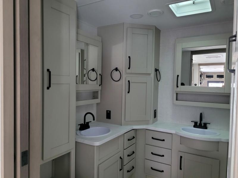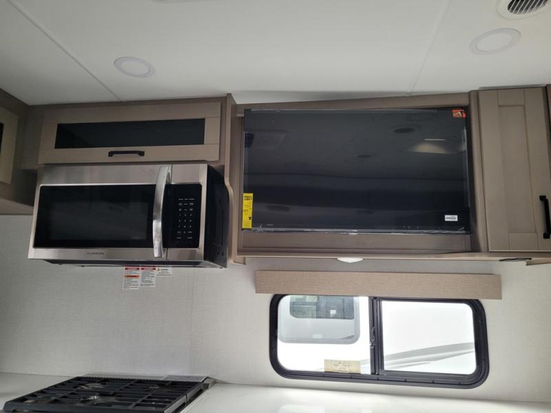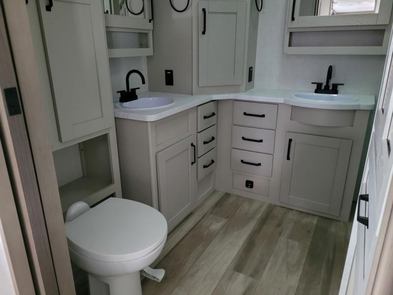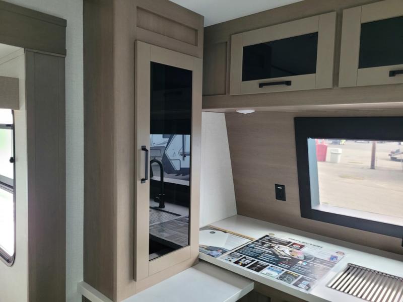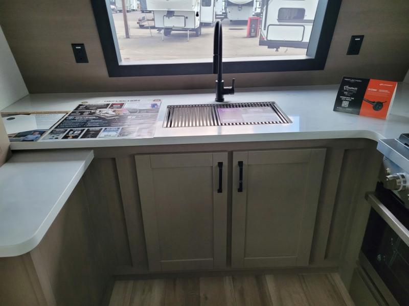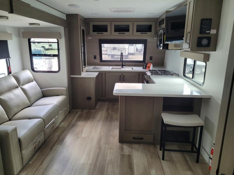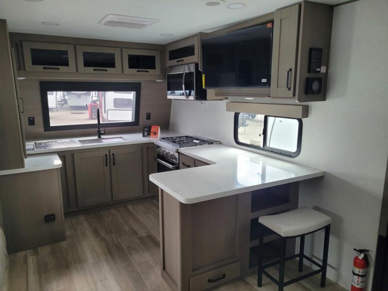 This front kitchen travel trailer will be perfect for camping trips to the lake or woods! There is ample counter space to prep your best meals, including an L-shaped kitchen counter with a bar stool to enjoy your coffee at. The theater seating is inviting, and you can choose the optional tri-fold sofa and end table or optional U-shaped dinette if you need more sleeping space for guests. This unit features a massive master bedroom with a queen bed slide and optional king bed, two closets, and a spacious rear bath. There are two bath sinks here, a 30" x 48" shower, plus washer and dryer prep if you choose to add these appliances!