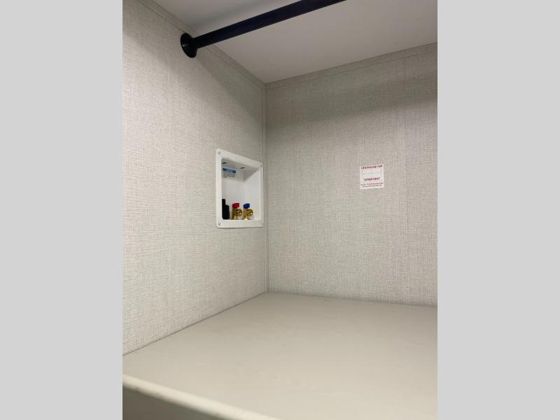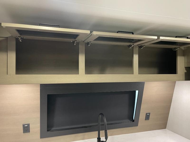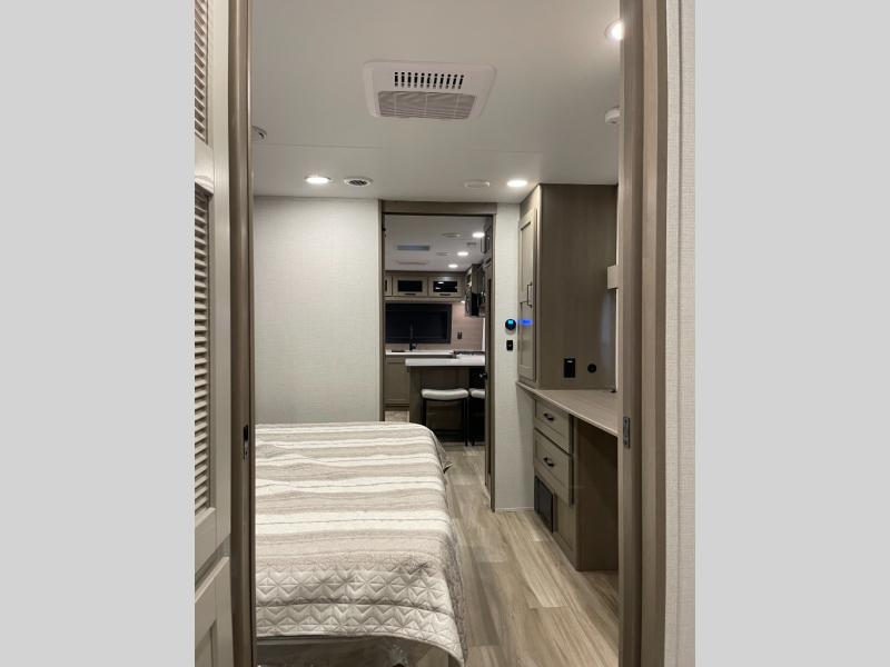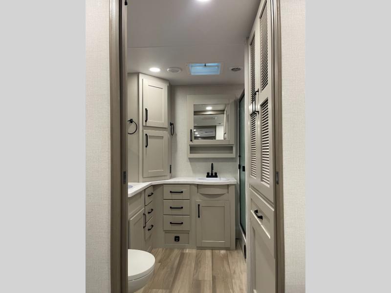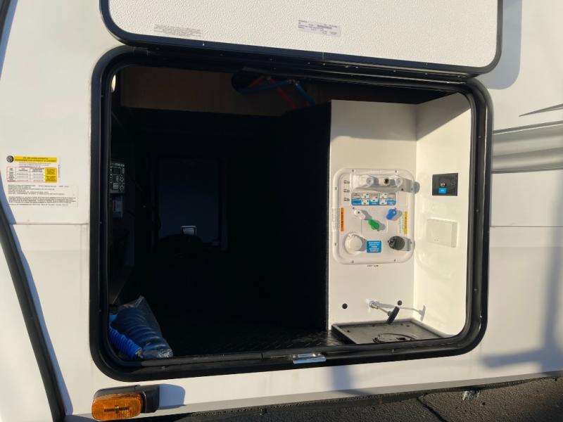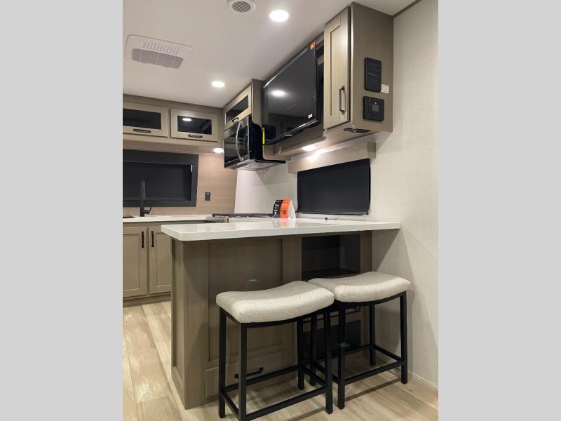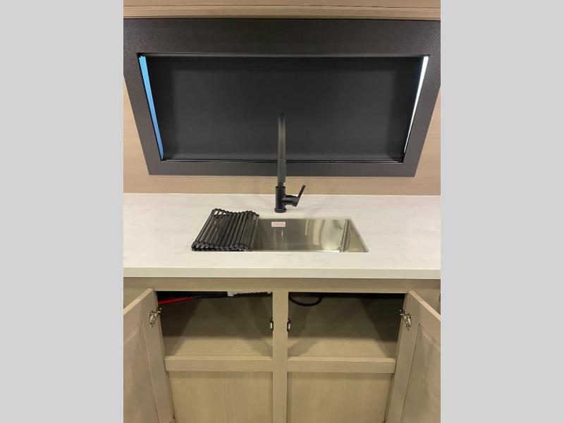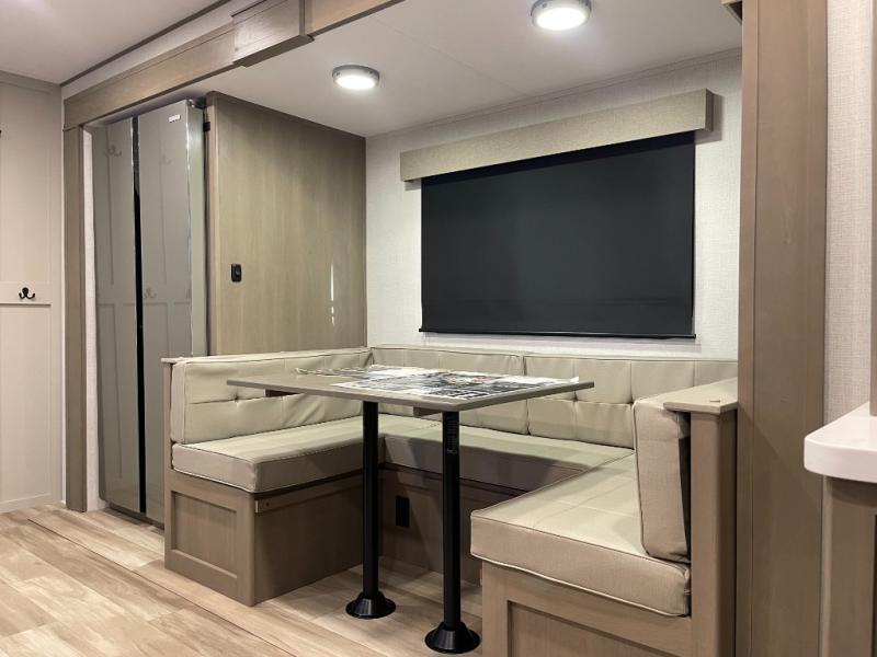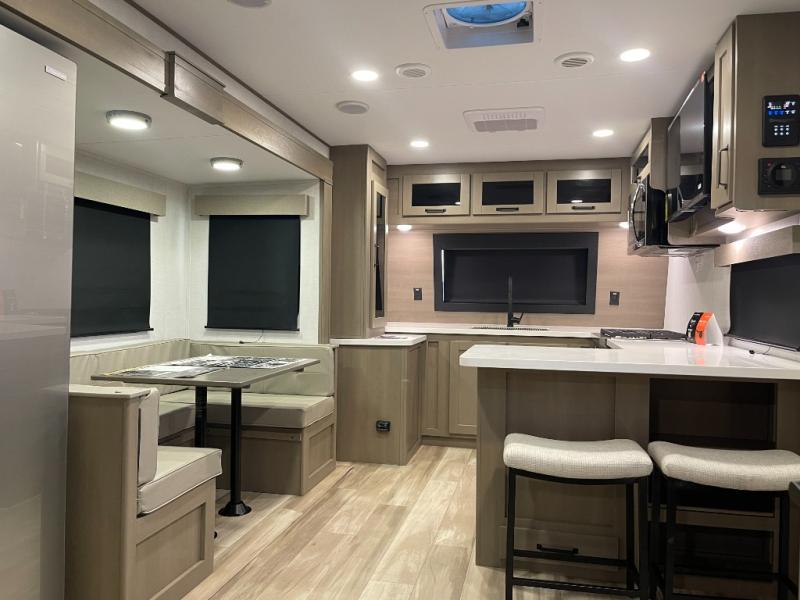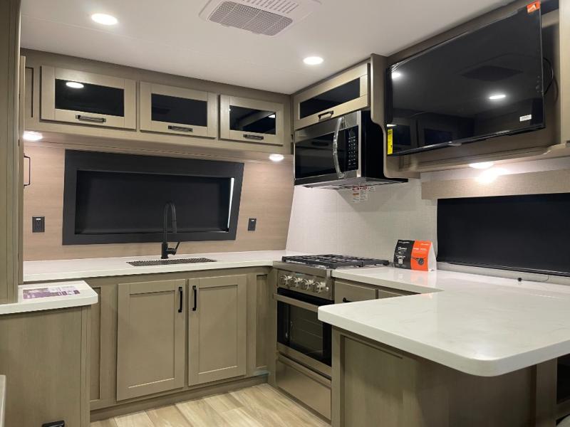 This front kitchen travel trailer will be perfect for camping trips to the lake or woods! There is ample counter space to prep your best meals, including an L-shaped kitchen counter with a bar stool to enjoy your coffee at. The theater seating is inviting, and you can choose the optional tri-fold sofa and end table or optional U-shaped dinette if you need more sleeping space for guests. This unit features a massive master bedroom with a queen bed slide and optional king bed, two closets, and a spacious rear bath. There are two bath sinks here, a 30" x 48" shower, plus washer and dryer prep if you choose to add these appliances!