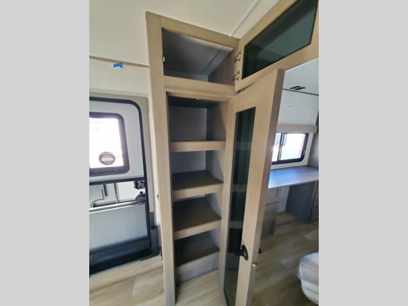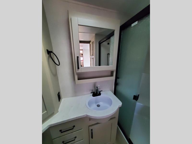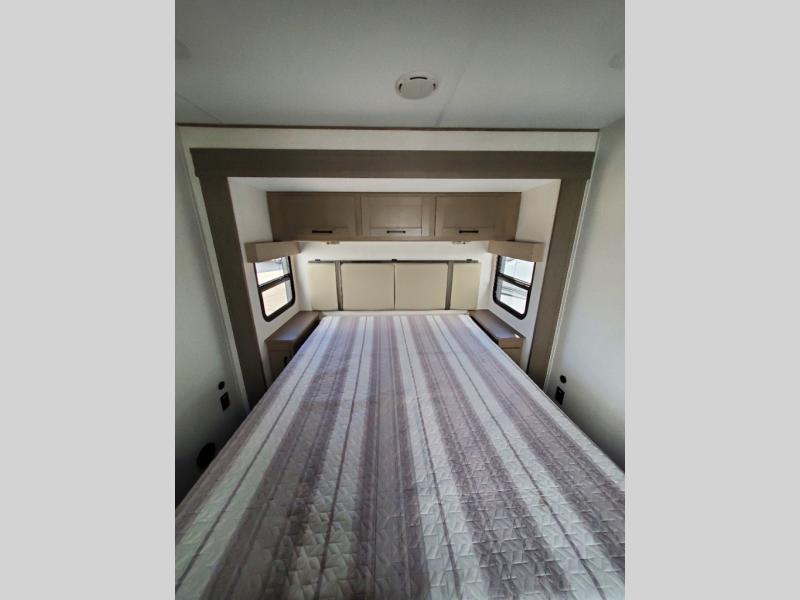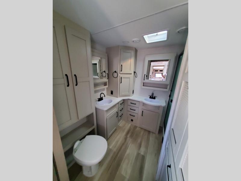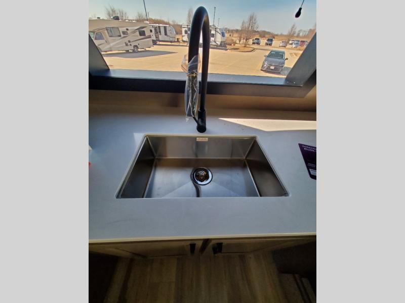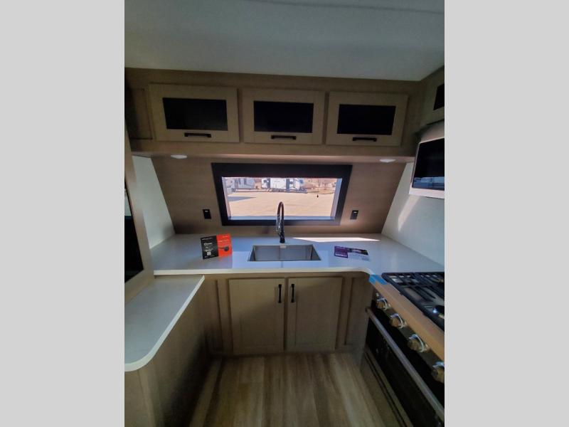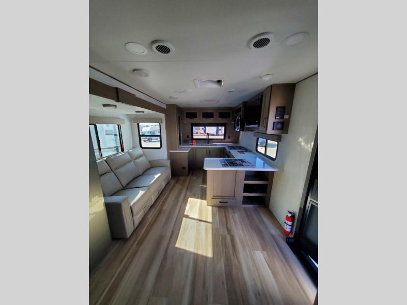 This front kitchen travel trailer will be perfect for camping trips to the lake or woods! There is ample counter space to prep your best meals, including an L-shaped kitchen counter with a bar stool to enjoy your coffee at. The theater seating is inviting, and you can choose the optional tri-fold sofa and end table or optional U-shaped dinette if you need more sleeping space for guests. This unit features a massive master bedroom with a queen bed slide and optional king bed, two closets, and a spacious rear bath. There are two bath sinks here, a 30" x 48" shower, plus washer and dryer prep if you choose to add these appliances!