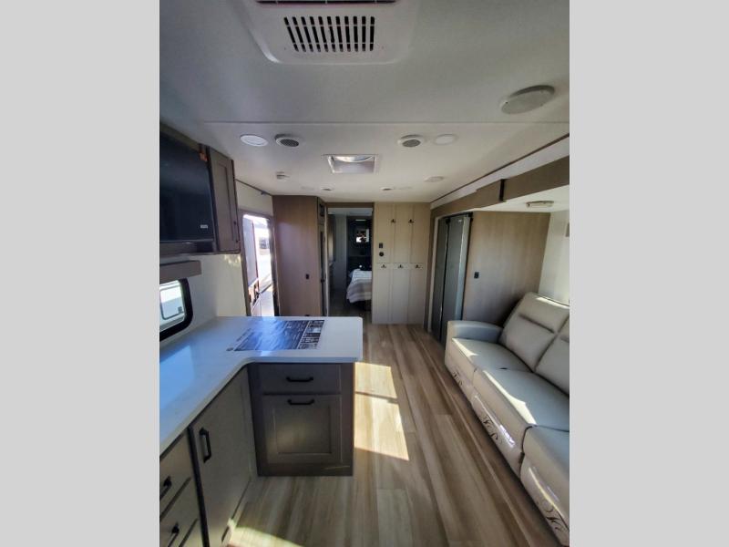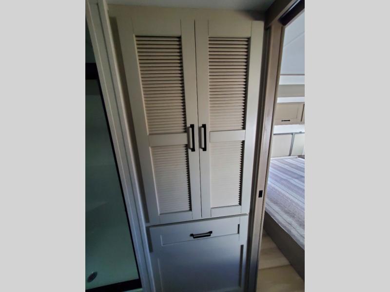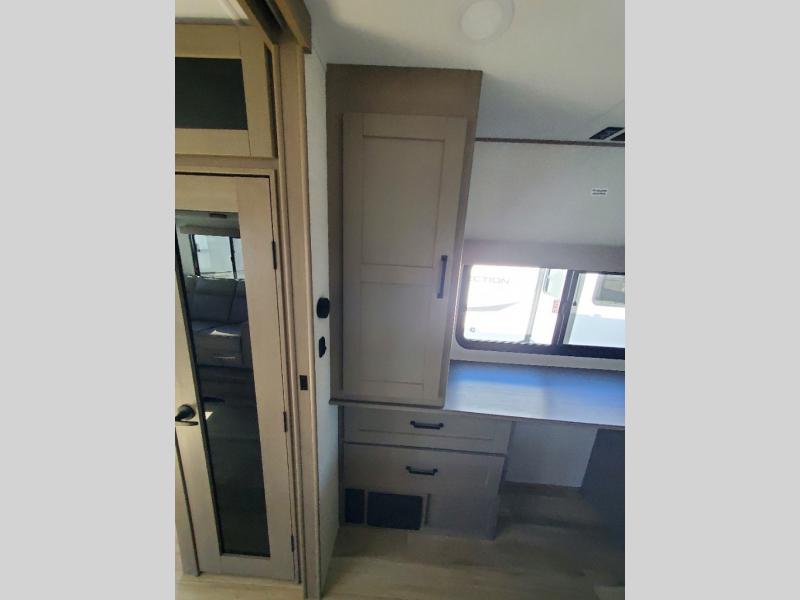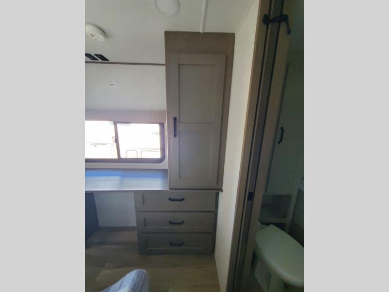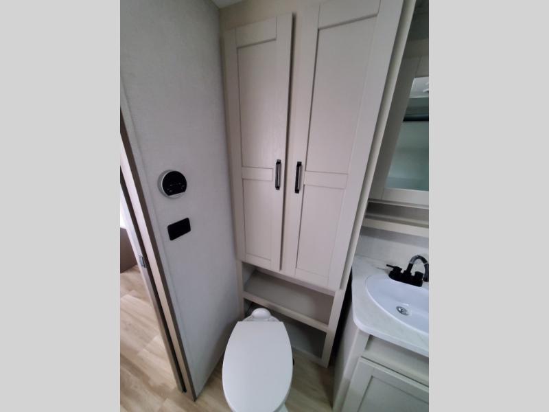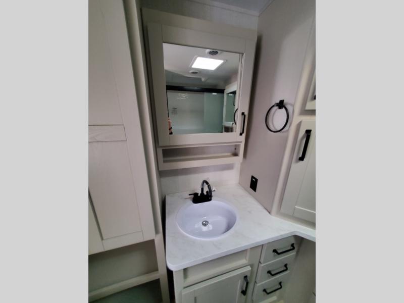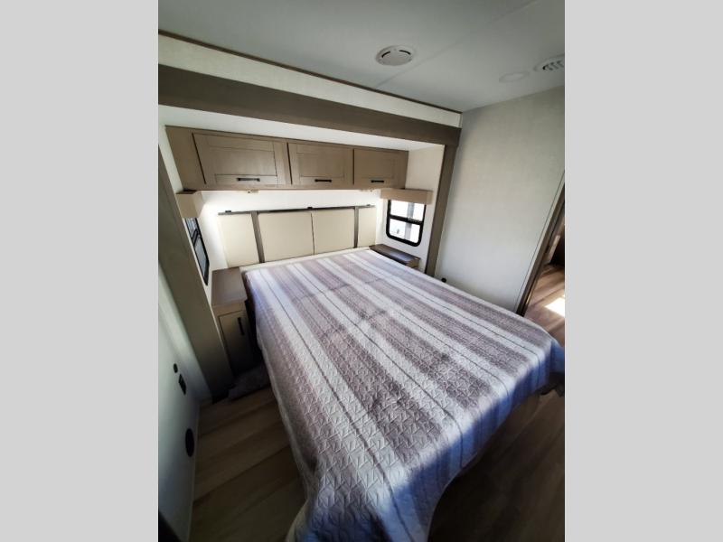This front kitchen travel trailer will be perfect for camping trips to the lake or woods! There is ample counter space to prep your best meals, including an L-shaped kitchen counter with a bar stool to enjoy your coffee at. The theater seating is inviting, and you can choose the optional tri-fold sofa and end table or optional U-shaped dinette if you need more sleeping space for guests. This unit features a massive master bedroom with a queen bed slide and optional king bed, two closets, and a spacious rear bath. There are two bath sinks here, a 30" x 48" shower, plus washer and dryer prep if you choose to add these appliances!