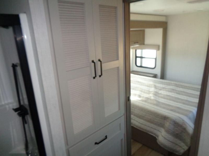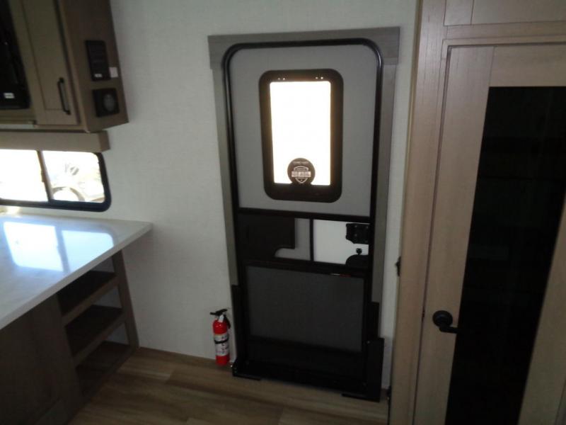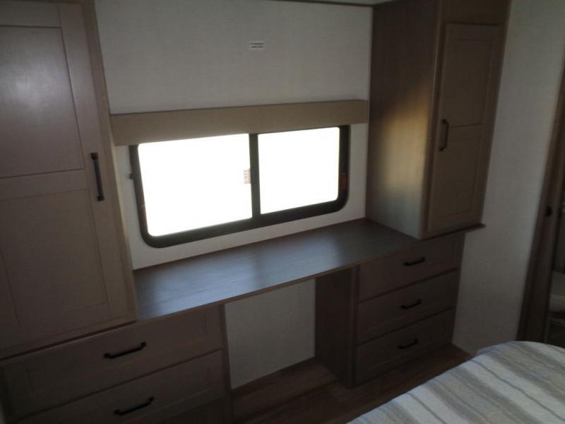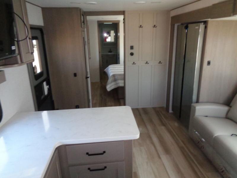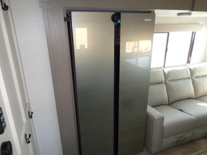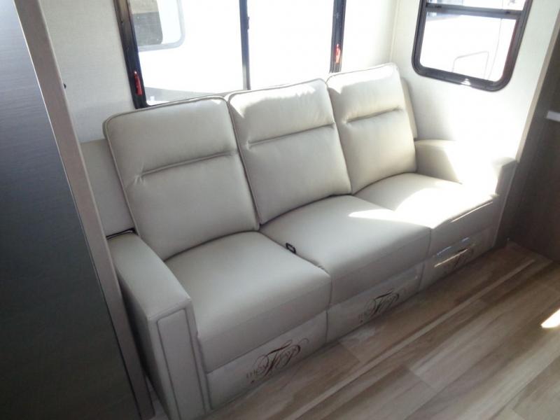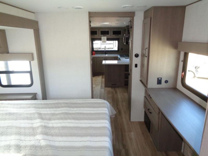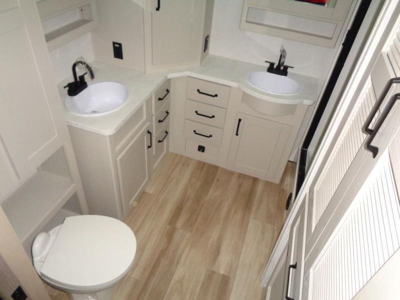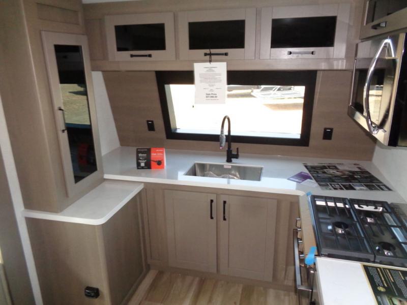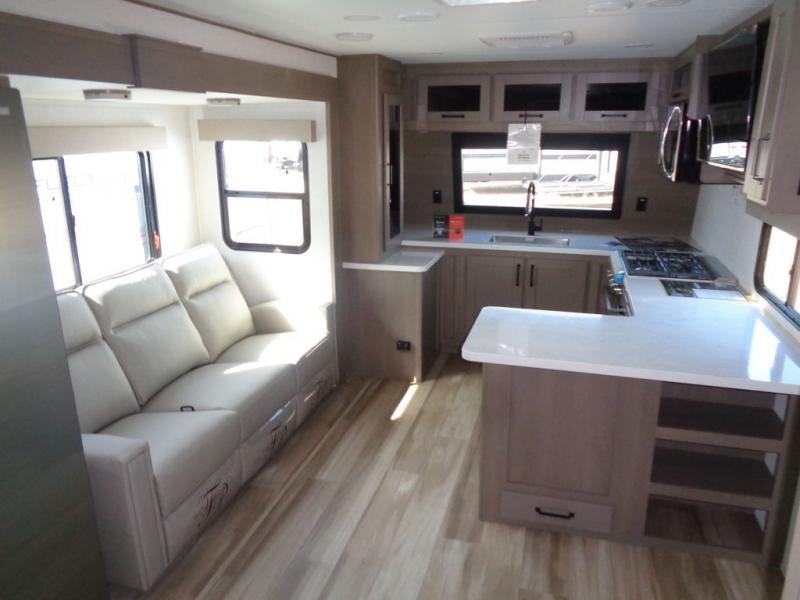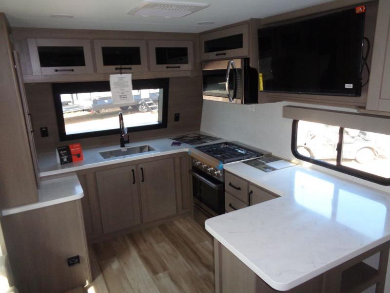 This front kitchen travel trailer will be perfect for camping trips to the lake or woods! There is ample counter space to prep your best meals, including an L-shaped kitchen counter with a bar stool to enjoy your coffee at. The theater seating is inviting, and you can choose the optional tri-fold sofa and end table or optional U-shaped dinette if you need more sleeping space for guests. This unit features a massive master bedroom with a queen bed slide and optional king bed, two closets, and a spacious rear bath. There are two bath sinks here, a 30" x 48" shower, plus washer and dryer prep if you choose to add these appliances!