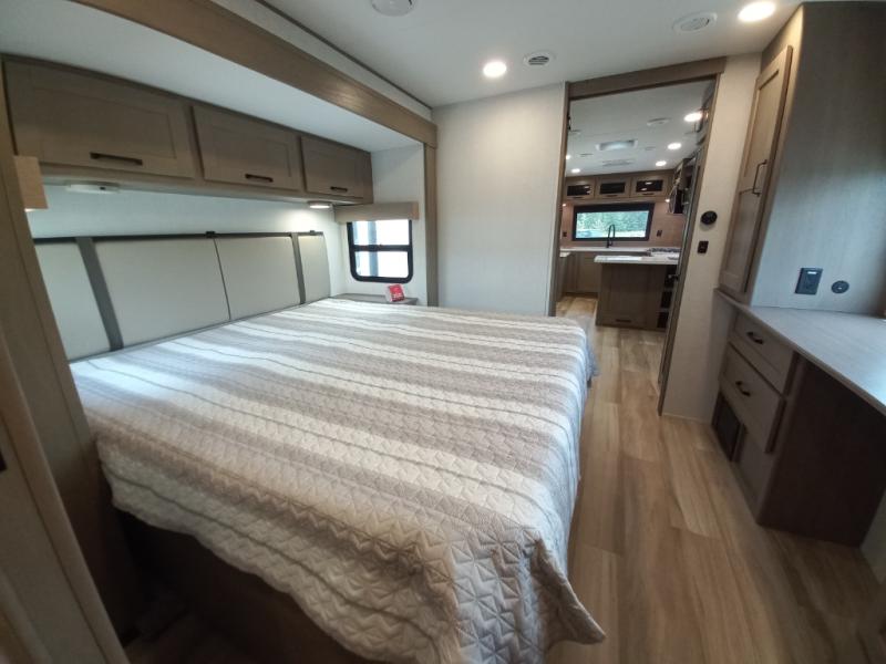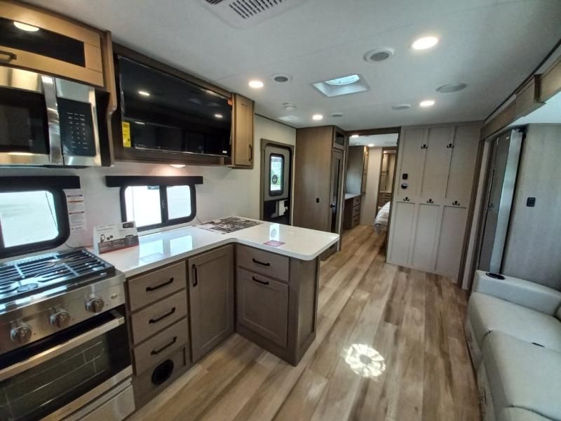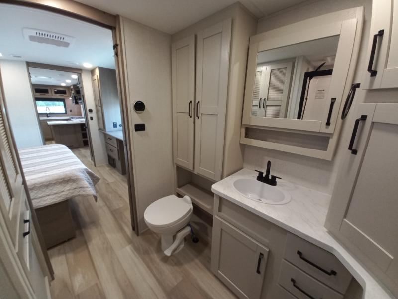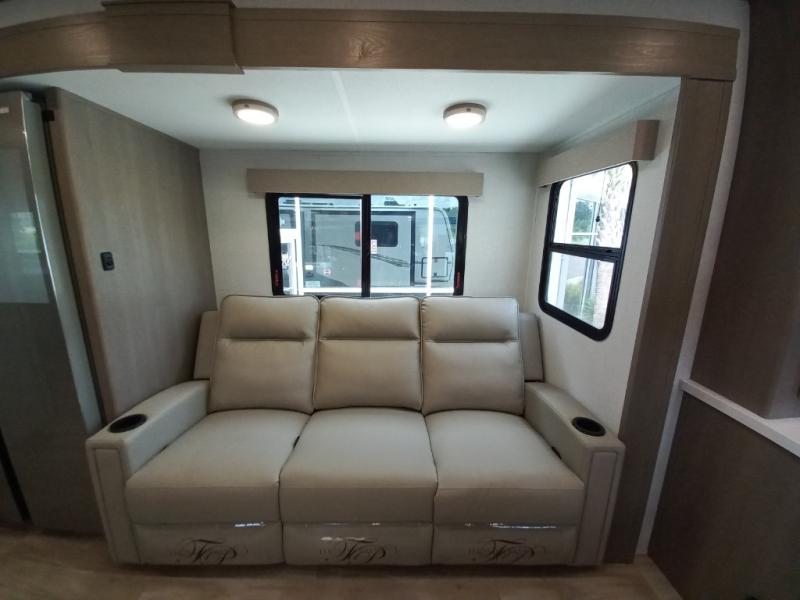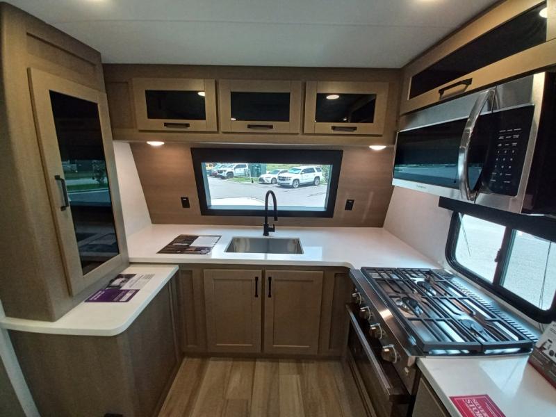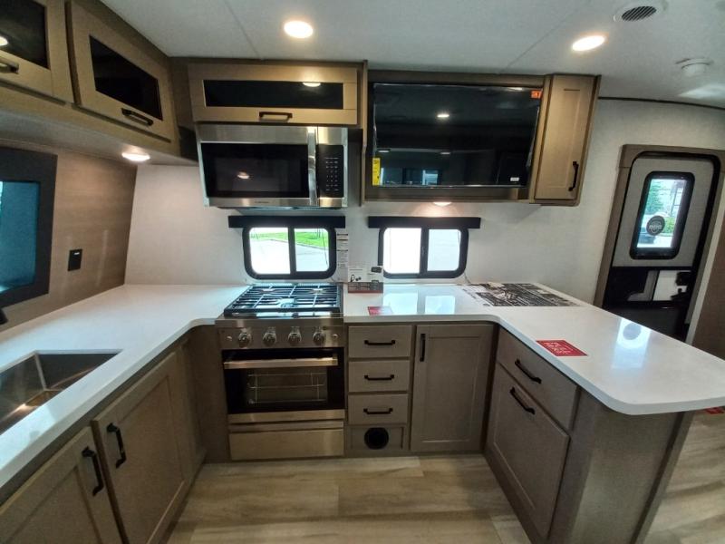 This front kitchen travel trailer will be perfect for camping trips to the lake or woods! There is ample counter space to prep your best meals, including an L-shaped kitchen counter with a bar stool to enjoy your coffee at. The theater seating is inviting, and you can choose the optional tri-fold sofa and end table or optional U-shaped dinette if you need more sleeping space for guests. This unit features a massive master bedroom with a queen bed slide and optional king bed, two closets, and a spacious rear bath. There are two bath sinks here, a 30" x 48" shower, plus washer and dryer prep if you choose to add these appliances!