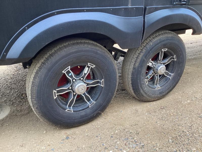 Rear Living Area with tri-fold sofa, theater seating, entertainment center, and fireplace