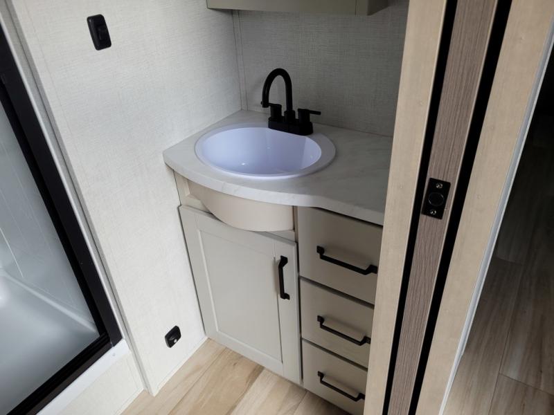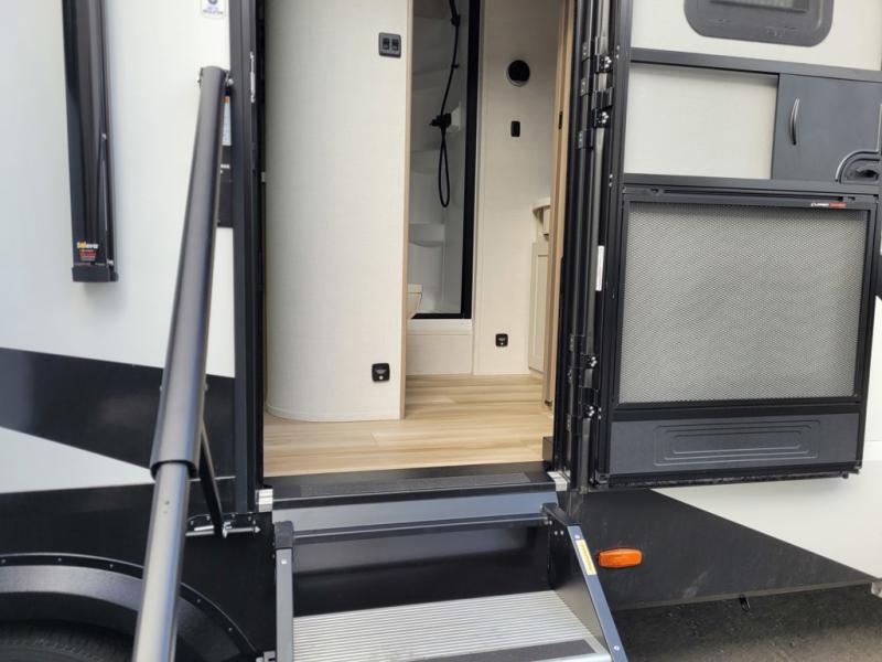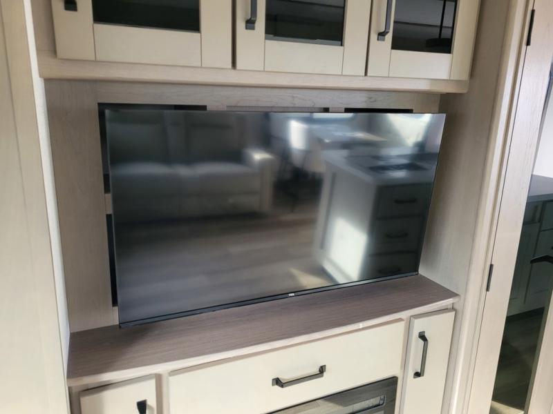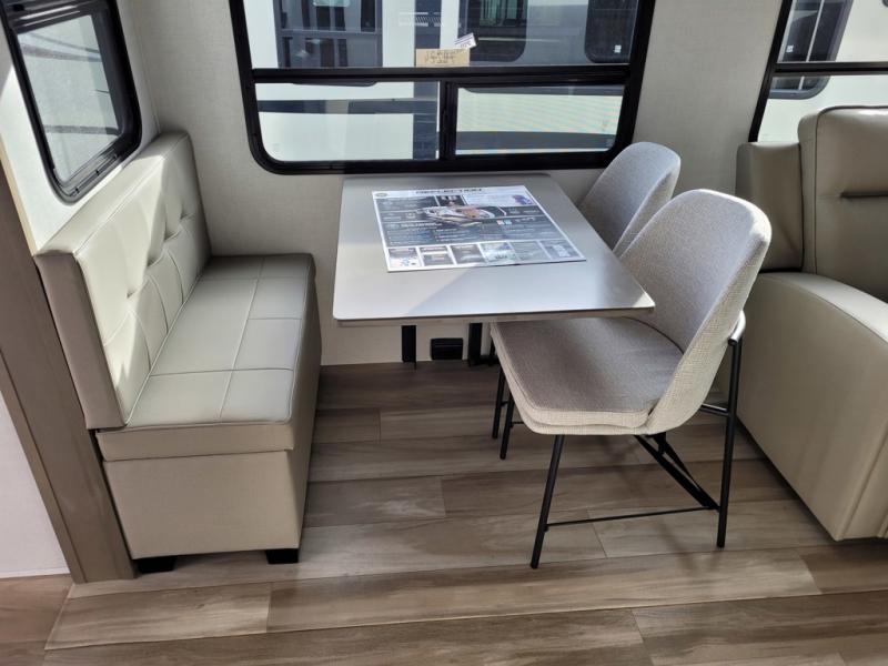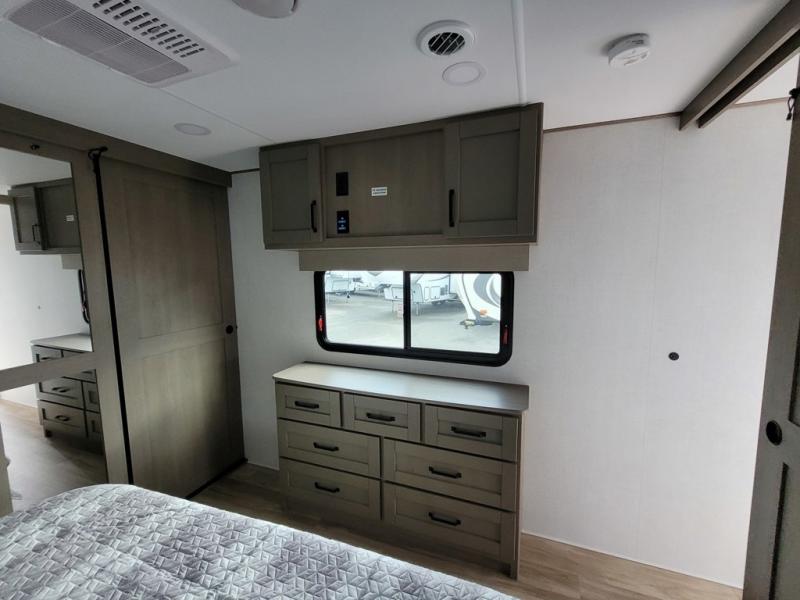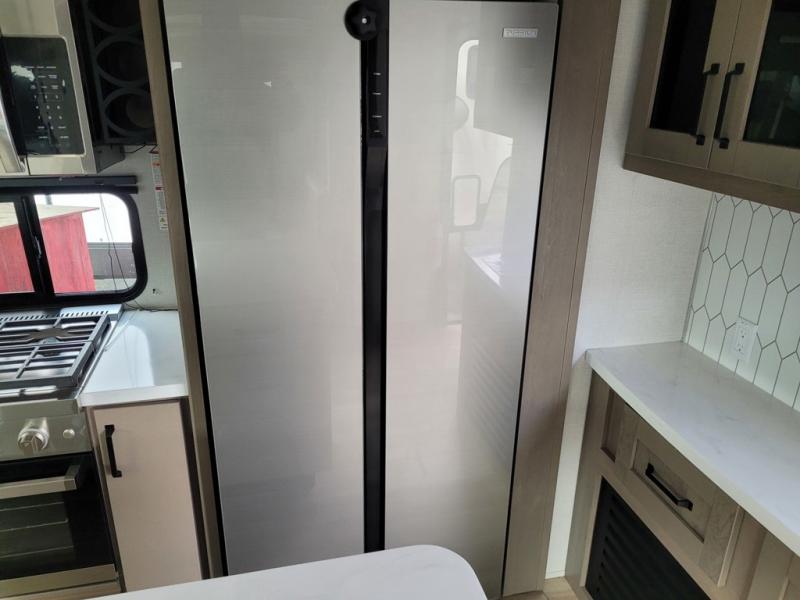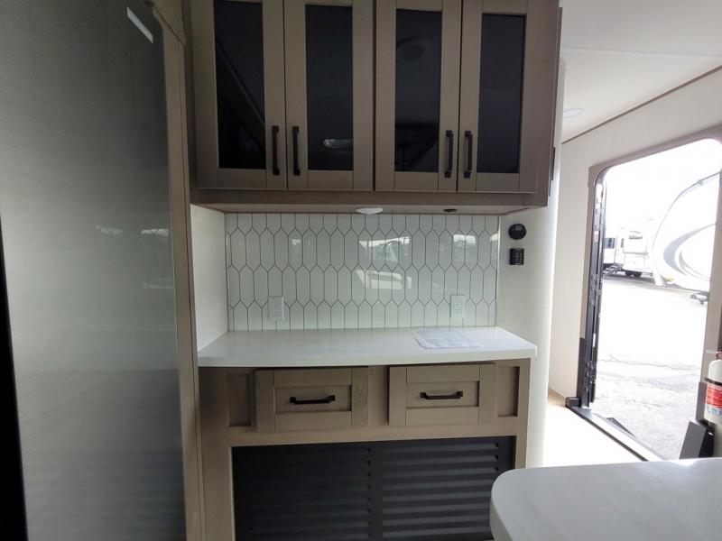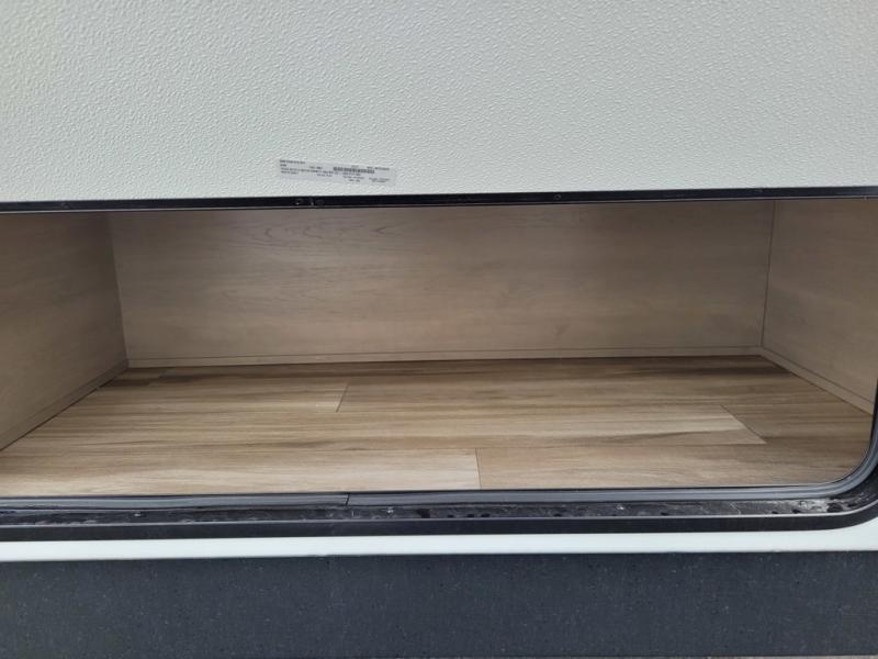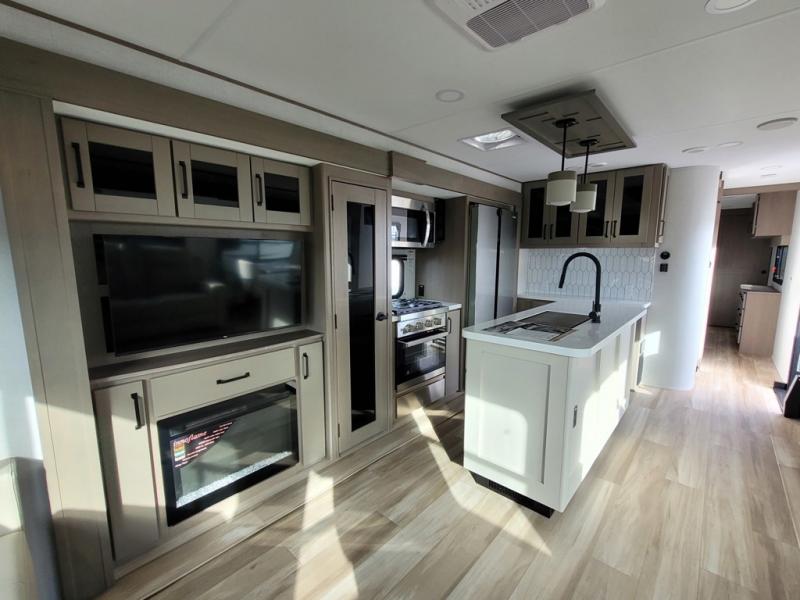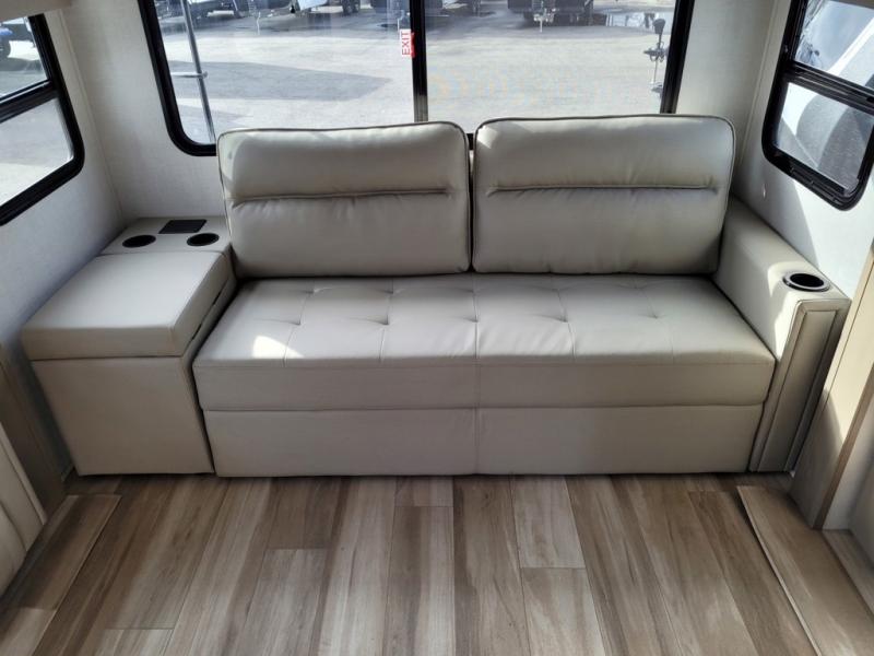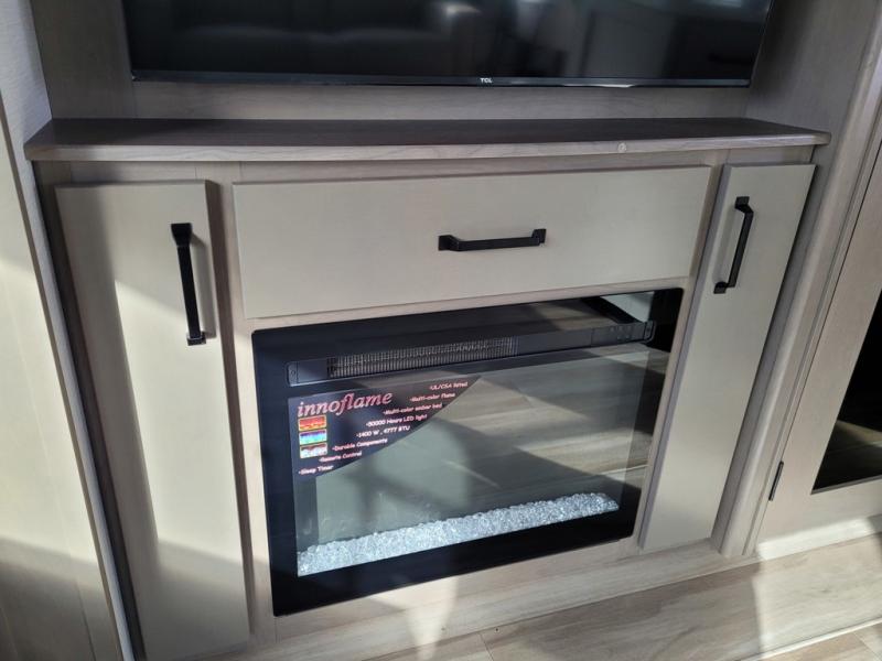 This rear living travel trailer will be perfect for extended stays at the campground or quick weekend trips to the lake! Once you've unloaded your gear from the pass-thru storage, head inside to relax on the rear tri-fold sofa with an adjustable headrest or on the theater seating across from the 40" TV and fireplace. There is also a booth dinette where you can dine together, or you can choose the optional swivel dinette. The spacious kitchen island will make meal time easier than ever, plus there is a pantry and 16 cu. ft. 12V refrigerator for food storage. The full bath is right next to the front private bedroom for easy nighttime use, and speaking of nighttime, you're sure to sleep soundly on the queen bed slide. There is also a large front closet, TV prep, plus washer and dryer prep if you choose to add these appliances.