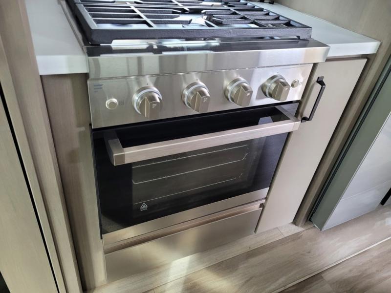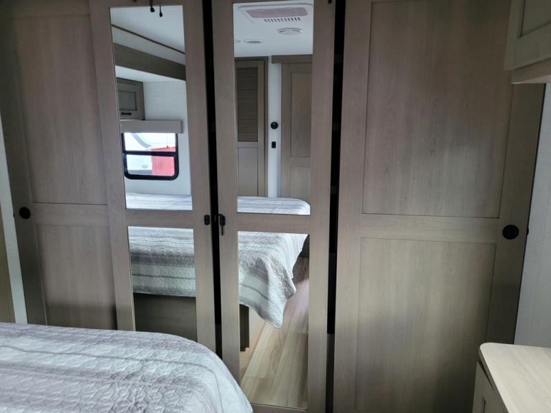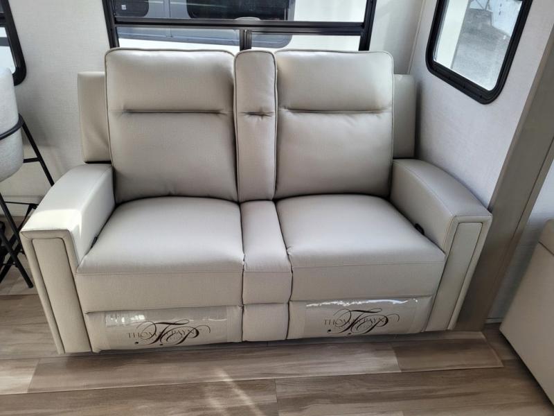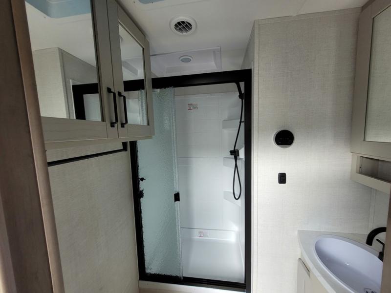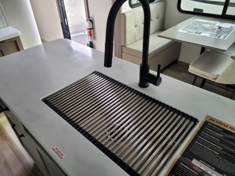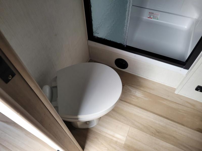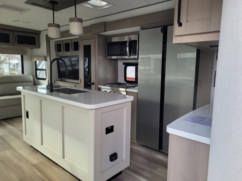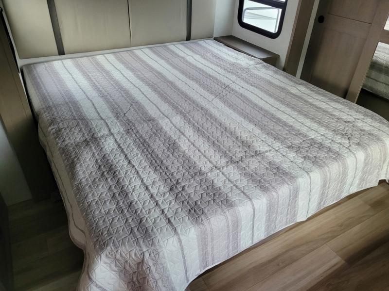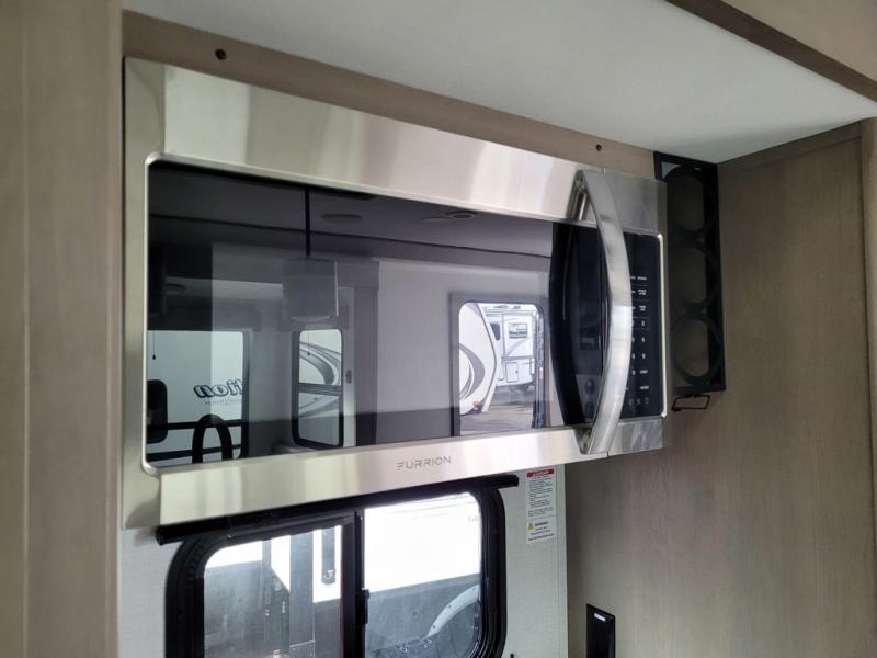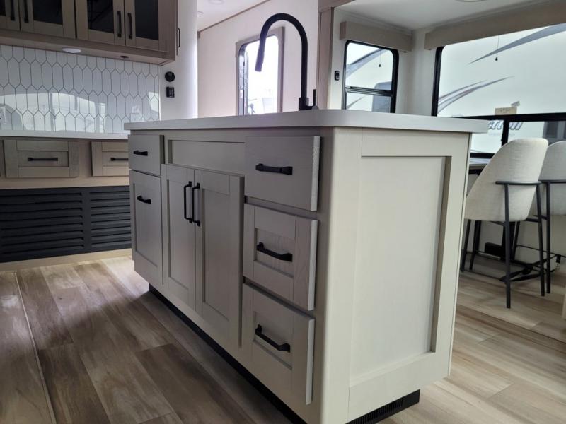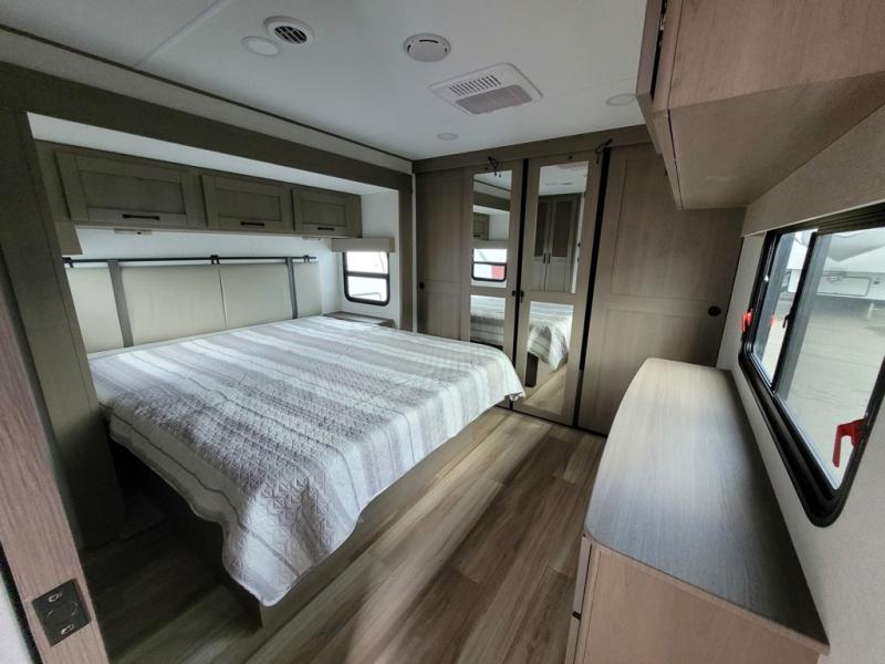 This rear living travel trailer will be perfect for extended stays at the campground or quick weekend trips to the lake! Once you've unloaded your gear from the pass-thru storage, head inside to relax on the rear tri-fold sofa with an adjustable headrest or on the theater seating across from the 40" TV and fireplace. There is also a booth dinette where you can dine together, or you can choose the optional swivel dinette. The spacious kitchen island will make meal time easier than ever, plus there is a pantry and 16 cu. ft. 12V refrigerator for food storage. The full bath is right next to the front private bedroom for easy nighttime use, and speaking of nighttime, you're sure to sleep soundly on the queen bed slide. There is also a large front closet, TV prep, plus washer and dryer prep if you choose to add these appliances.