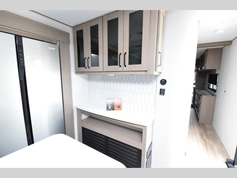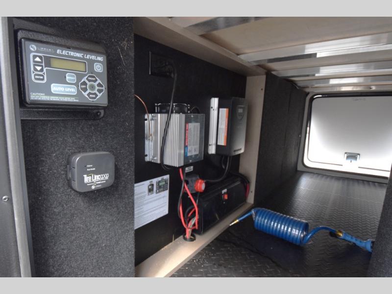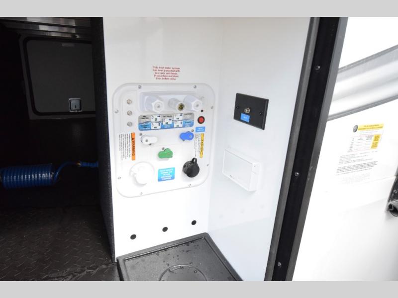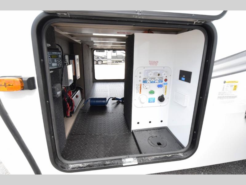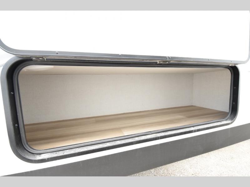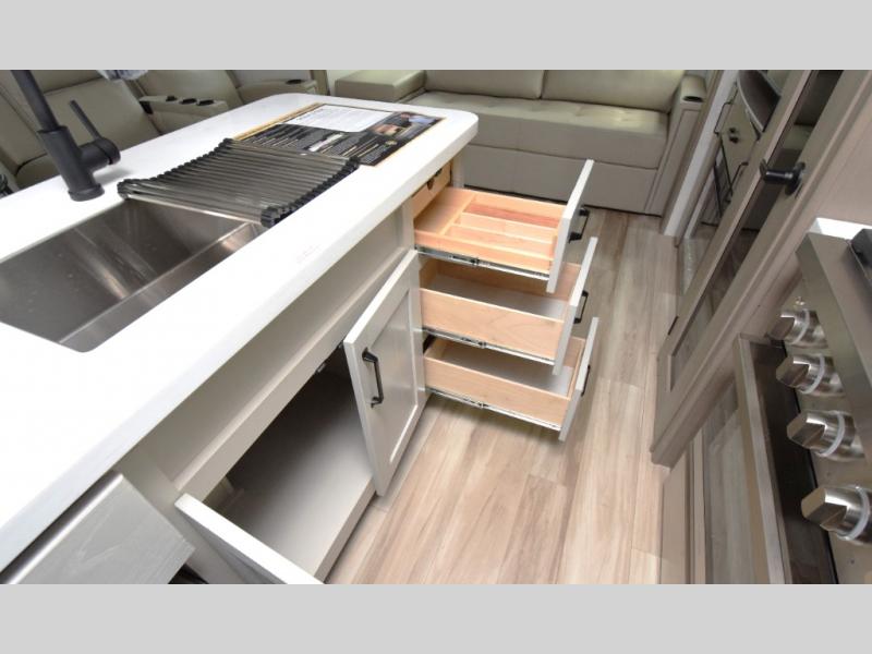 Residential cabinetry, metal slam-latch baggage doors, and an all-in-one docking station for clean, efficient utility access