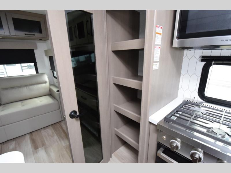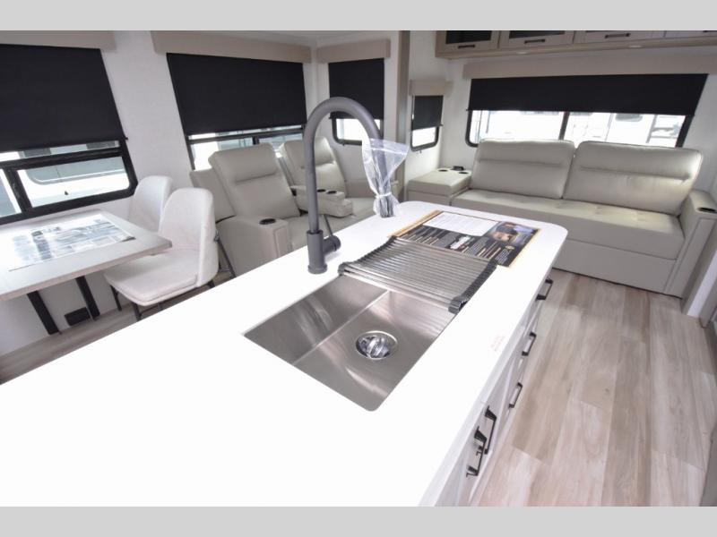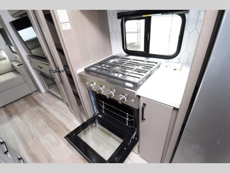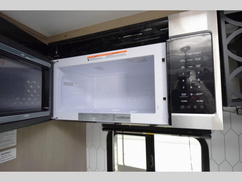30" stainless steel microwave, 21" Furrion range with Piezo ignition, and a deep farmhouse-style sink with pullout sprayer