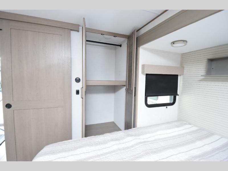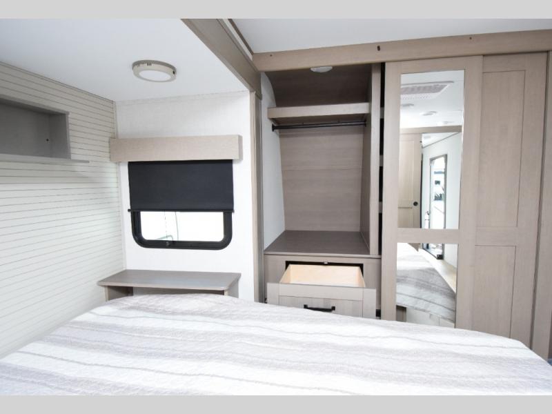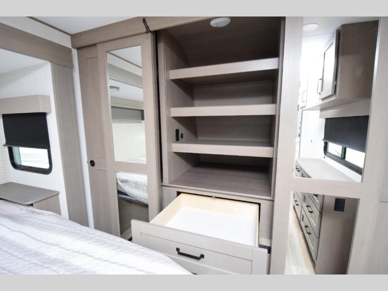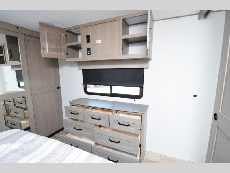 Generous wardrobe closet and dresser drawers provide space for extended stays or full-time living