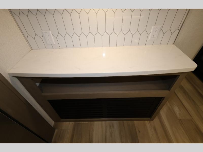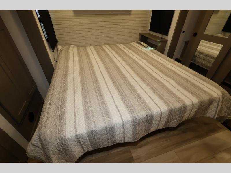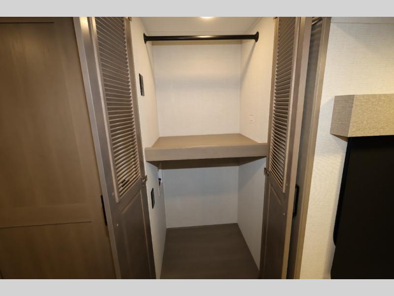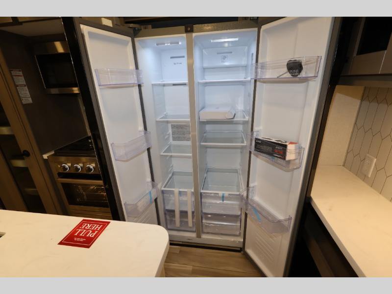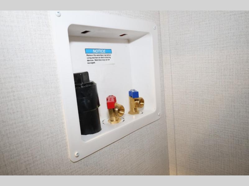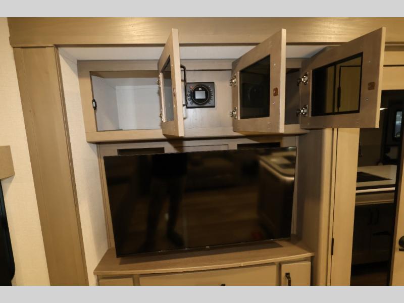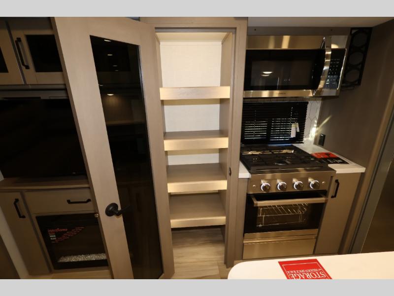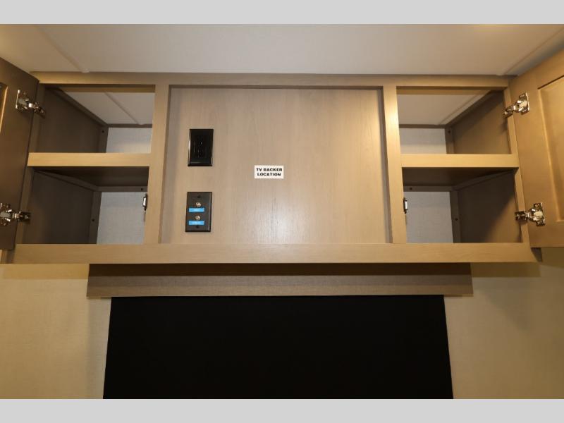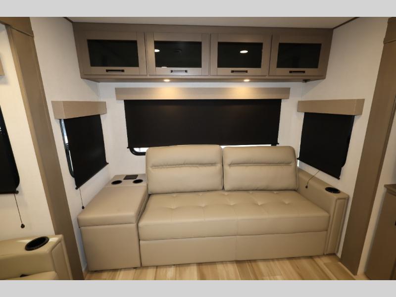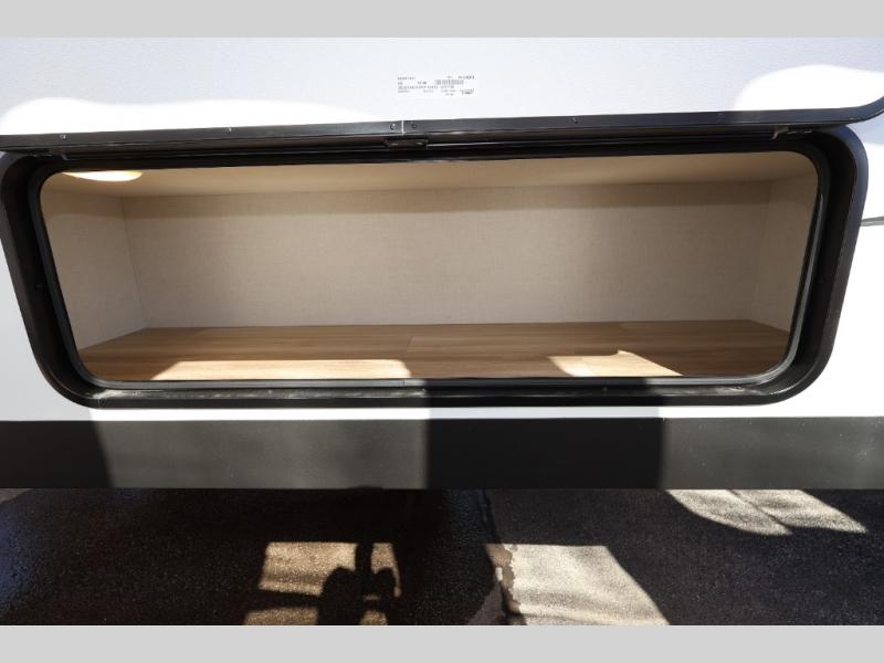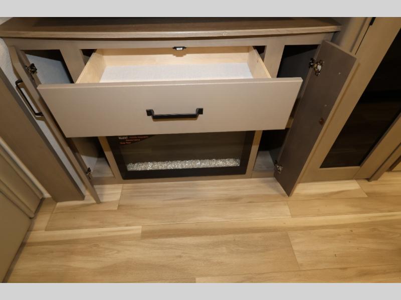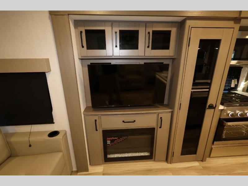 This rear living travel trailer will be perfect for extended stays at the campground or quick weekend trips to the lake! Once you've unloaded your gear from the pass-thru storage, head inside to relax on the rear tri-fold sofa with an adjustable headrest or on the theater seating across from the 40" TV and fireplace. There is also a booth dinette where you can dine together, or you can choose the optional swivel dinette. The spacious kitchen island will make meal time easier than ever, plus there is a pantry and 16 cu. ft. 12V refrigerator for food storage. The full bath is right next to the front private bedroom for easy nighttime use, and speaking of nighttime, you're sure to sleep soundly on the queen bed slide. There is also a large front closet, TV prep, plus washer and dryer prep if you choose to add these appliances.