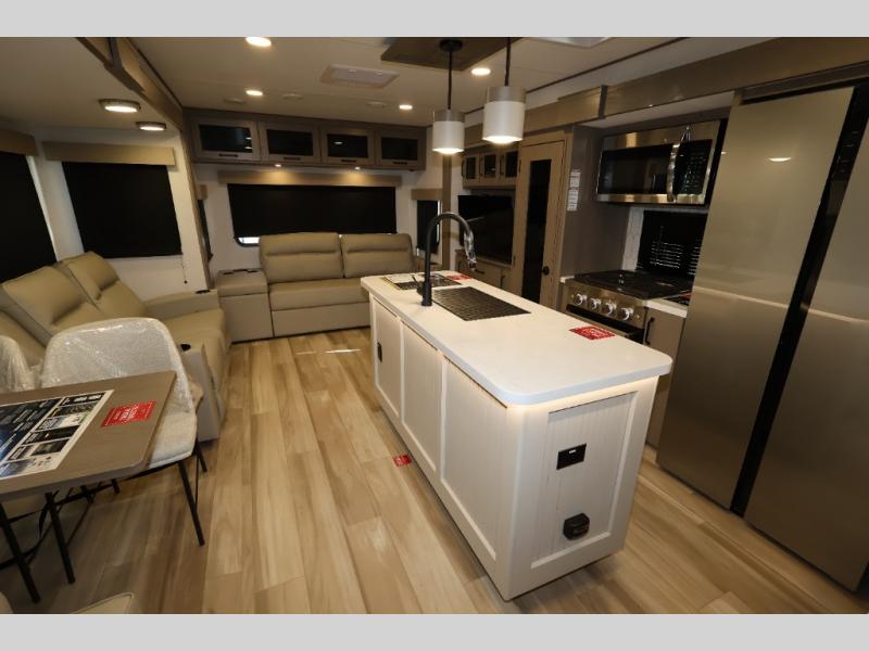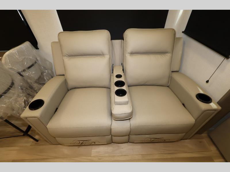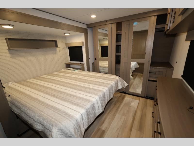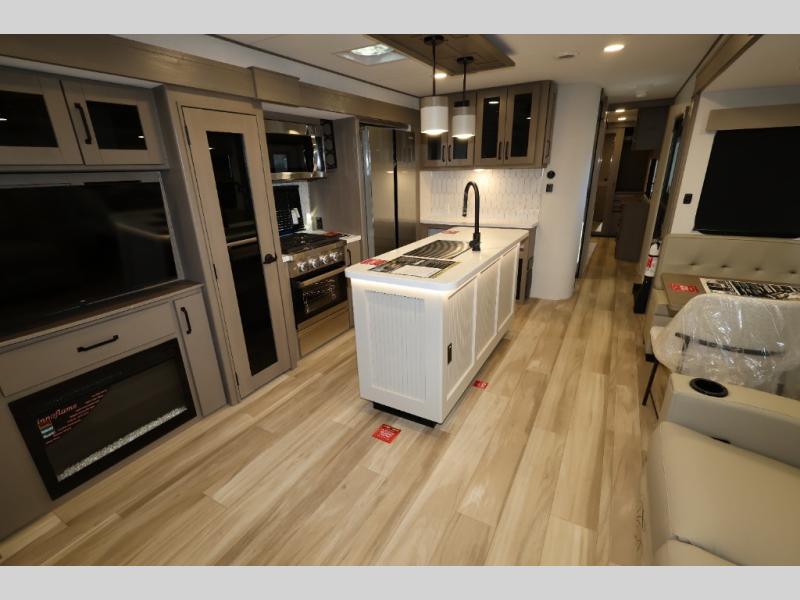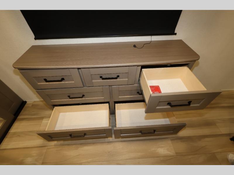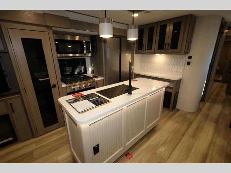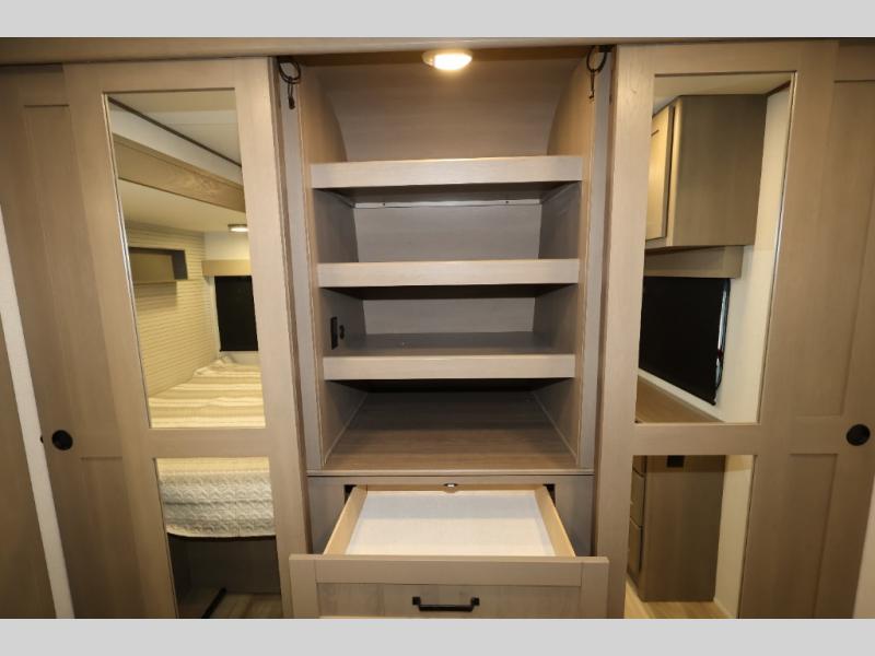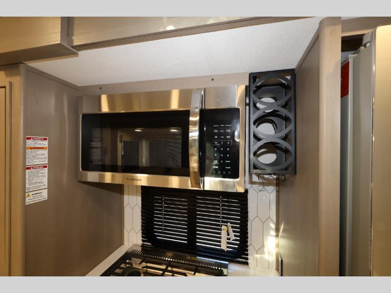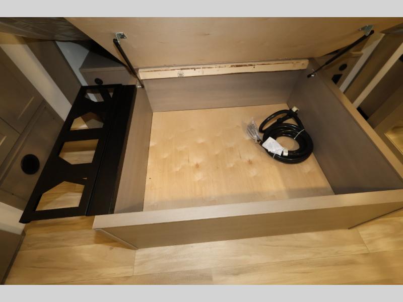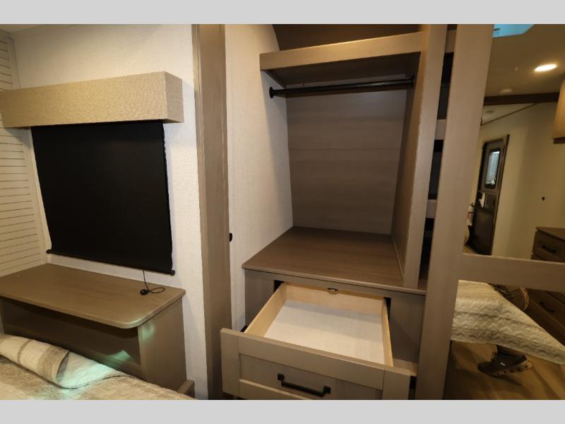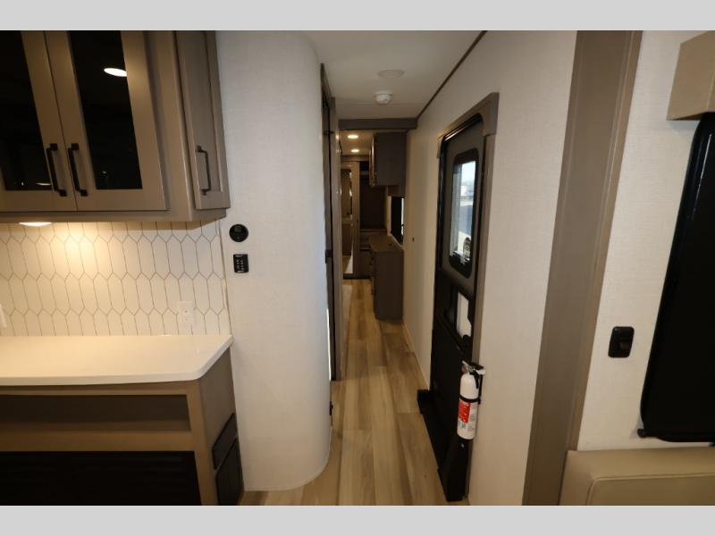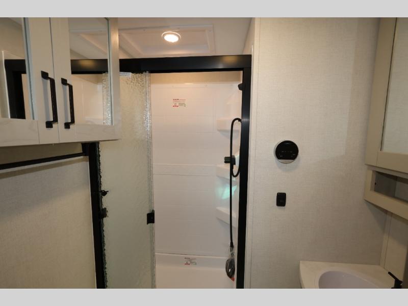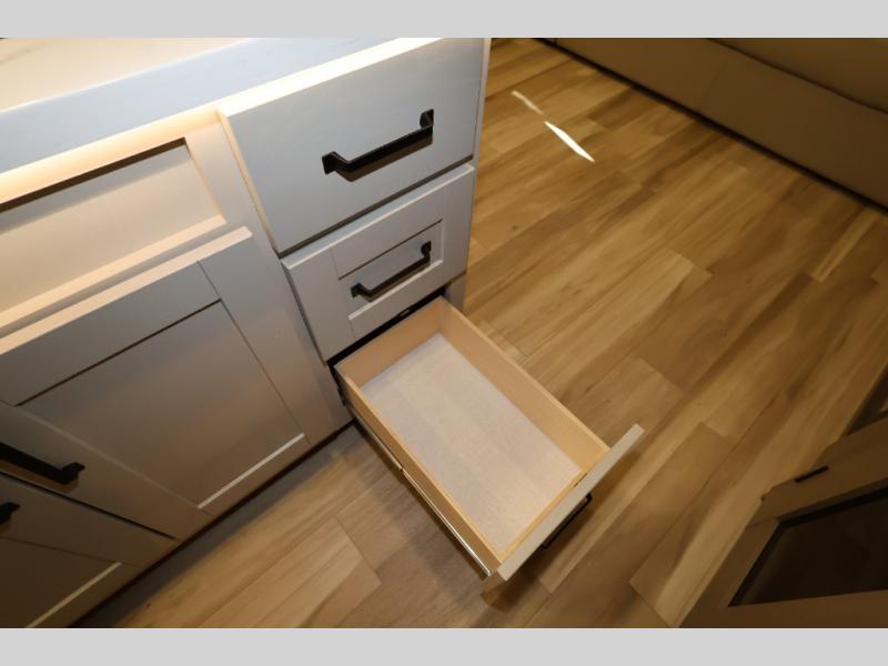This rear living travel trailer will be perfect for extended stays at the campground or quick weekend trips to the lake! Once you've unloaded your gear from the pass-thru storage, head inside to relax on the rear tri-fold sofa with an adjustable headrest or on the theater seating across from the 40" TV and fireplace. There is also a booth dinette where you can dine together, or you can choose the optional swivel dinette. The spacious kitchen island will make meal time easier than ever, plus there is a pantry and 16 cu. ft. 12V refrigerator for food storage. The full bath is right next to the front private bedroom for easy nighttime use, and speaking of nighttime, you're sure to sleep soundly on the queen bed slide. There is also a large front closet, TV prep, plus washer and dryer prep if you choose to add these appliances.