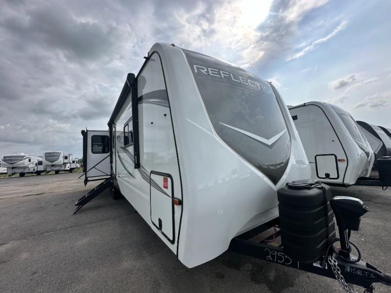 With any Reflection travel trailer by Grand Design, you will have a solar panel for off-grid camping and a 60 amp charge controller and inverter prep, a Universal All-In-One docking station, unobstructed pass-through storage, and Goodyear Endurance tires. Each is constructed of gel coat exterior sidewalls, residential 5" truss rafters, walk-on roof decking, a fiberglass and radiant foil roof and front cap insulation plus laminated aluminum framed side walls, roof and end walls in slide rooms. Head inside to enjoy residential hardwood cabinet doors, premium Congoleum flooring, a spacious shower with a glass door, and many more comforts!