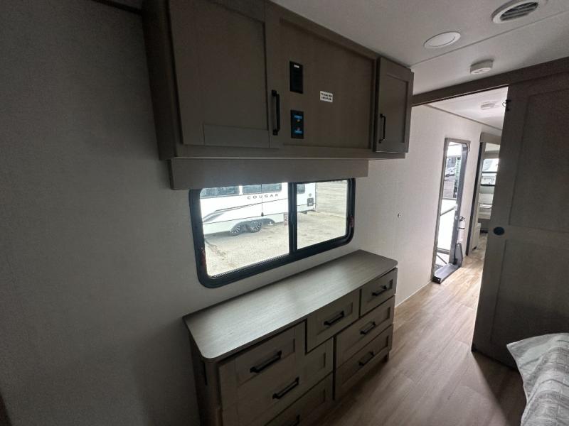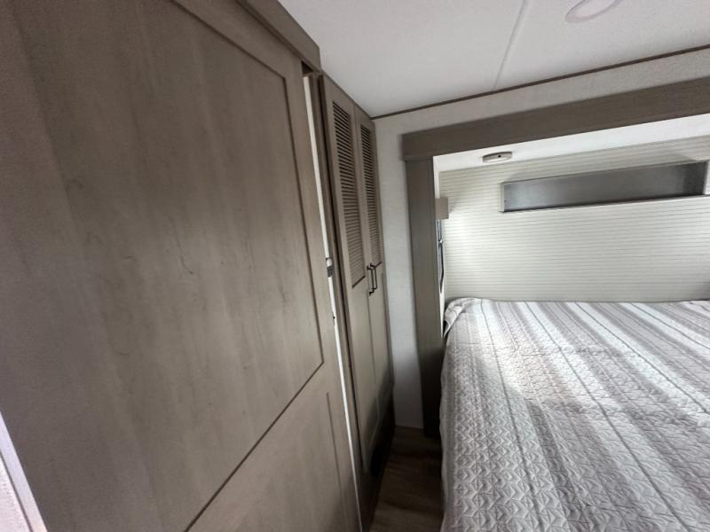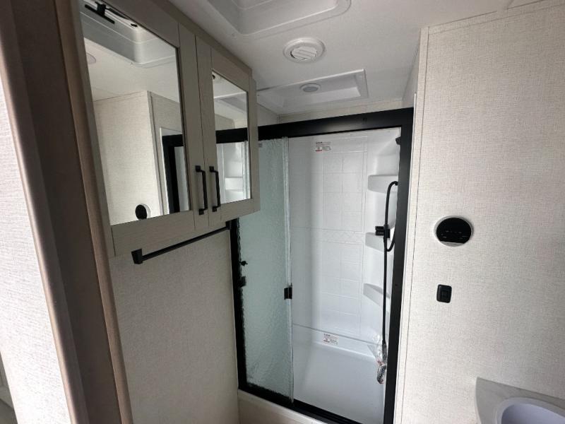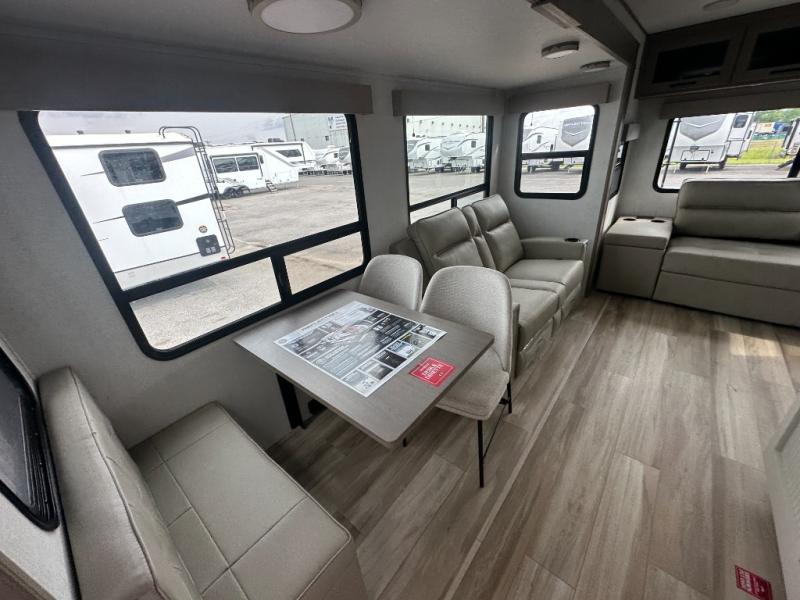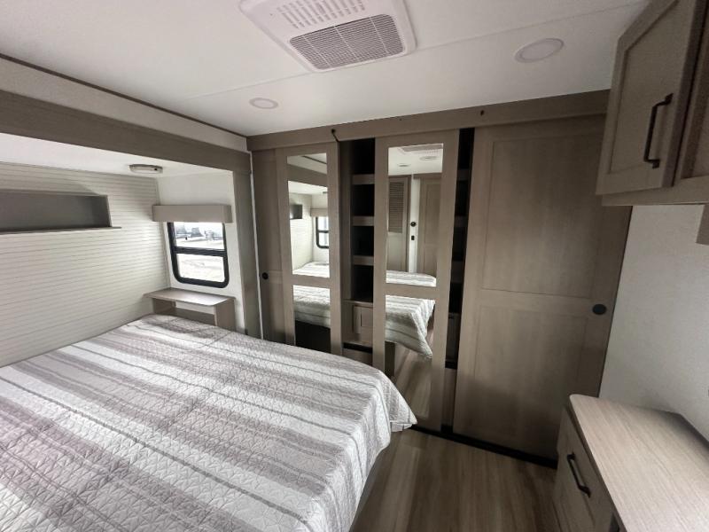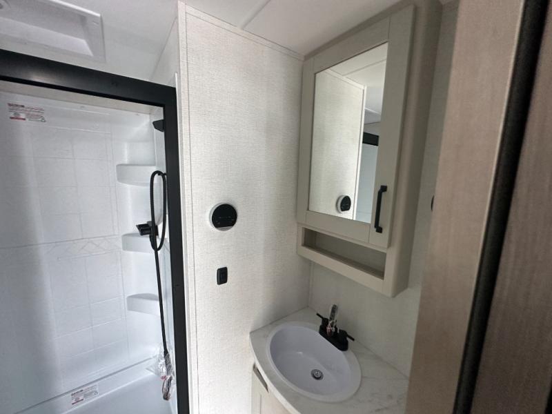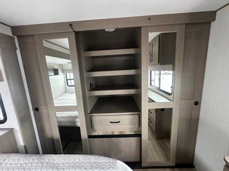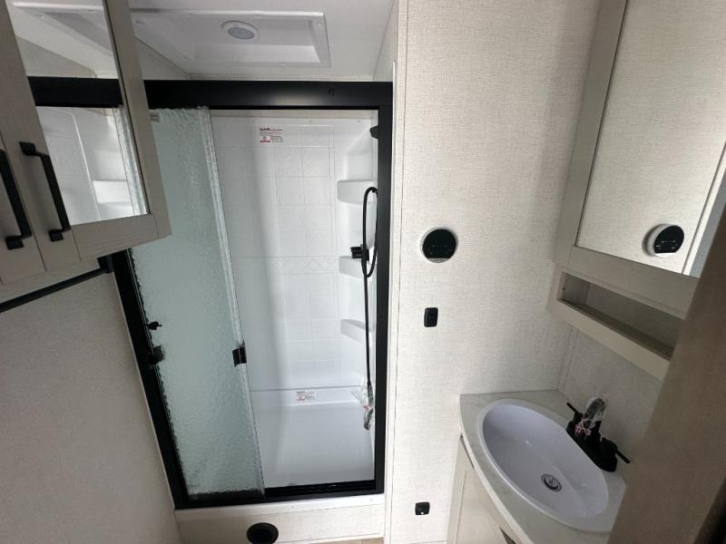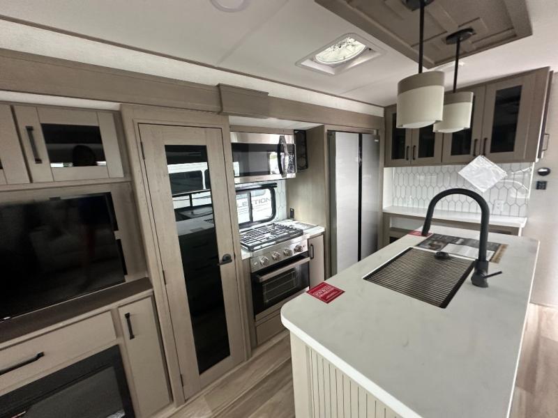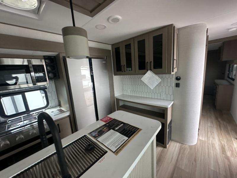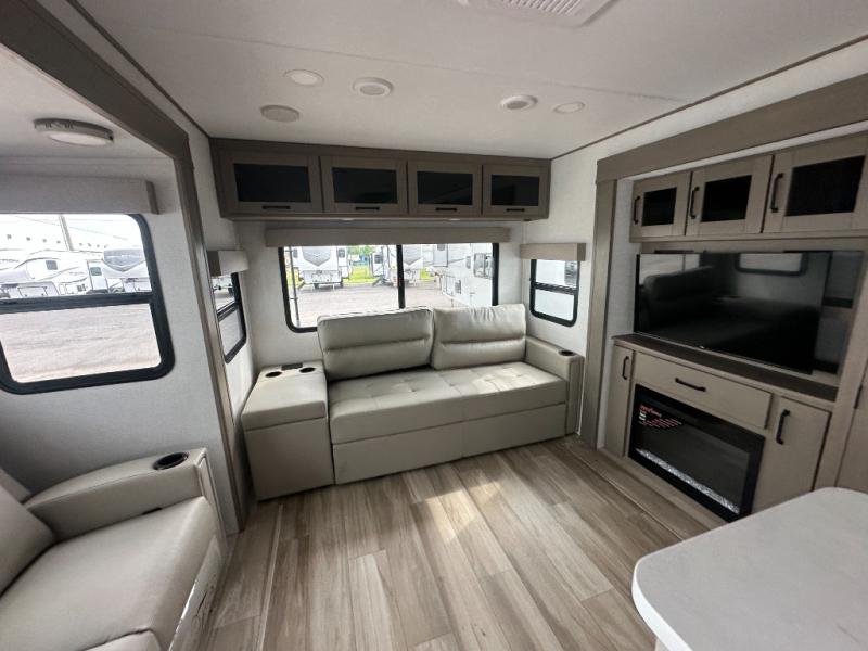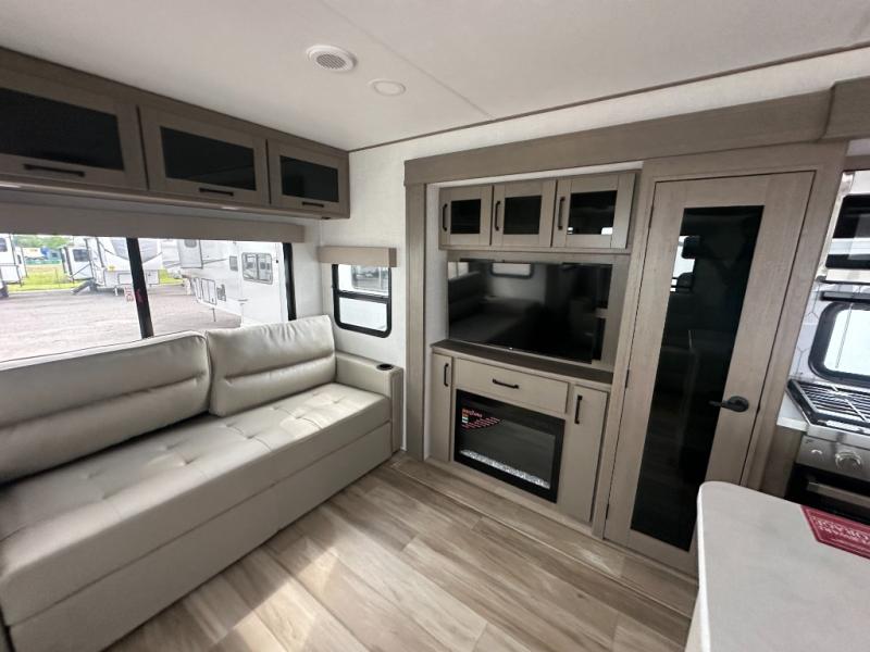 This rear living travel trailer will be perfect for extended stays at the campground or quick weekend trips to the lake! Once you've unloaded your gear from the pass-thru storage, head inside to relax on the rear tri-fold sofa with an adjustable headrest or on the theater seating across from the 40" TV and fireplace. There is also a booth dinette where you can dine together, or you can choose the optional swivel dinette. The spacious kitchen island will make meal time easier than ever, plus there is a pantry and 16 cu. ft. 12V refrigerator for food storage. The full bath is right next to the front private bedroom for easy nighttime use, and speaking of nighttime, you're sure to sleep soundly on the queen bed slide. There is also a large front closet, TV prep, plus washer and dryer prep if you choose to add these appliances.