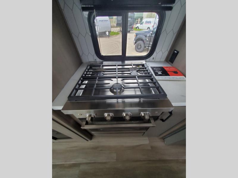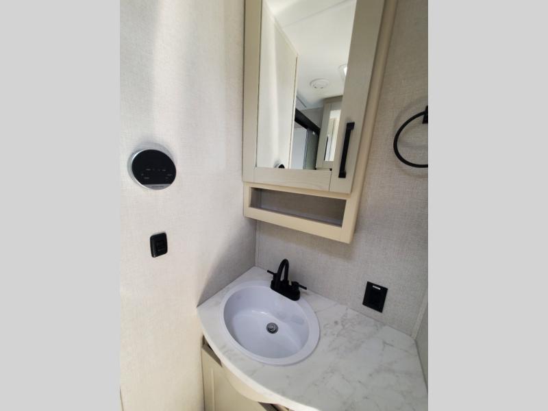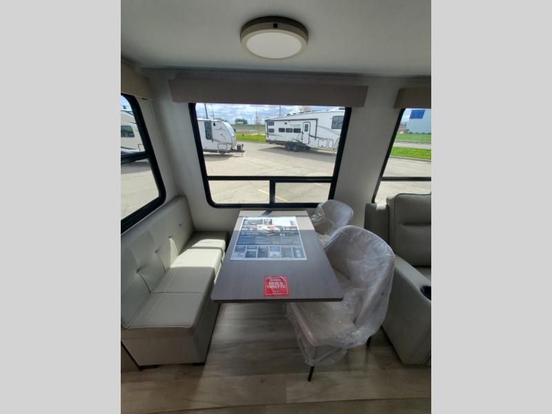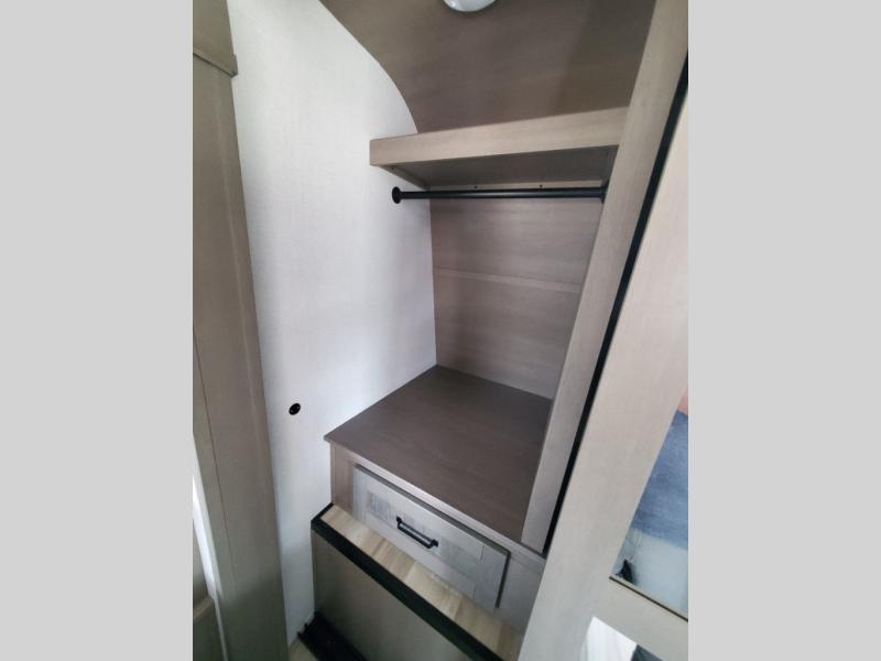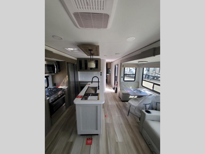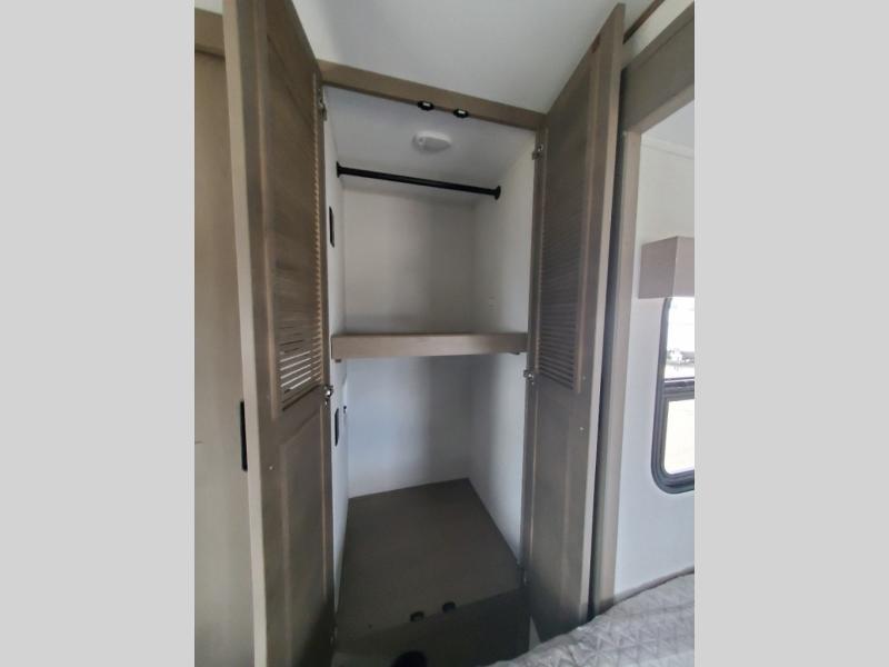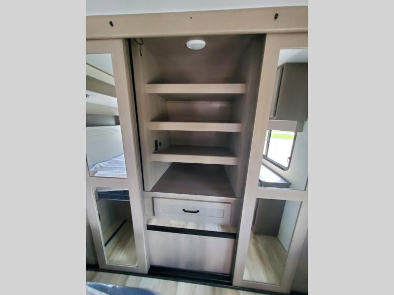 This rear living travel trailer will be perfect for extended stays at the campground or quick weekend trips to the lake! Once you've unloaded your gear from the pass-thru storage, head inside to relax on the rear tri-fold sofa with an adjustable headrest or on the theater seating across from the 40" TV and fireplace. There is also a booth dinette where you can dine together, or you can choose the optional swivel dinette. The spacious kitchen island will make meal time easier than ever, plus there is a pantry and 16 cu. ft. 12V refrigerator for food storage. The full bath is right next to the front private bedroom for easy nighttime use, and speaking of nighttime, you're sure to sleep soundly on the queen bed slide. There is also a large front closet, TV prep, plus washer and dryer prep if you choose to add these appliances.