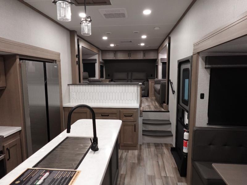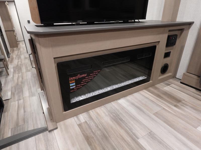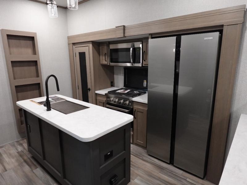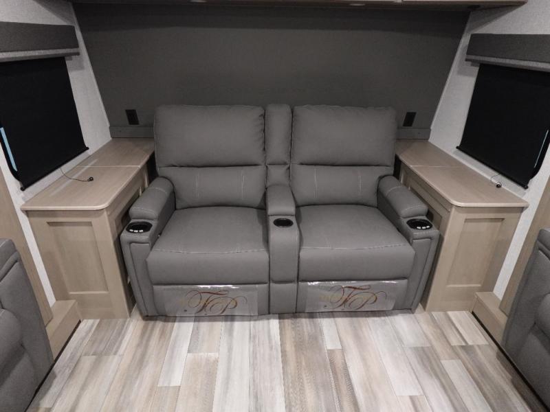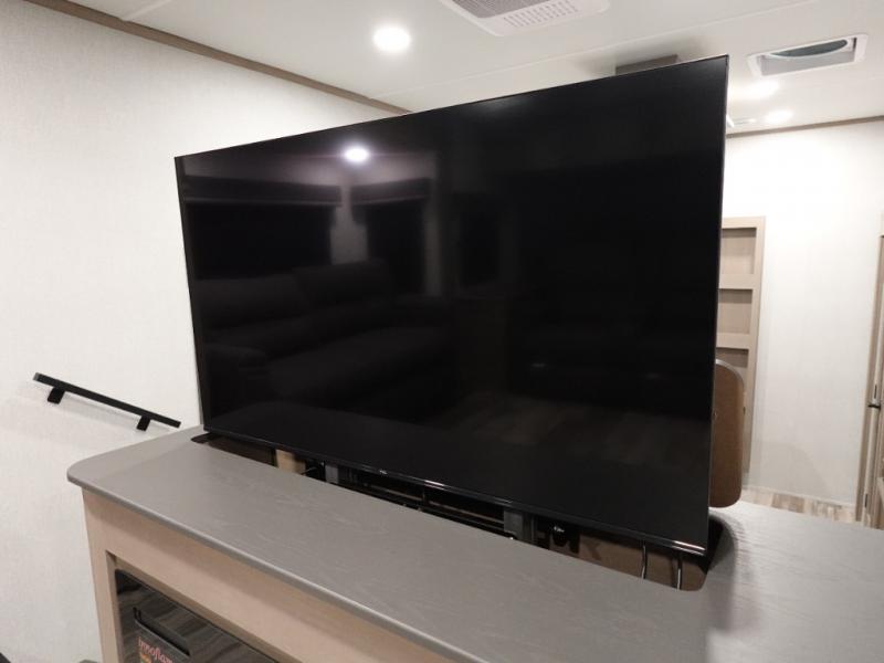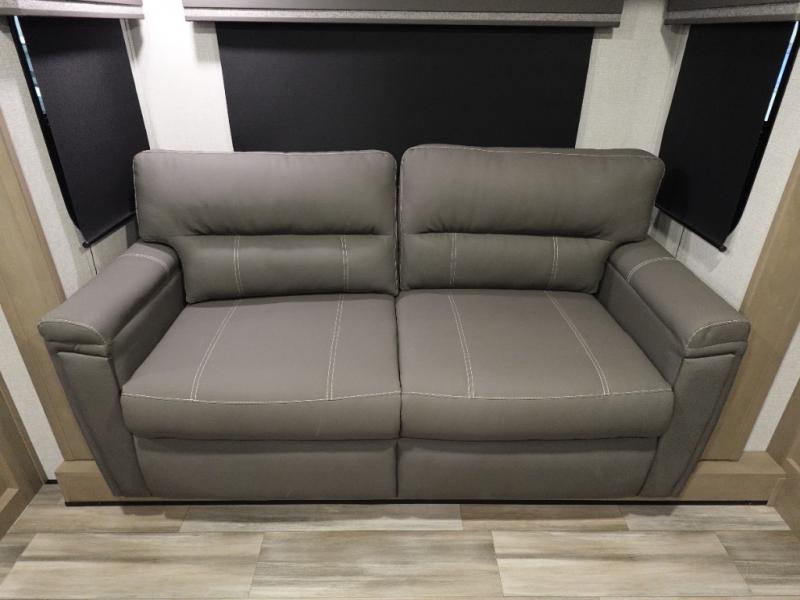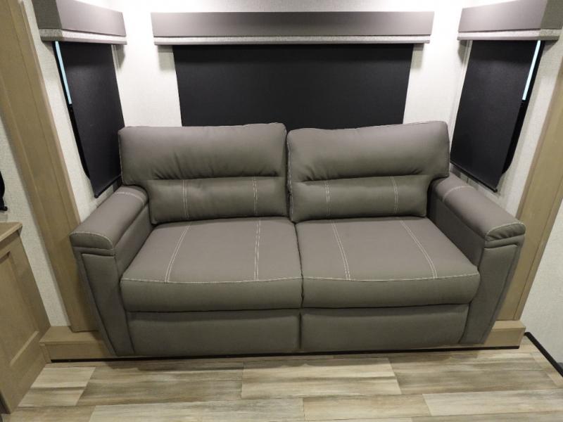 This fifth wheel might be your perfect retreat! The private rear bedroom comes with a standard queen bed, or upgrade to a king for even more room to relax. Up front you'll find a living room perfect for entertaining, with dual tri-fold sofas plus a pair of theater seats. The focal point is the entertainment center which is equipped with a 50" TV on a lift. The central kitchen is well-equipped for cooking, with a 16 cu. ft. refrigerator and a center island. A dinette provides great seating.