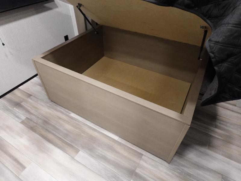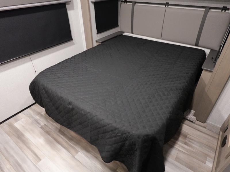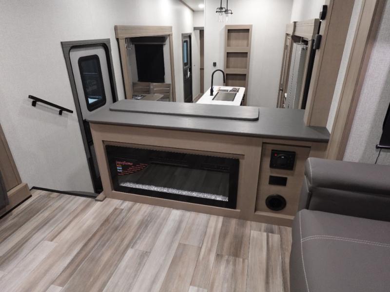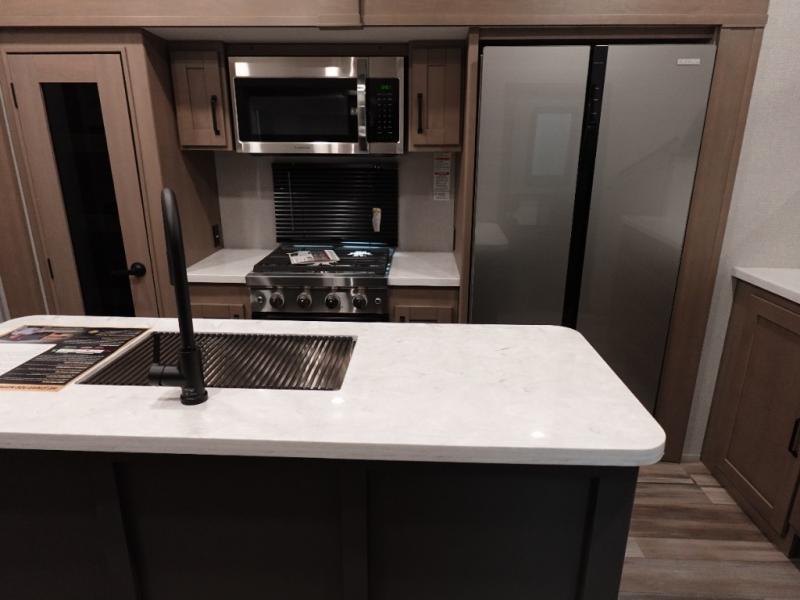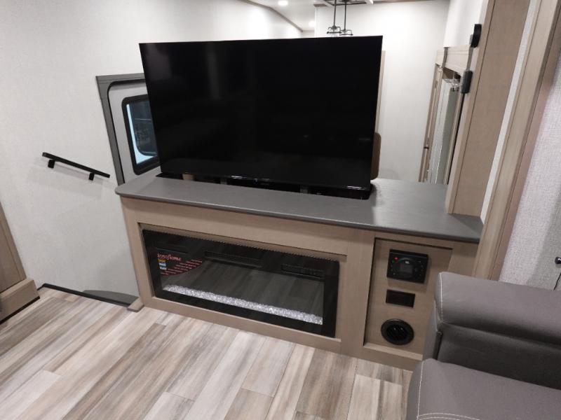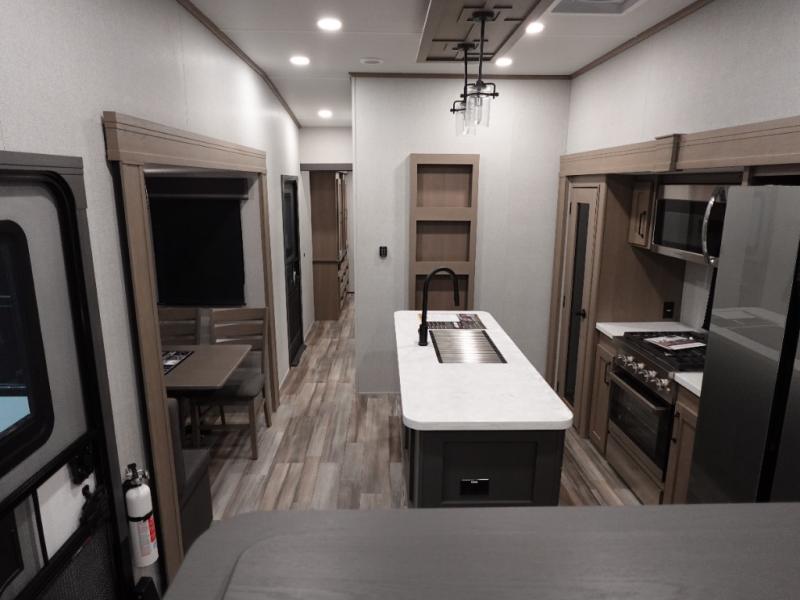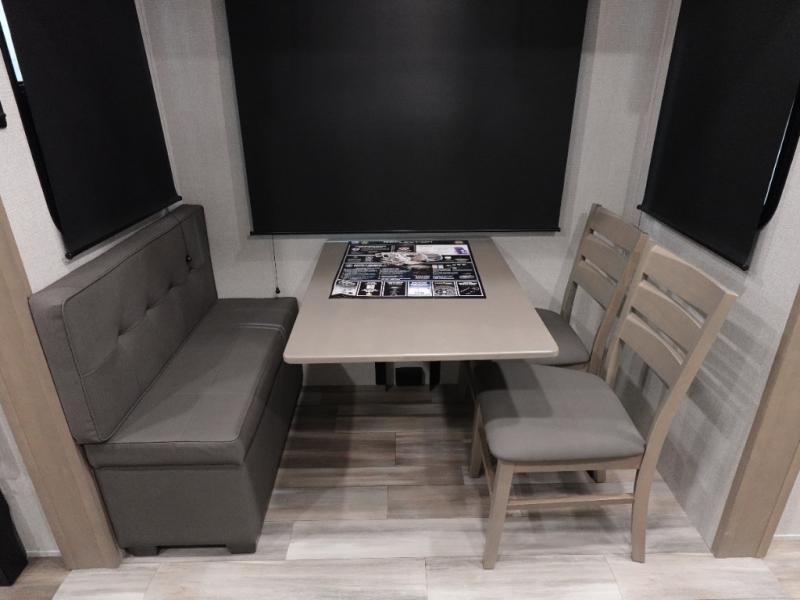 This fifth wheel might be your perfect retreat! The private rear bedroom comes with a standard queen bed, or upgrade to a king for even more room to relax. Up front you'll find a living room perfect for entertaining, with dual tri-fold sofas plus a pair of theater seats. The focal point is the entertainment center which is equipped with a 50" TV on a lift. The central kitchen is well-equipped for cooking, with a 16 cu. ft. refrigerator and a center island. A dinette provides great seating.