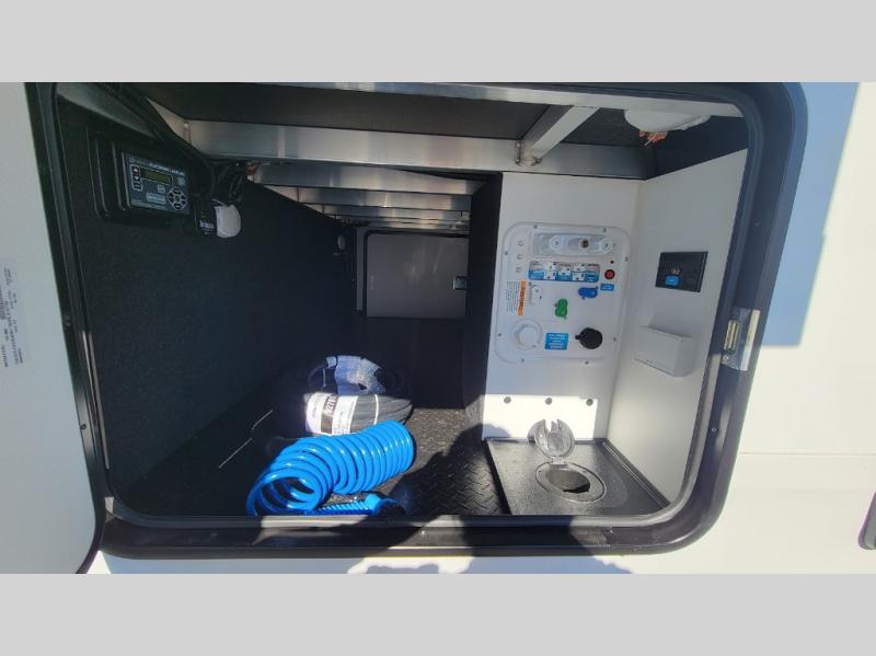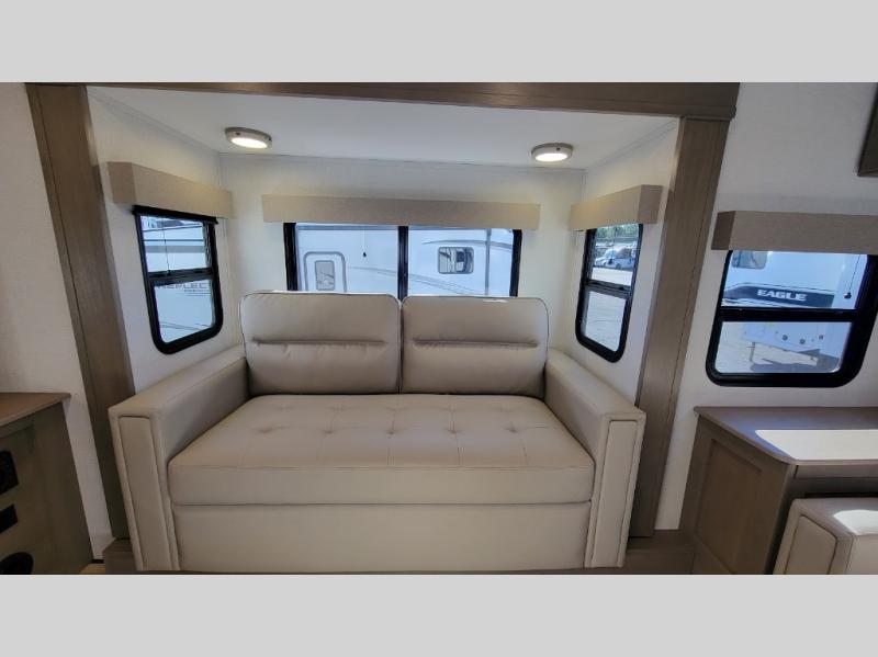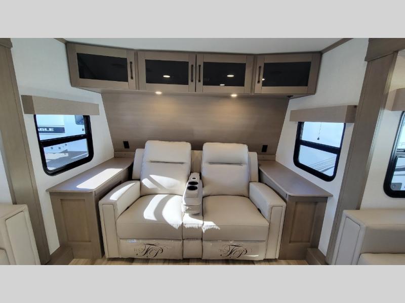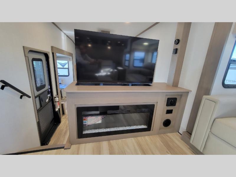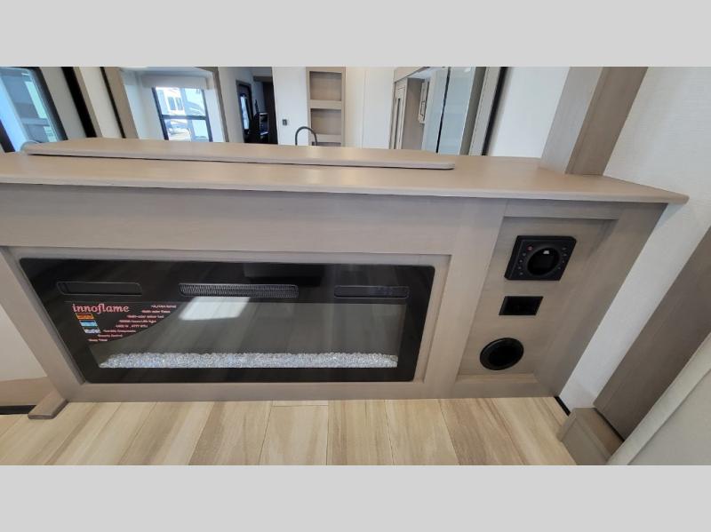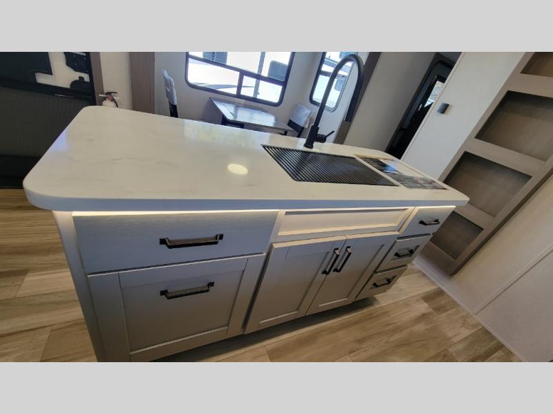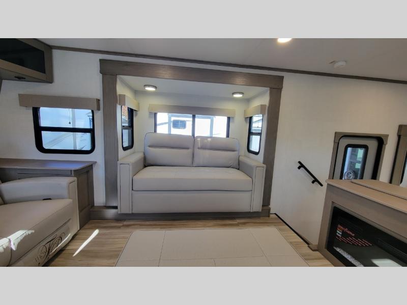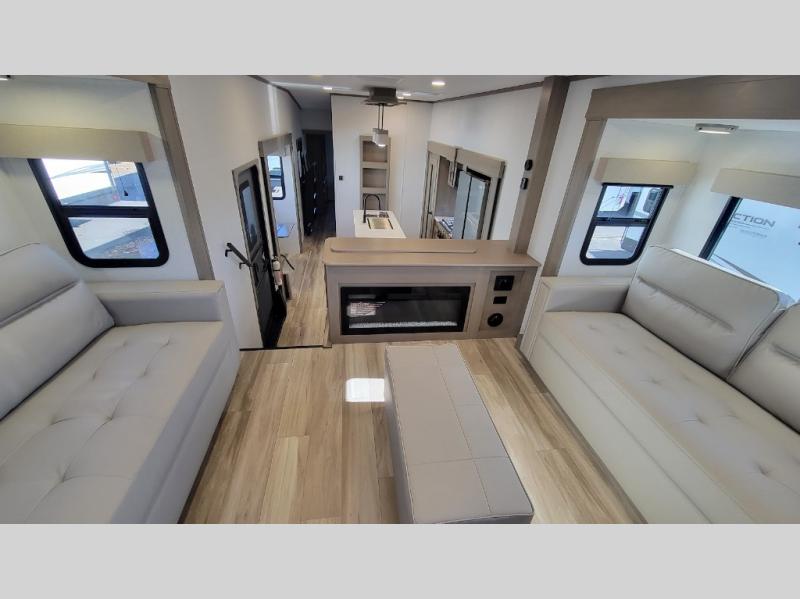 This fifth wheel might be your perfect retreat! The private rear bedroom comes with a standard queen bed, or upgrade to a king for even more room to relax. Up front you'll find a living room perfect for entertaining, with dual tri-fold sofas plus a pair of theater seats. The focal point is the entertainment center which is equipped with a 50" TV on a lift. The central kitchen is well-equipped for cooking, with a 16 cu. ft. refrigerator and a center island. A booth dinette provides great seating, or opt for the swivel dinette.