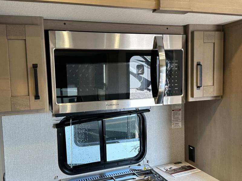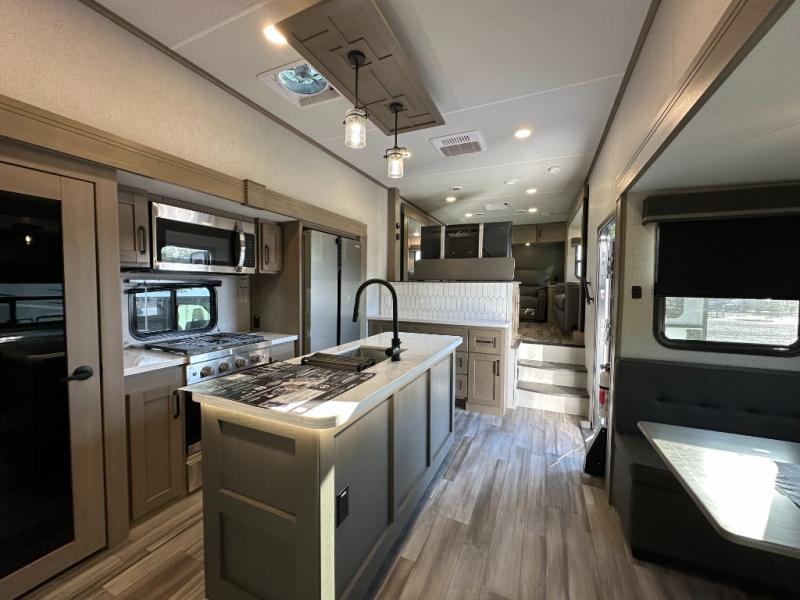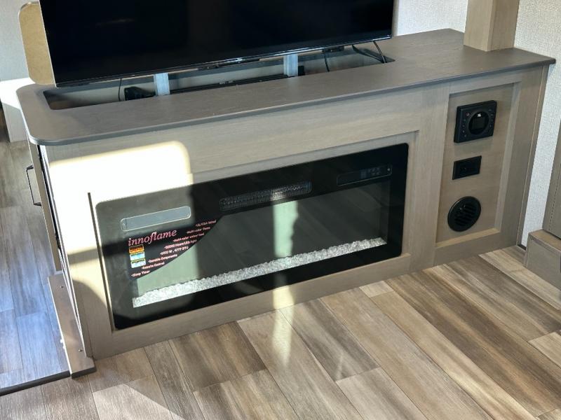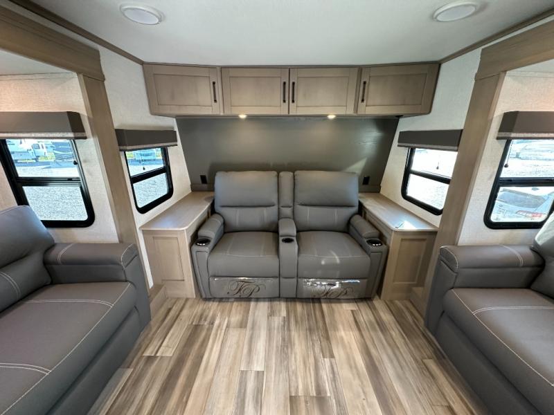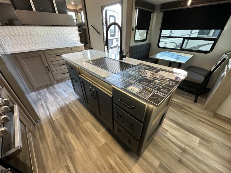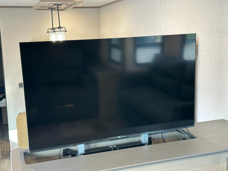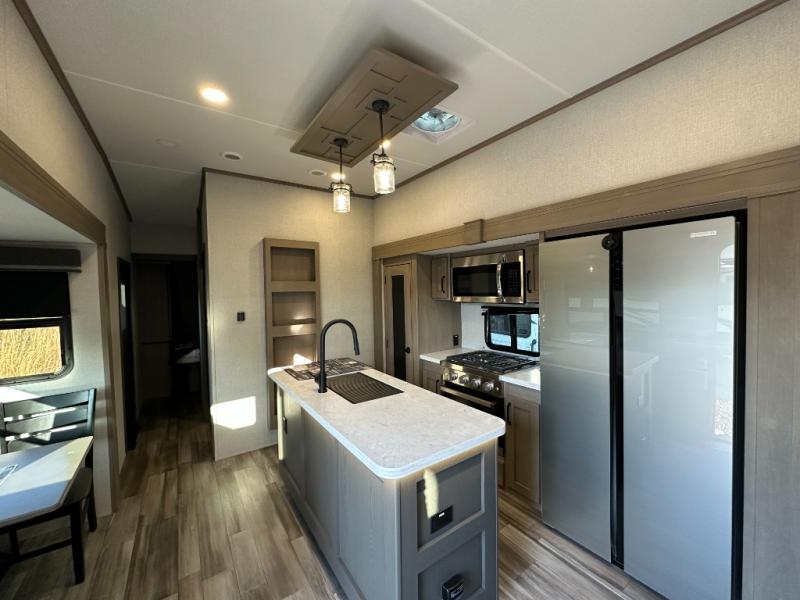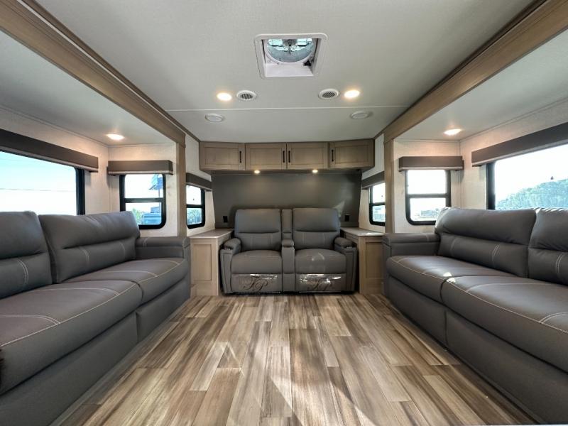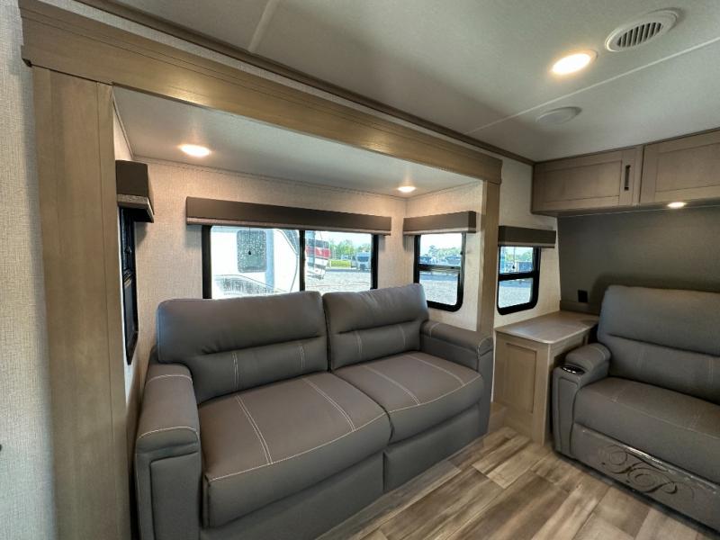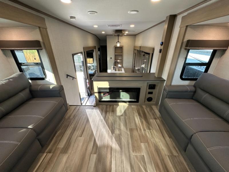 This fifth wheel might be your perfect retreat! The private rear bedroom comes with a standard queen bed, or upgrade to a king for even more room to relax. Up front you'll find a living room perfect for entertaining, with dual tri-fold sofas plus a pair of theater seats. The focal point is the entertainment center which is equipped with a 50" TV on a lift. The central kitchen is well-equipped for cooking, with a 16 cu. ft. refrigerator and a center island. A booth dinette provides great seating, or opt for the swivel dinette.