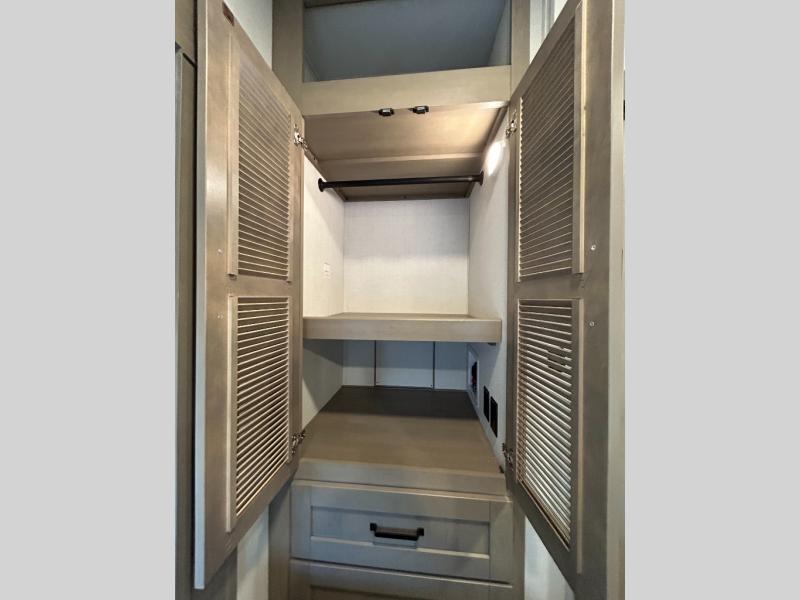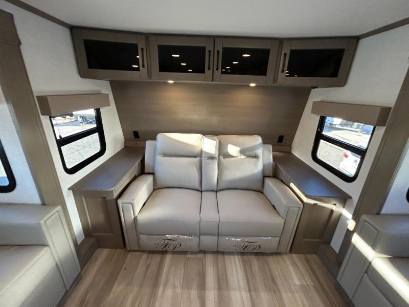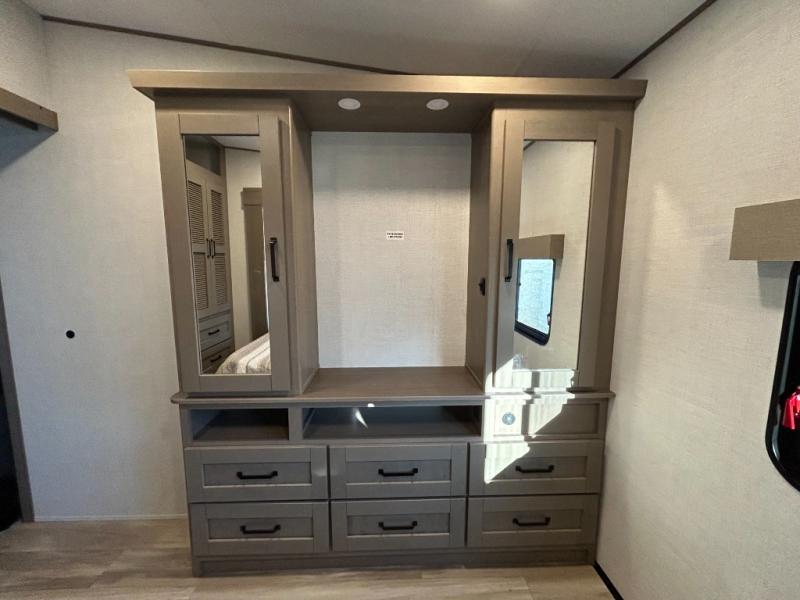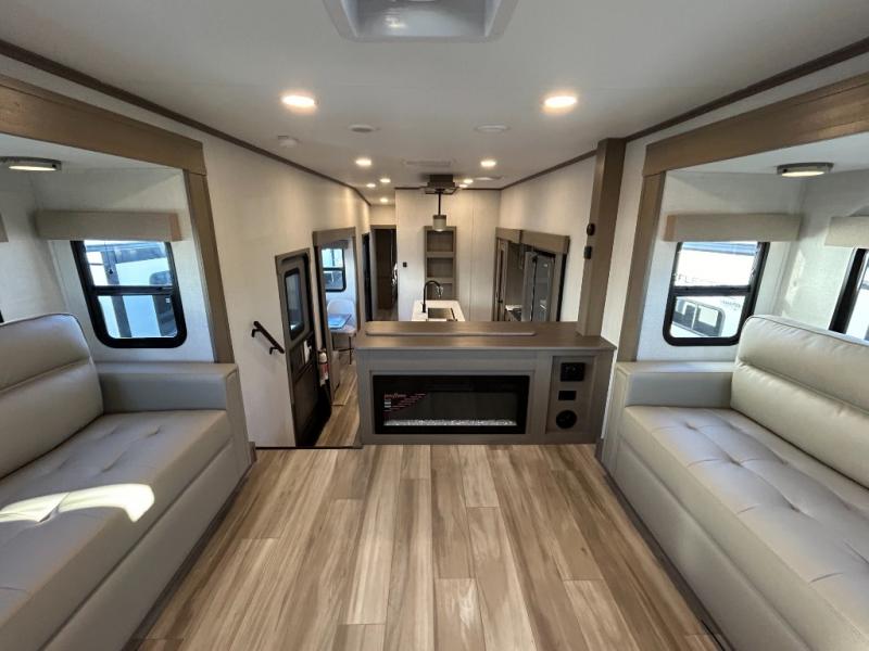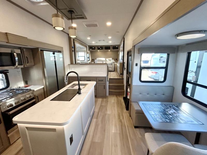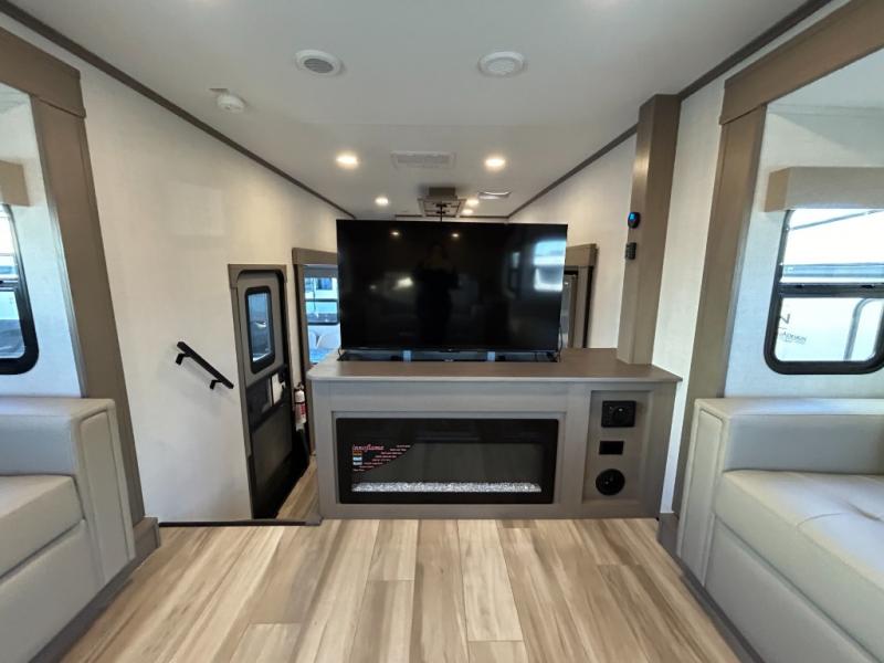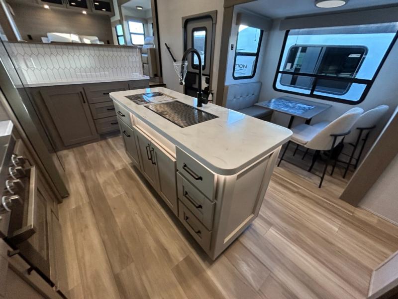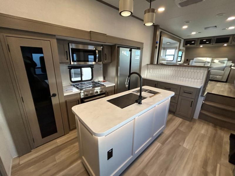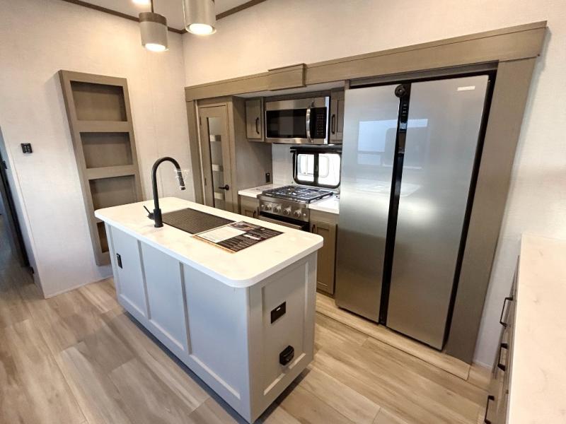 This fifth wheel might be your perfect retreat! The private rear bedroom comes with a standard queen bed, or upgrade to a king for even more room to relax. Up front you'll find a living room perfect for entertaining, with dual tri-fold sofas plus a pair of theater seats. The focal point is the entertainment center which is equipped with a 50" TV on a lift. The central kitchen is well-equipped for cooking, with a 16 cu. ft. refrigerator and a center island. A booth dinette provides great seating, or opt for the swivel dinette.