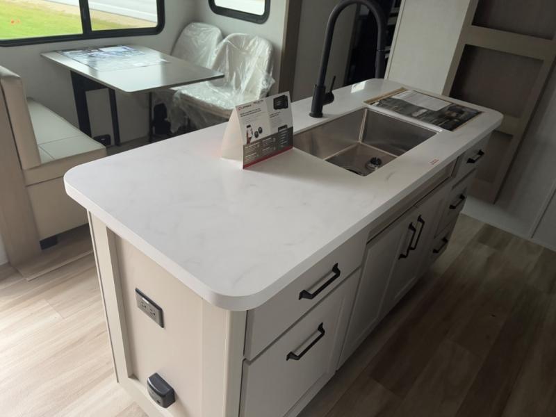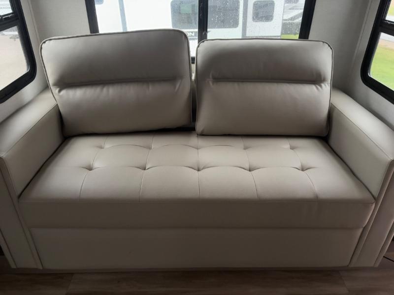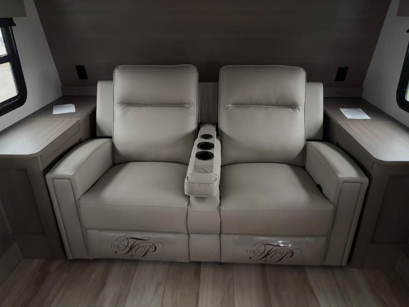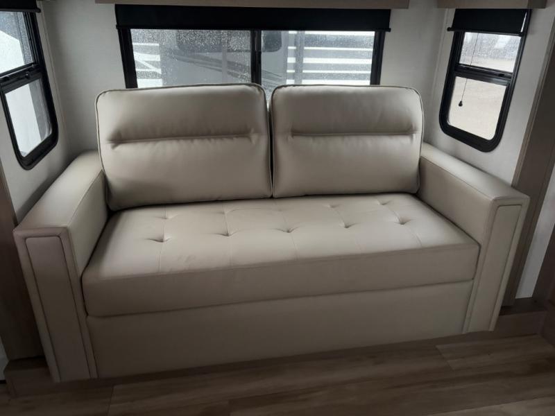 This fifth wheel might be your perfect retreat! The private rear bedroom comes with a standard queen bed, or upgrade to a king for even more room to relax. Up front you'll find a living room perfect for entertaining, with dual tri-fold sofas plus a pair of theater seats. The focal point is the entertainment center which is equipped with a 50" TV on a lift. The central kitchen is well-equipped for cooking, with a 16 cu. ft. refrigerator and a center island. A booth dinette provides great seating, or opt for the swivel dinette.