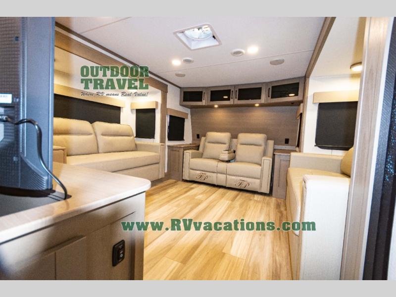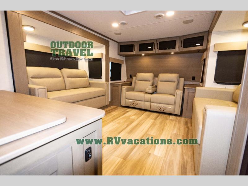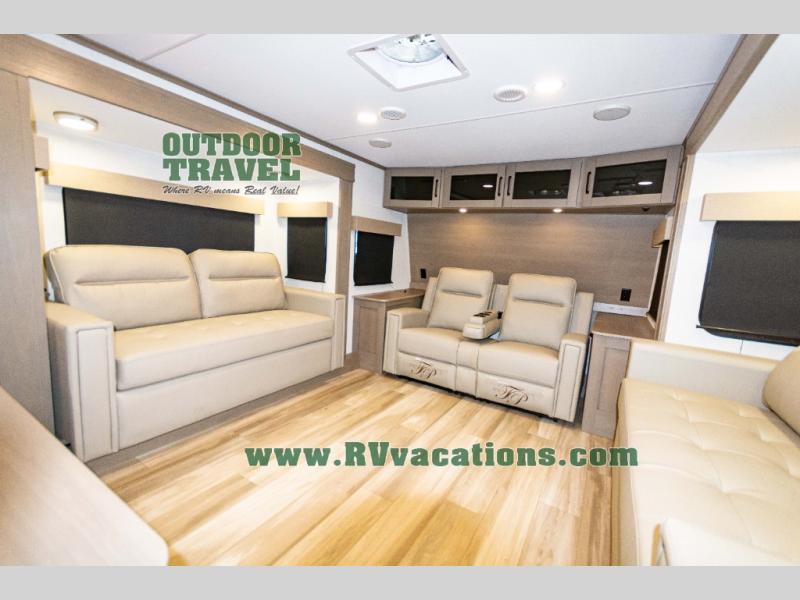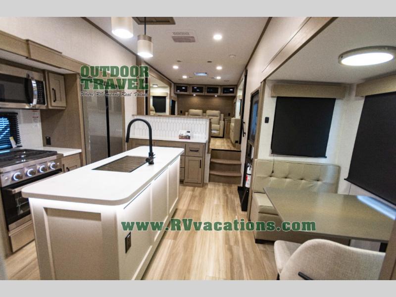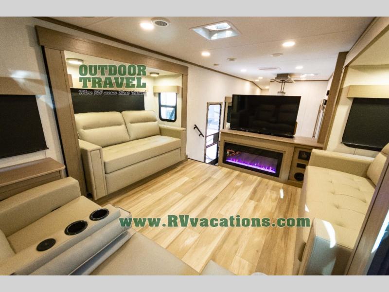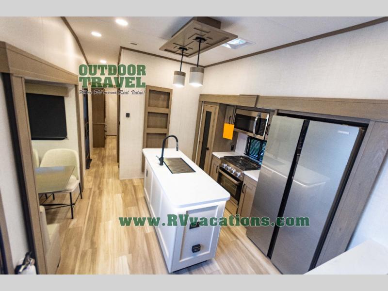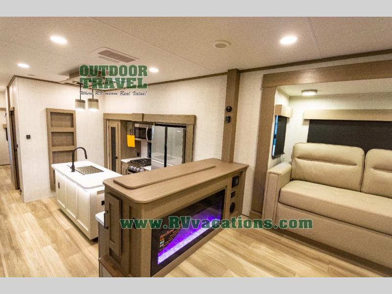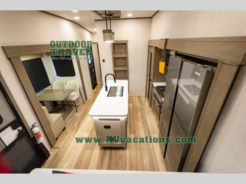 This fifth wheel might be your perfect retreat! The private rear bedroom comes with a standard queen bed, or upgrade to a king for even more room to relax. Up front you'll find a living room perfect for entertaining, with dual tri-fold sofas plus a pair of theater seats. The focal point is the entertainment center which is equipped with a 50" TV on a lift. The central kitchen is well-equipped for cooking, with a 16 cu. ft. refrigerator and a center island. A booth dinette provides great seating, or opt for the swivel dinette.