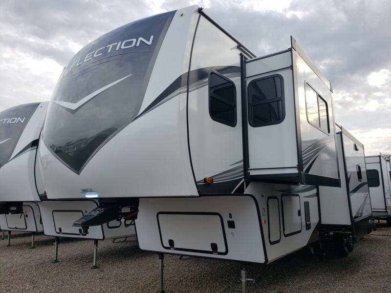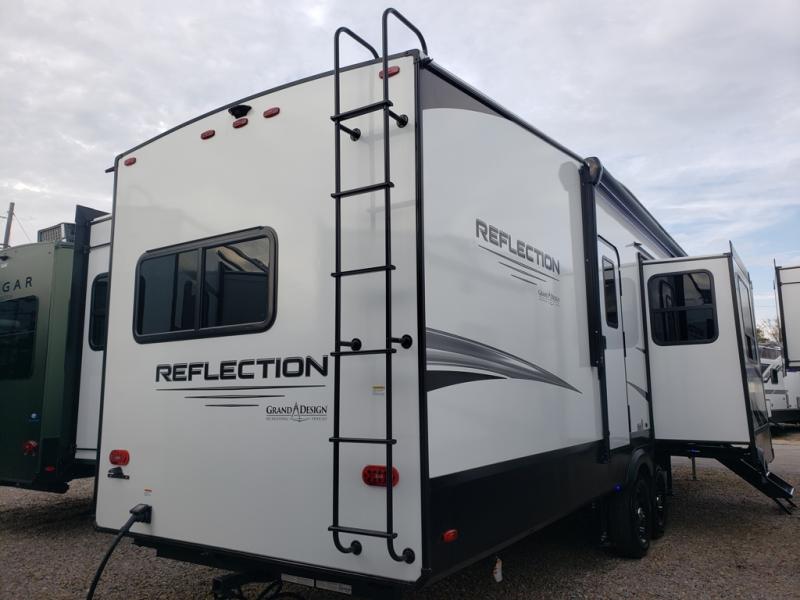 With any Reflection fifth wheel by Grand Design, you will have a solar panel for off-grid camping and a 60 amp charge controller and inverter prep, a Universal All-In-One docking station, unobstructed pass-through storage, and Goodyear Endurance tires. Each is constructed of gel coat exterior sidewalls, residential 5" truss rafters, walk-on roof decking, a fiberglass and radiant foil roof and front cap insulation plus laminated aluminum framed side walls, roof and end walls in slide rooms. Head inside to enjoy residential hardwood cabinet doors, premium Congoleum flooring, a spacious shower with a glass door, and many more comforts!
