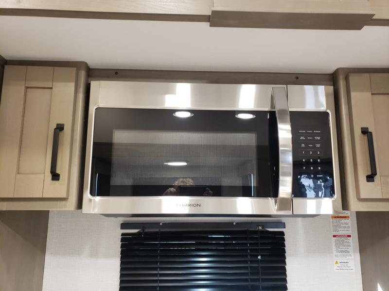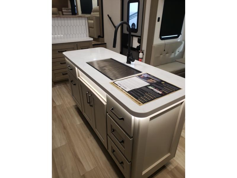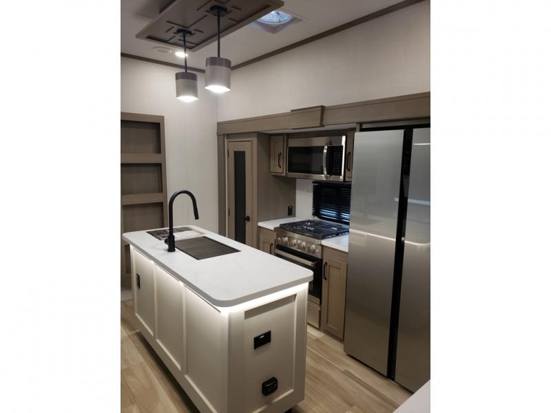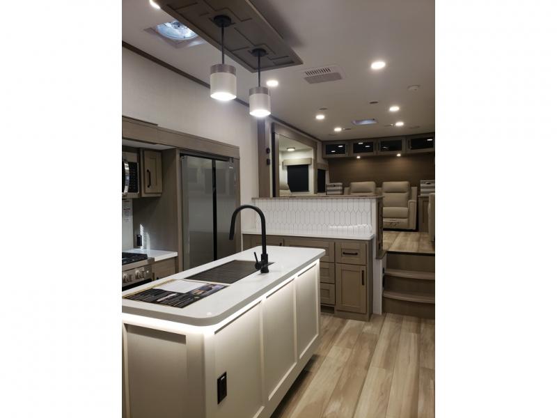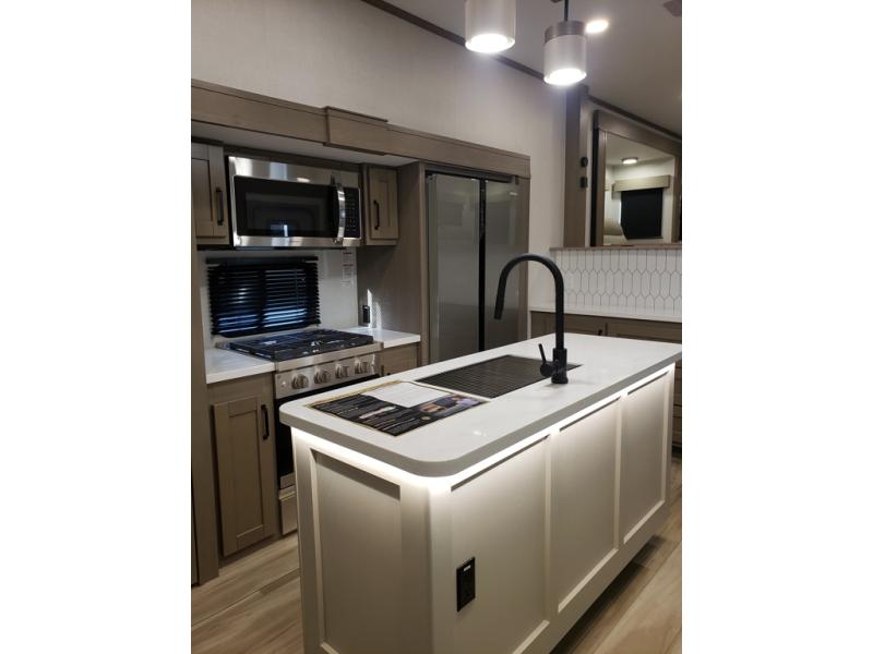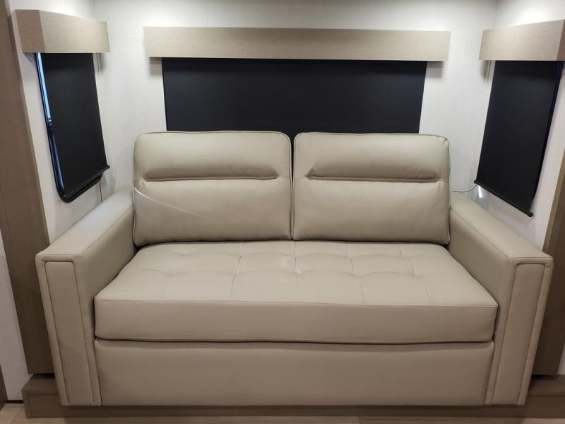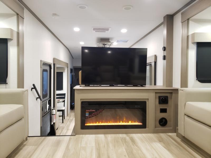 This fifth wheel might be your perfect retreat! The private rear bedroom comes with a standard queen bed, or upgrade to a king for even more room to relax. Up front you'll find a living room perfect for entertaining, with dual tri-fold sofas plus a pair of theater seats. The focal point is the entertainment center which is equipped with a 50" TV on a lift. The central kitchen is well-equipped for cooking, with a 16 cu. ft. refrigerator and a center island. A booth dinette provides great seating, or opt for the swivel dinette.
