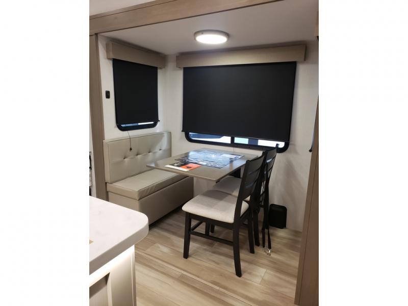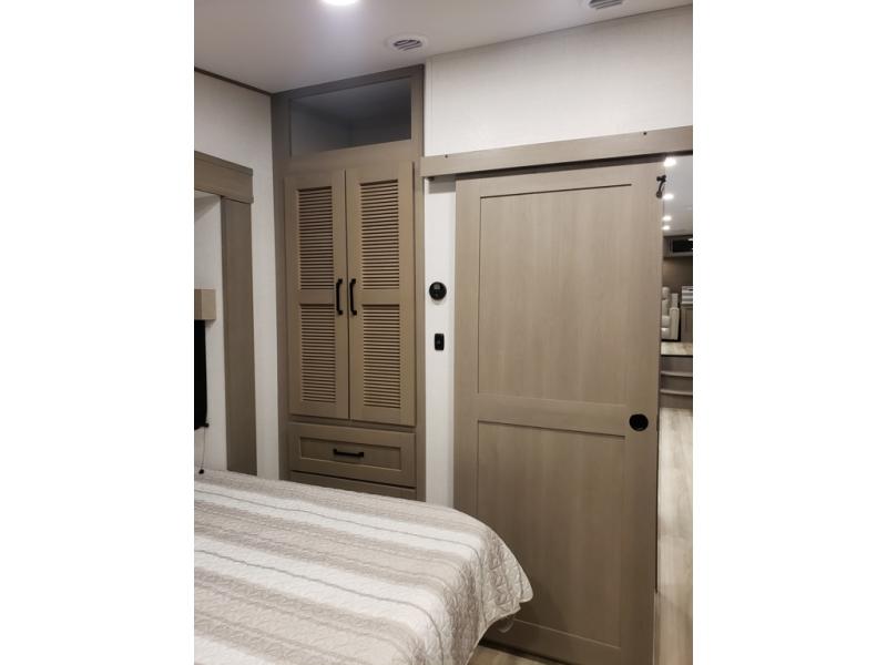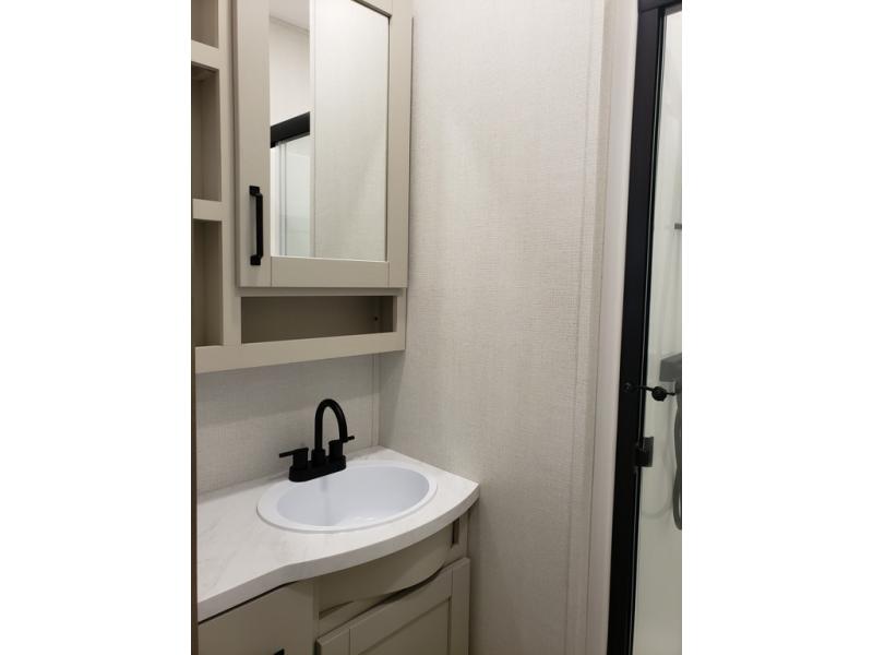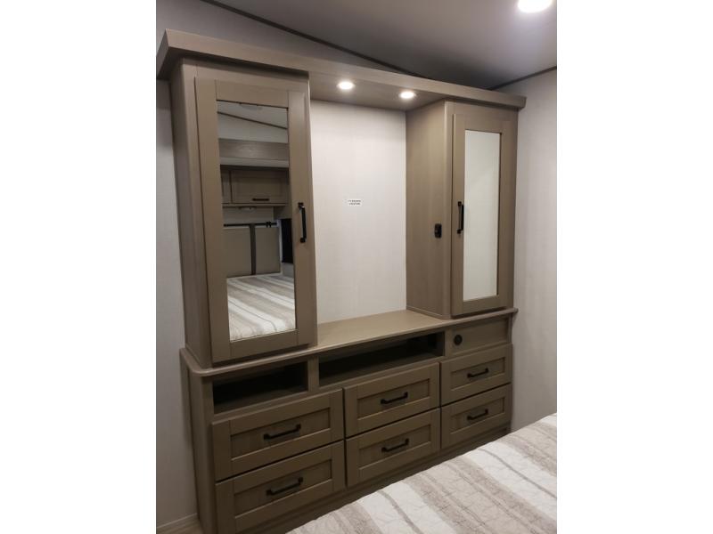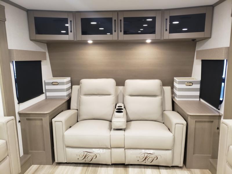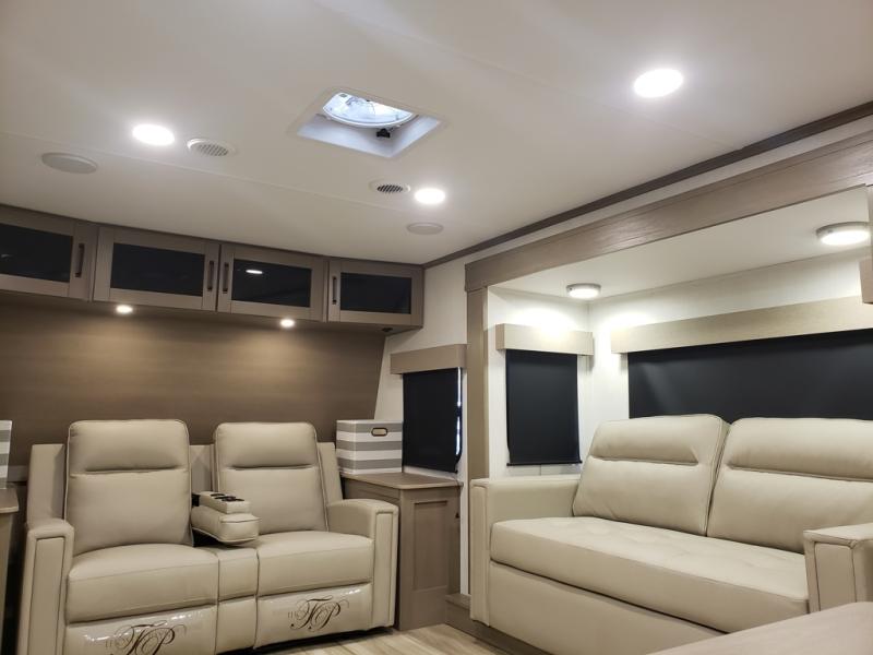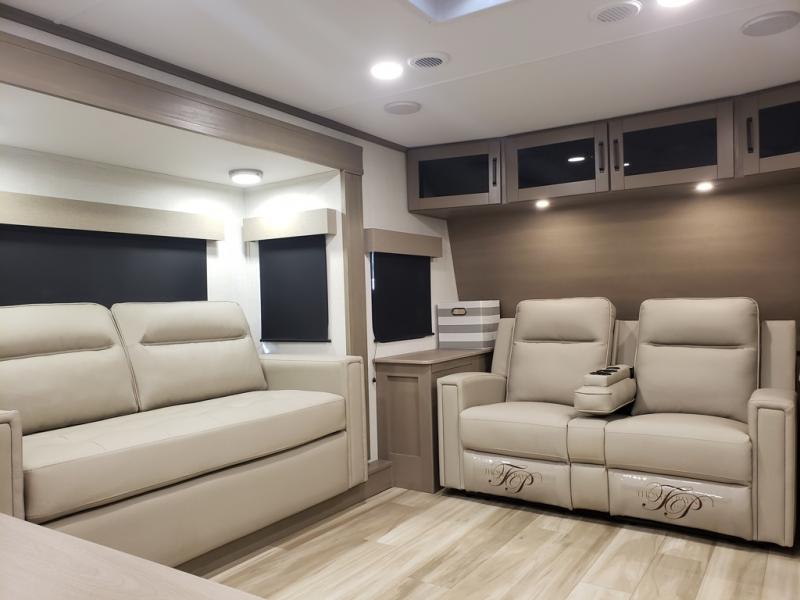 This fifth wheel might be your perfect retreat! The private rear bedroom comes with a standard queen bed, or upgrade to a king for even more room to relax. Up front you'll find a living room perfect for entertaining, with dual tri-fold sofas plus a pair of theater seats. The focal point is the entertainment center which is equipped with a 50" TV on a lift. The central kitchen is well-equipped for cooking, with a 16 cu. ft. refrigerator and a center island. A booth dinette provides great seating, or opt for the swivel dinette.